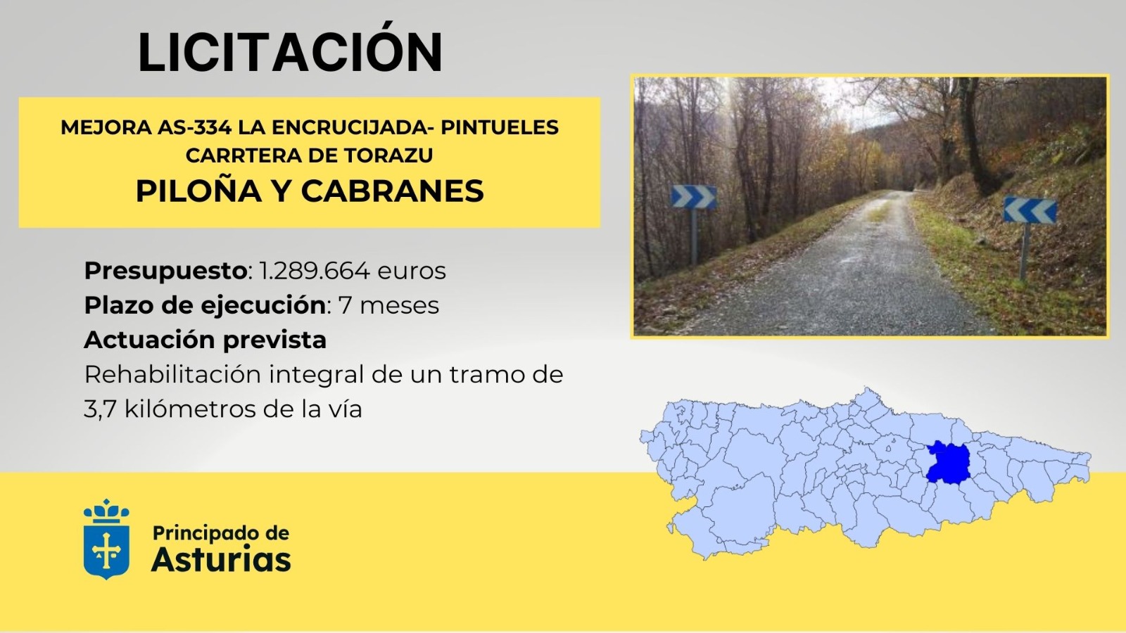 El Gobierno de Asturias destina 1.289.664 euros a la reparación de un tramo de la AS-334 (La Curciada-Pintueles), también conocida como la carretera de Torazu, en Piloña y Cabranes. Las obras afectarán a 3,7 kilómetros del vial, ubicados entre los puntos kilométricos 5+935 y 9+694.