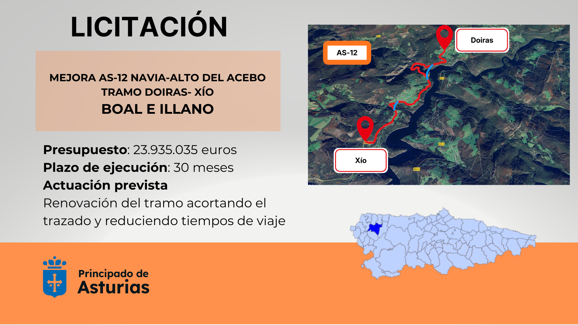 El Gobierno de Asturias invertirá más de 24,5 millones en la renovación del tramo del corredor del Navia que une las localidades de Doiras (Boal) y Xío (Illano). La Consejería de Movilidad, Medio Ambiente y Gestión de Emergencias ha licitado las obras con un presupuesto de 23.935.035 euros y un plazo de ejecución de 30 meses. A esta cantidad se suma también la destinada a la dirección de obra, que ya ha salido a concurso por 673.227 euros.