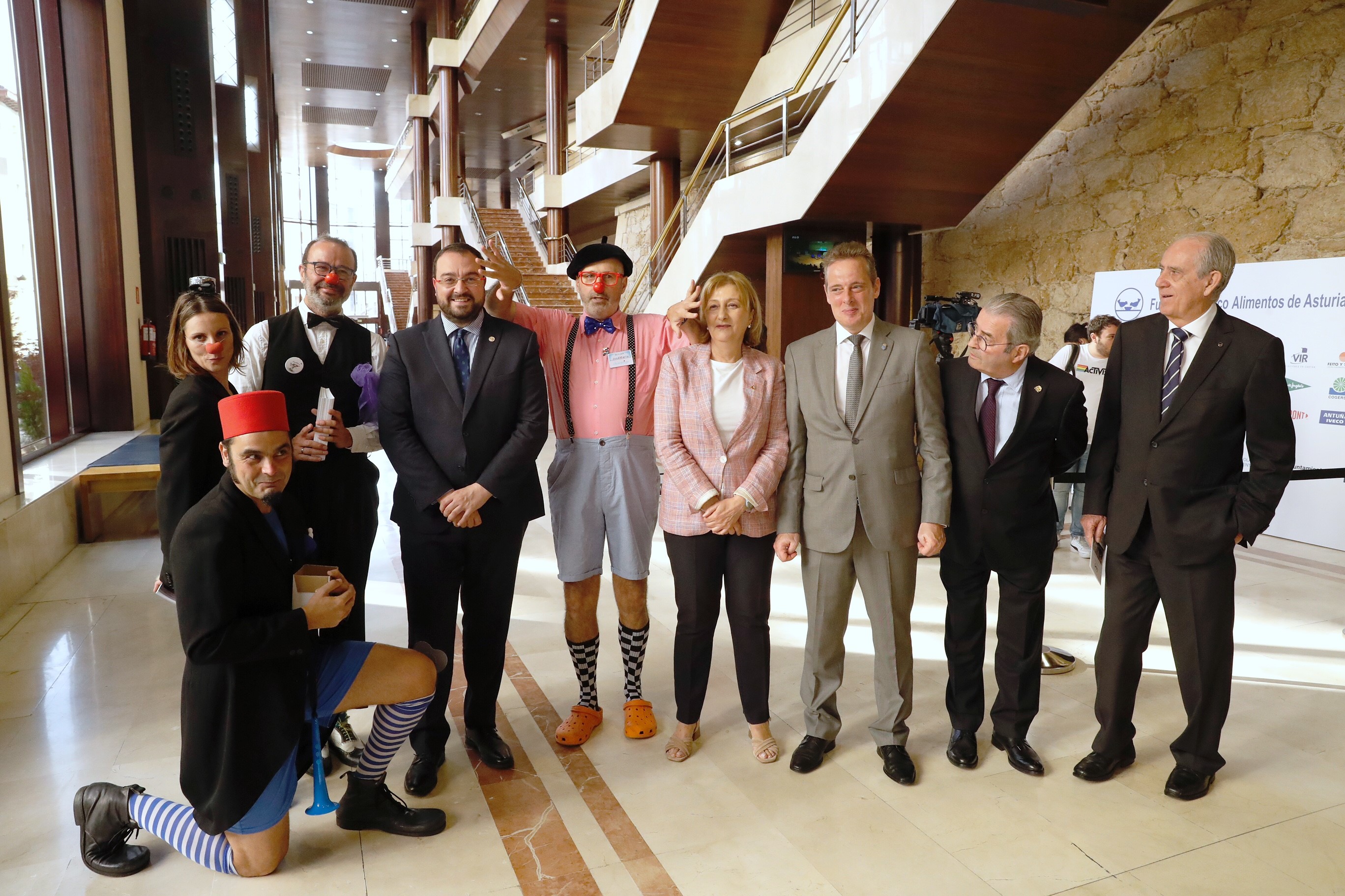 El presidente del Principado, Adrián Barbón; la delegada del Gobierno, Delia Losa; el presidente de la Junta General, Marcelino Marcos Líndez; el presidente del Banco de Alimentos de Asturias, Bernardo Sopeña, y el presidente de la Federación Española de Bancos de Alimentos, Pedro Llorca, con varios miembros de la ONG Clowntigo Payasos de Hospital (de izqda. a dcha.)