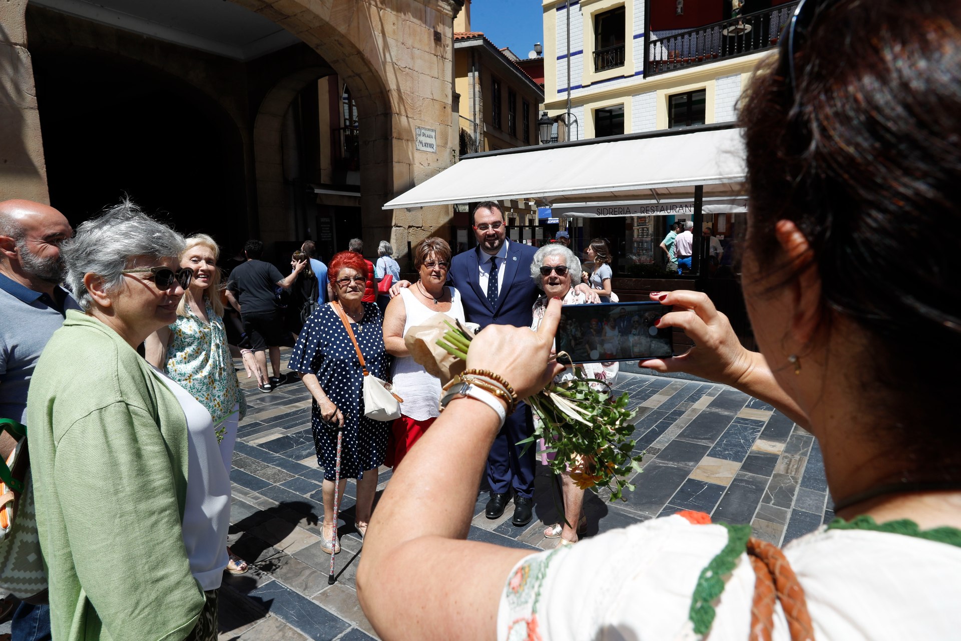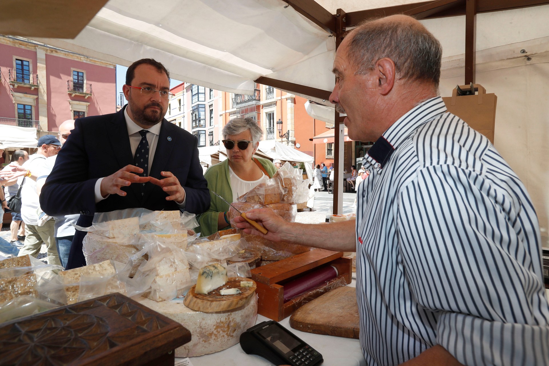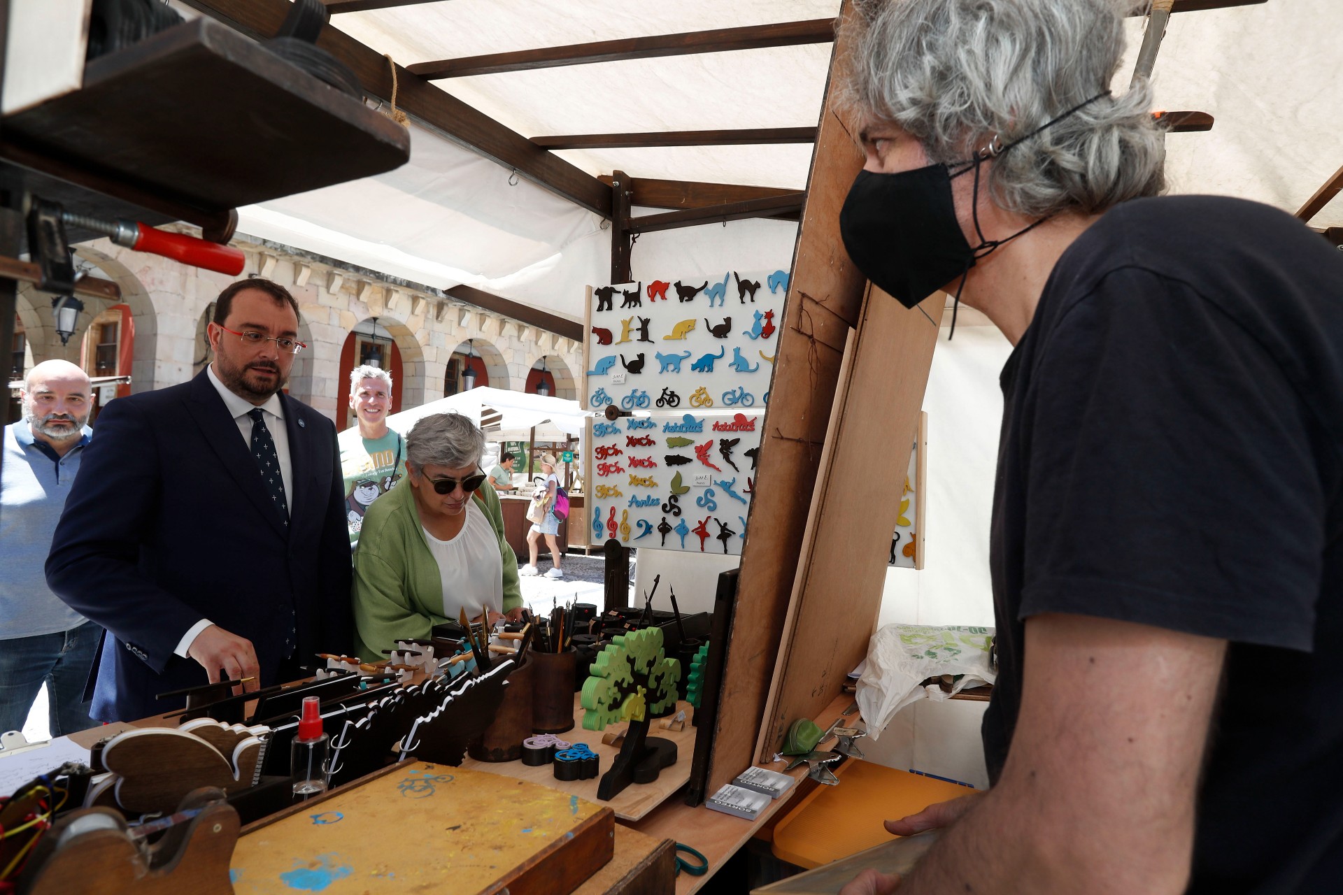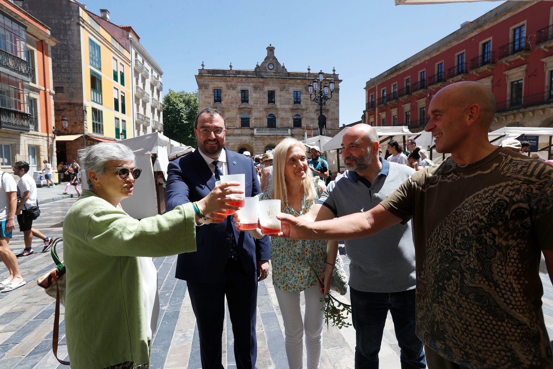La alcaldesa de Gijón, Ana González; el presidente del Principado de Asturias, Adrián Barbón; la concejala de Turismo, Salomé Díaz Toral; el concejal de Mercados, Santos Tejón y el presidente del mercado artesano y ecológico, Javier Ruiz ( de izquierda a derecha)