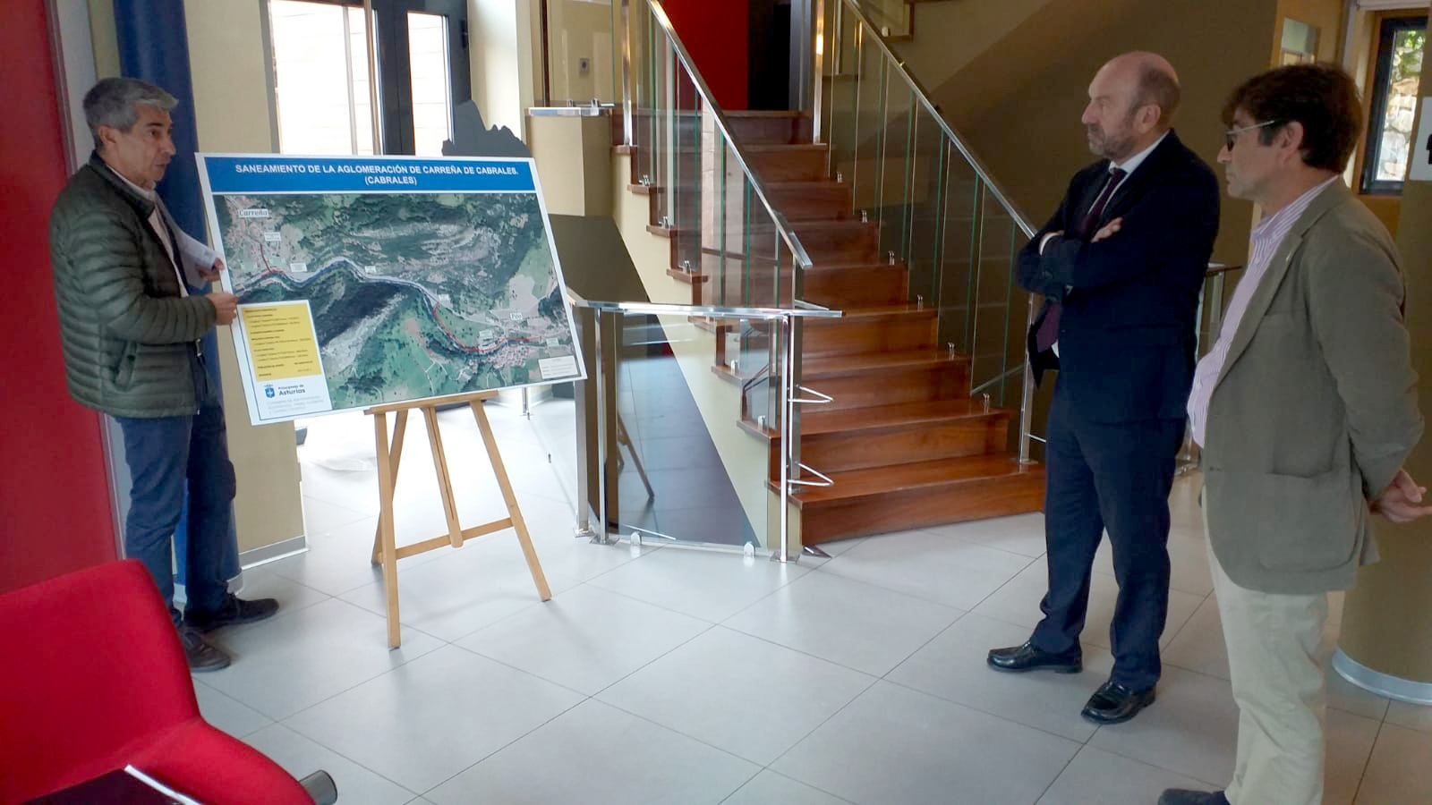 El gerente de Tragsa en Asturias, Joaquín Moya; la diputada del PSOE en la Junta General, Gimena Llamedo; el vicepresidente y consejero de Medio Ambiente y Cambio Climático, Juan Cofiño; el alcalde de Cabrales, José Sánchez, y la directora general de Agua, Vanesa Mateo (de izqda. a dcha).