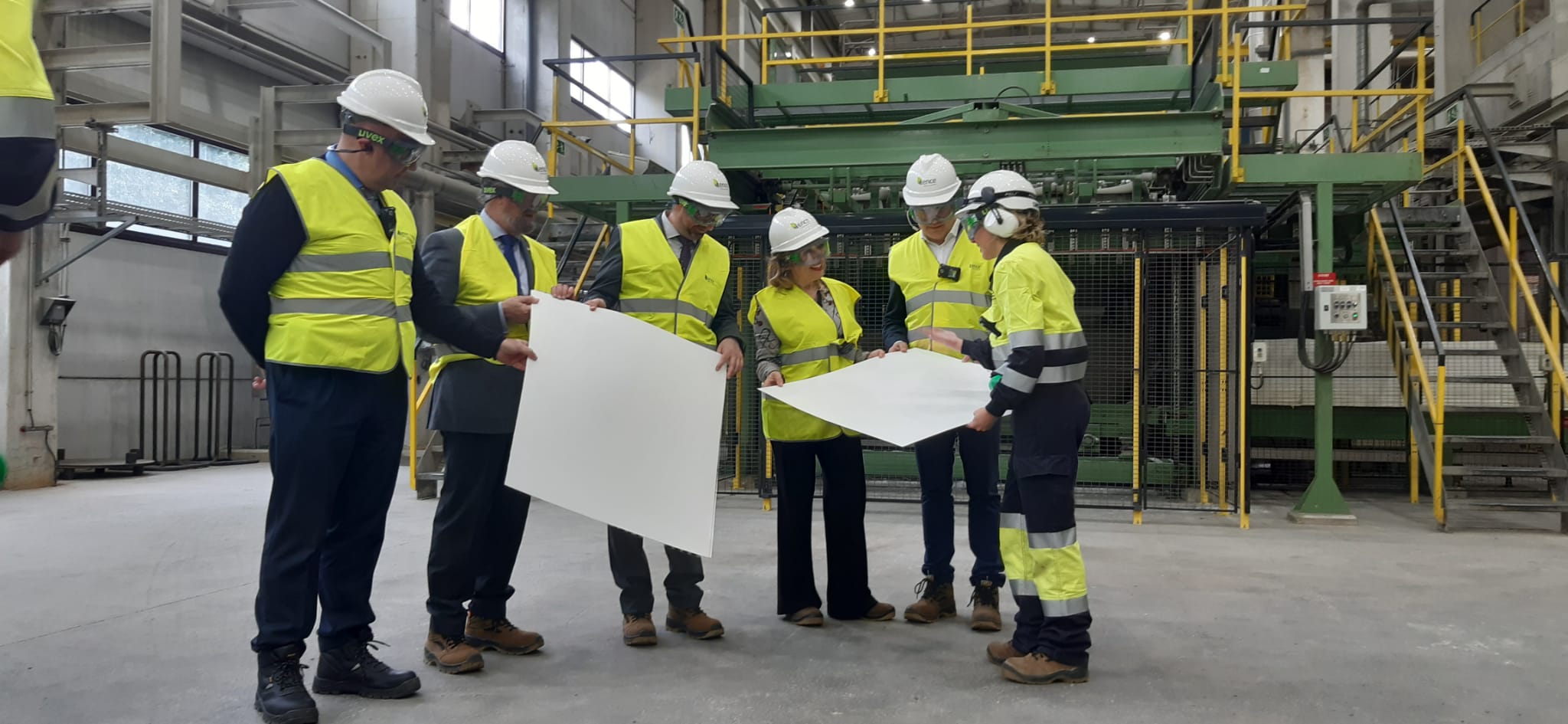 De izquierda a derecha en la imagen, Juan Carlos Aguilera, director general de Industria; Ignacio García Palacios, alcalde de Navia; María Luz Sánchez, directora de la biofábrica de Navia; Enrique Fernández, consejero de Industria; Gonzalo Asenjo, teniente de alcalde de Navia; Belarmina Díaz, directora general de Energía, Minería y Reactivación; Inés Díaz, responsable de Relaciones Institucionales de Ence, y Marcos Pérez, director de celulosa de la biofábrica.