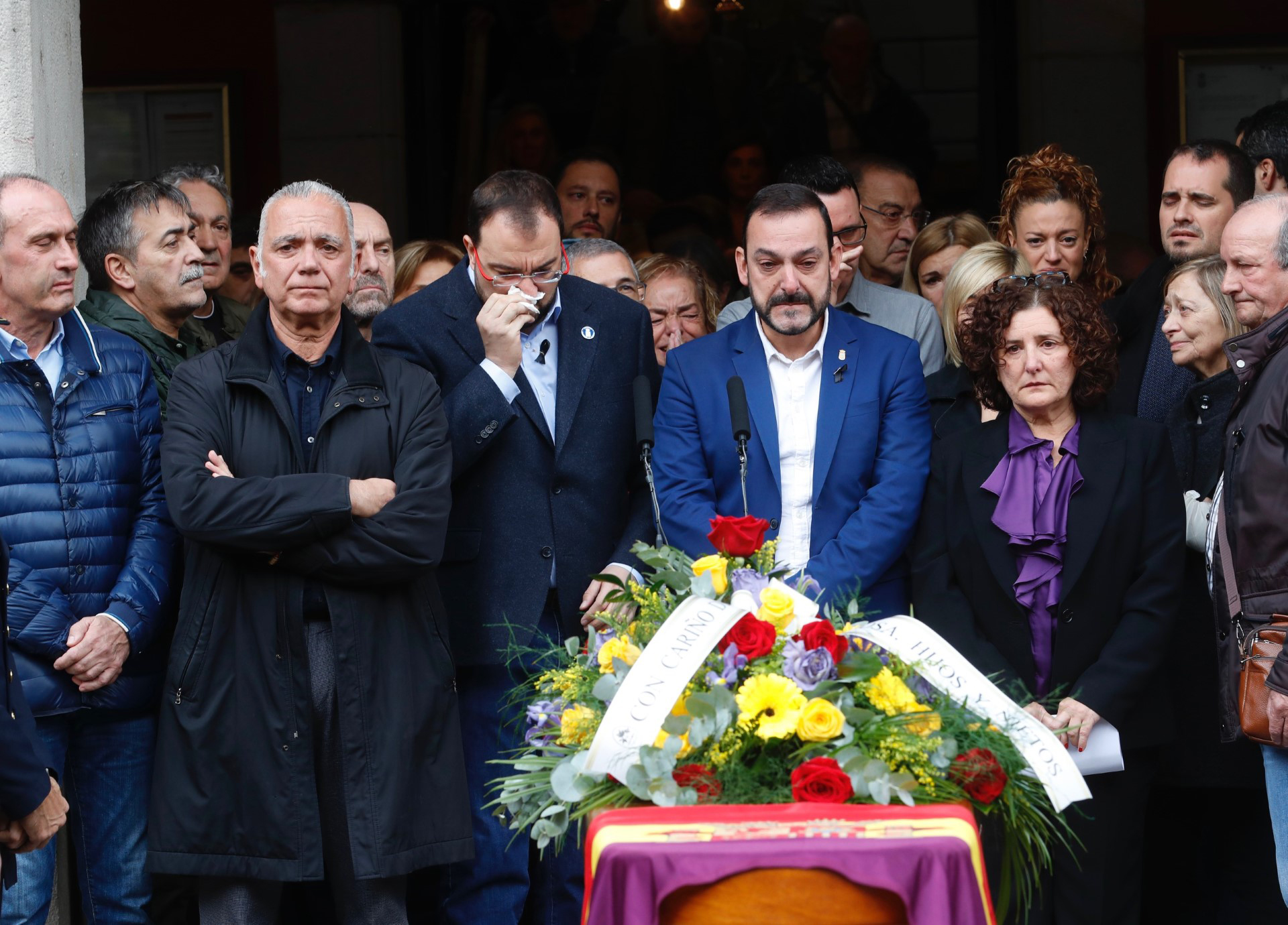 De izquierda a derecha, el periodista Juan Ramón Lucas, el presidente del Principado de Asturias, Adrián Barbón, el vicealcalde de Mieres, Manuel Ángel Álvarez, y la coordinadora de IU en Mieres y viceconsejera de Derechos Ciudadanos, Beatriz González.