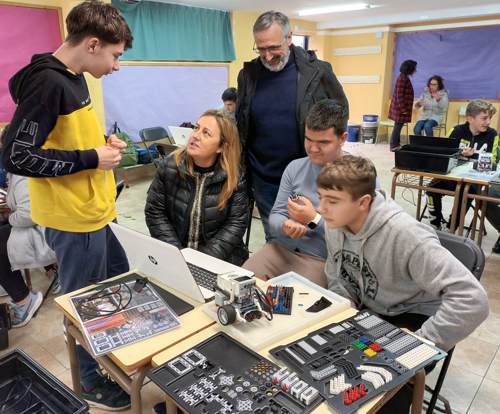 La consejera Lydia Espina y el director del CPEB Cabañaquinta, Jesús Francisco Irurtia, conversan con el alumnado durante una actividad de robótica.