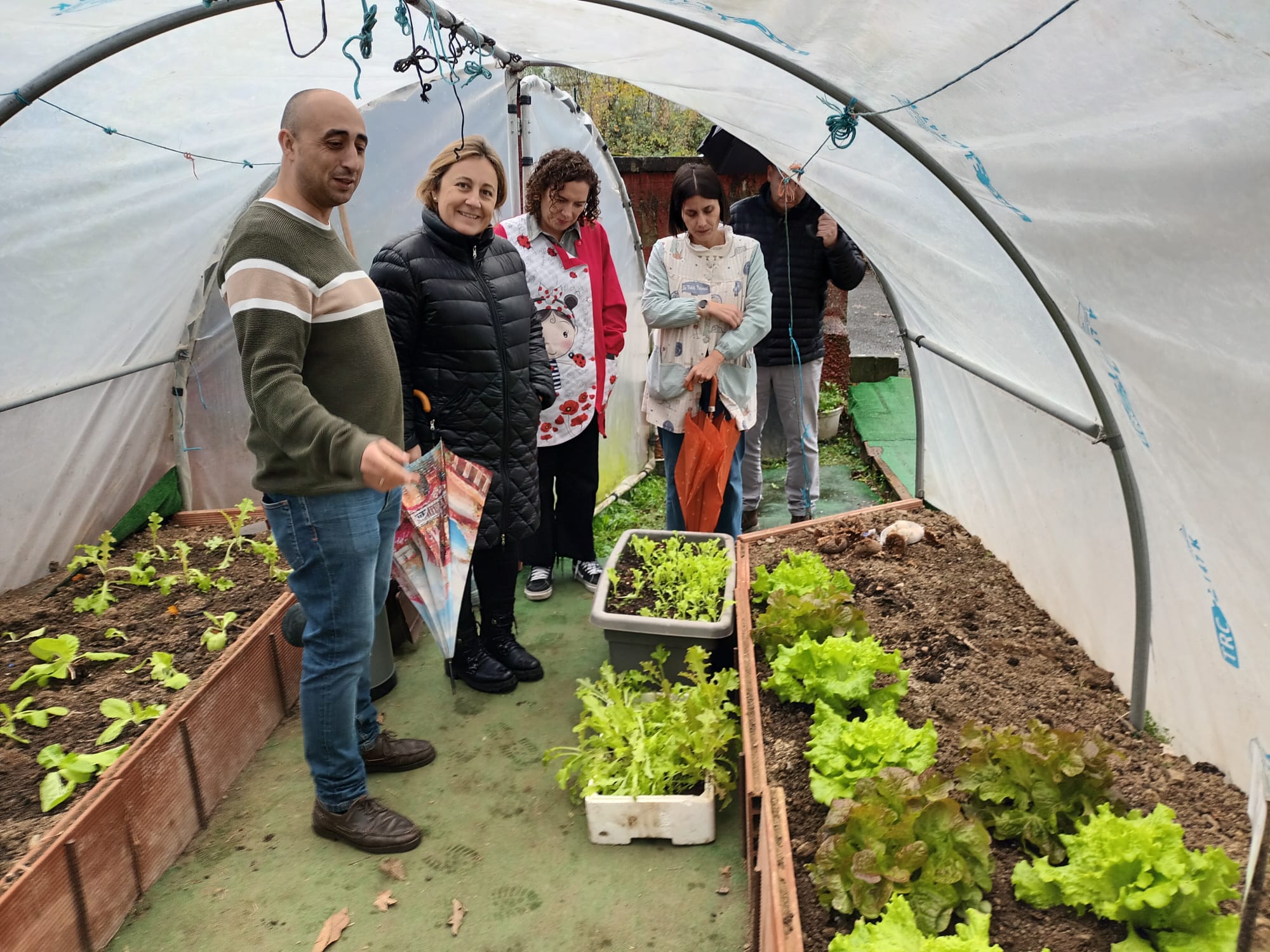 La consejera de Educación, Lydia Espina, acompañada por el director del CRA Maestro José Antonio Robles, Francisco Manuel García, visita el huerto ecológico del centro.