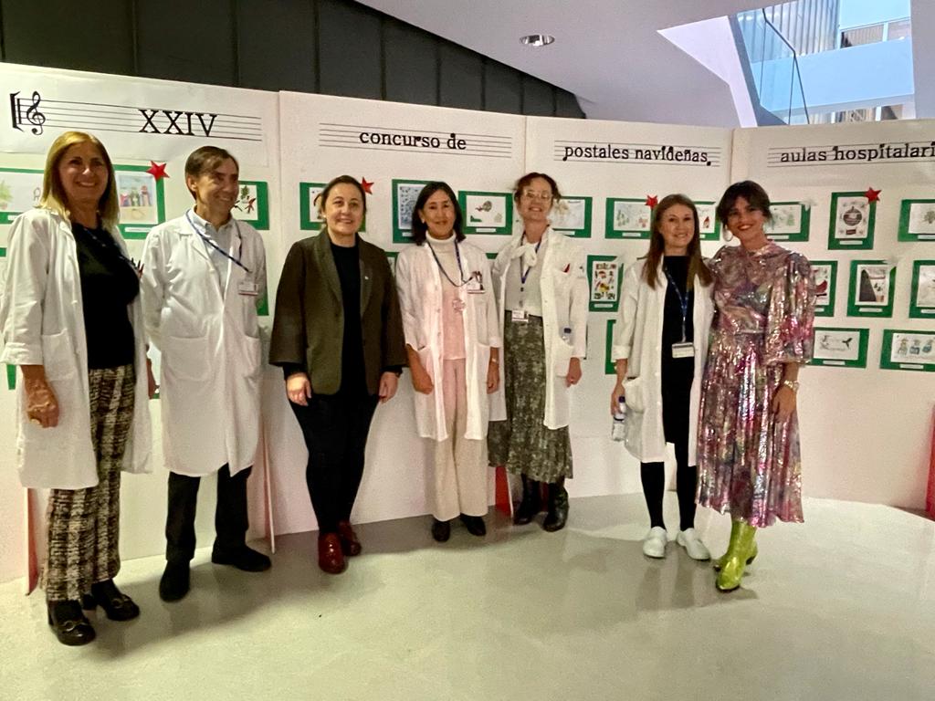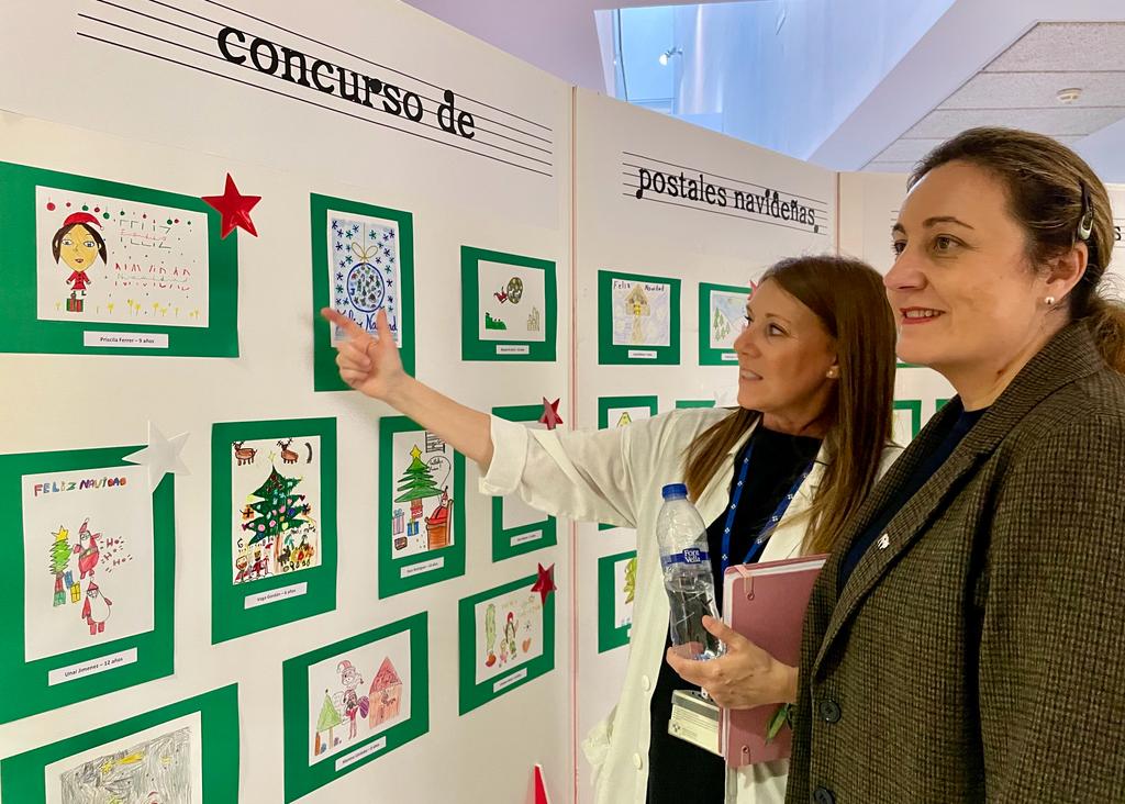 La consejera de Educación, Lydia Espina, visita la exposición de postales navideñas junto a la coordinadora de las Aulas Hospitalarias, Sonia Pilar.