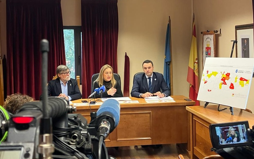 De izquierda a derecha en la imagen, el alcalde de Illas, Alberto Tirador; la consejera de Educación, Lydia Espina, y el consejero de Hacienda y Fondos Europeos, Guillermo Peláez.