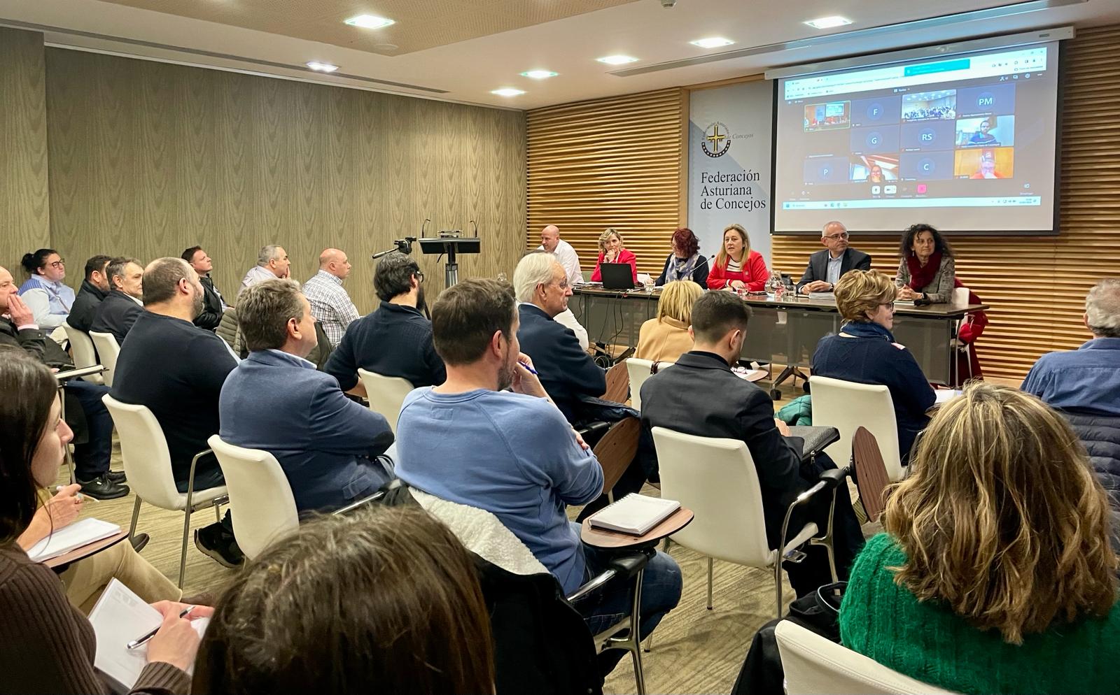 La consejera de Educación, Lydia Espina, durante la reunión que ha mantenido con alcaldes y alcaldesas y otros representantes municipales en la sede de la Federación Asturiana de Concejos.