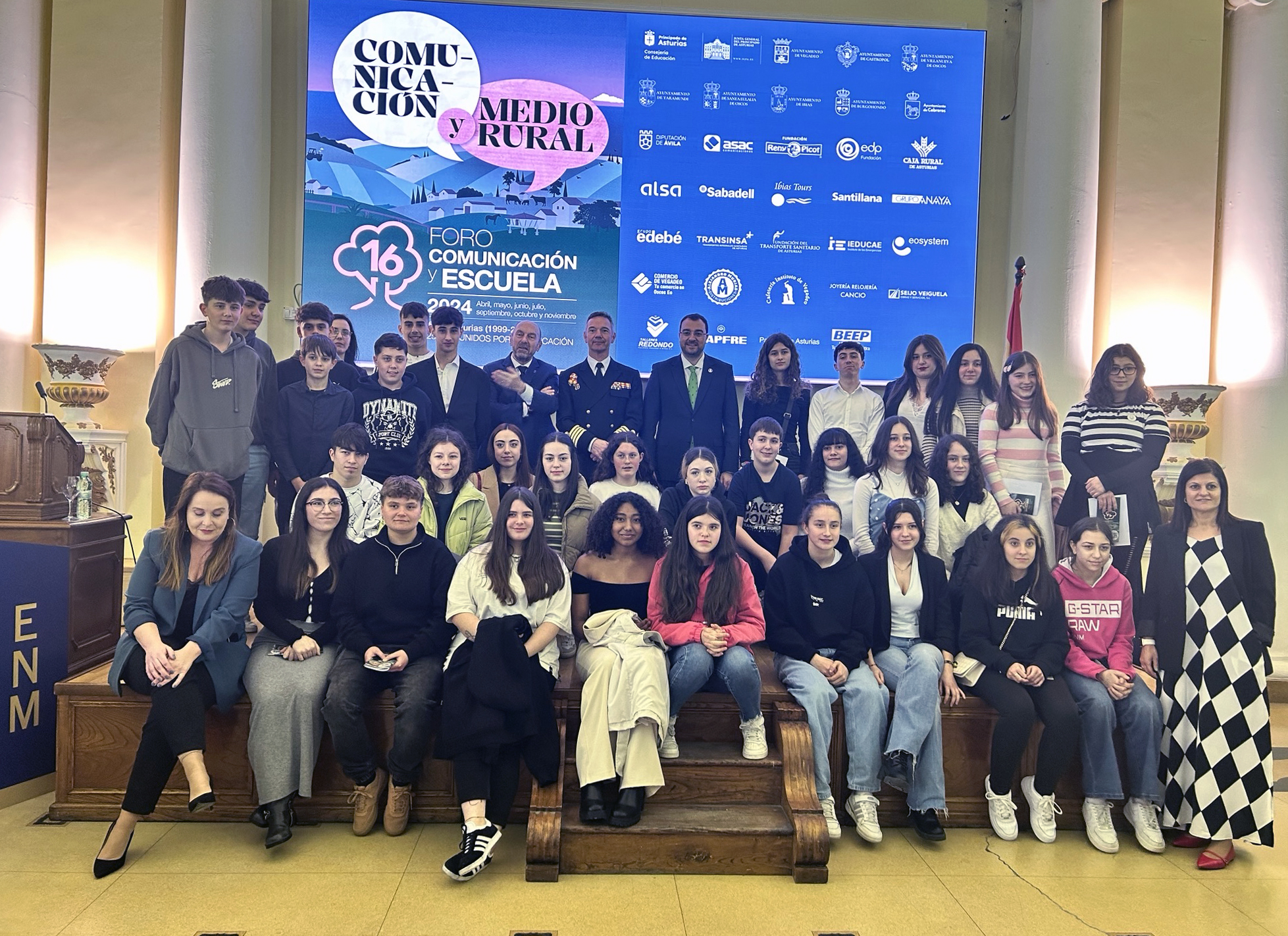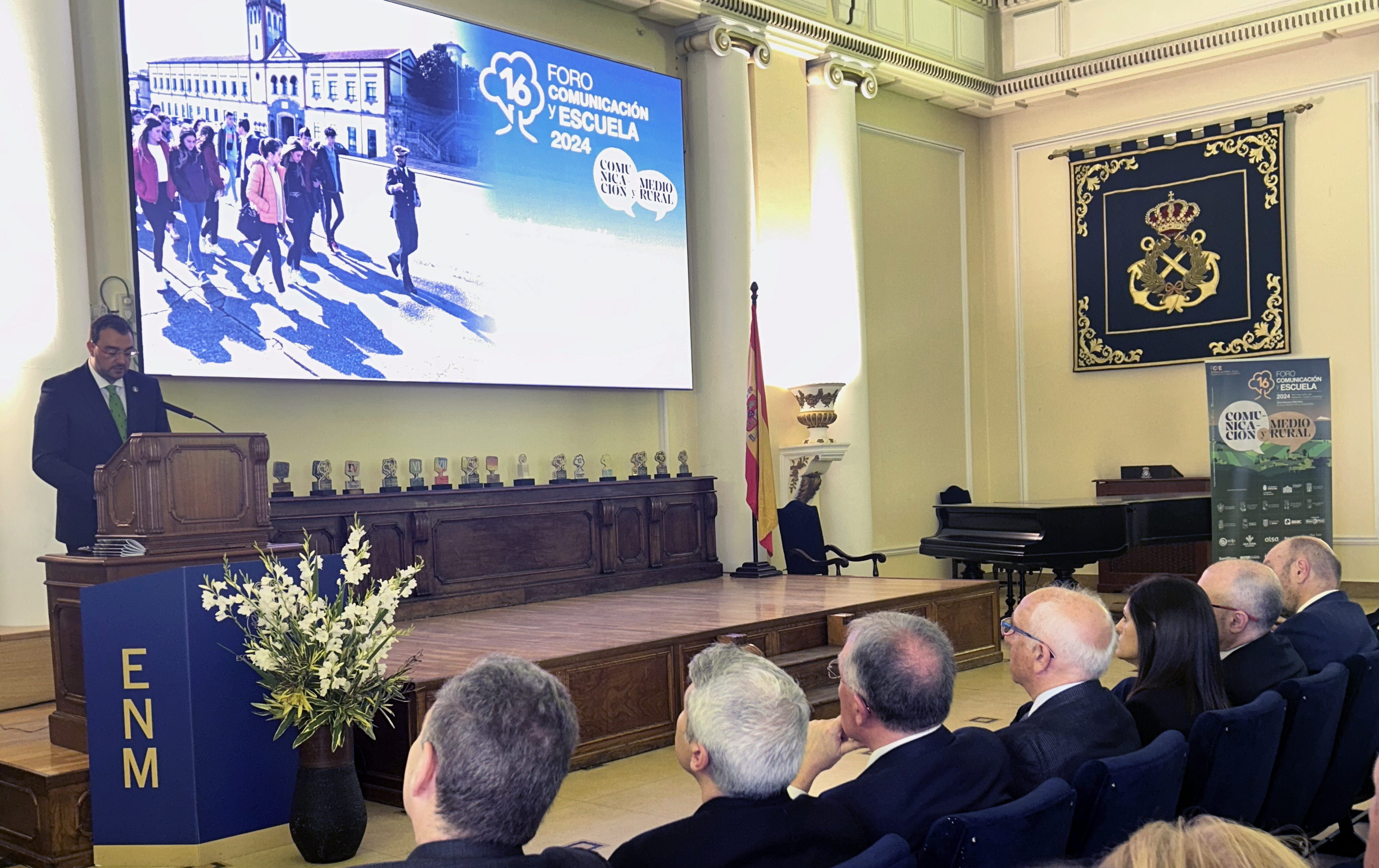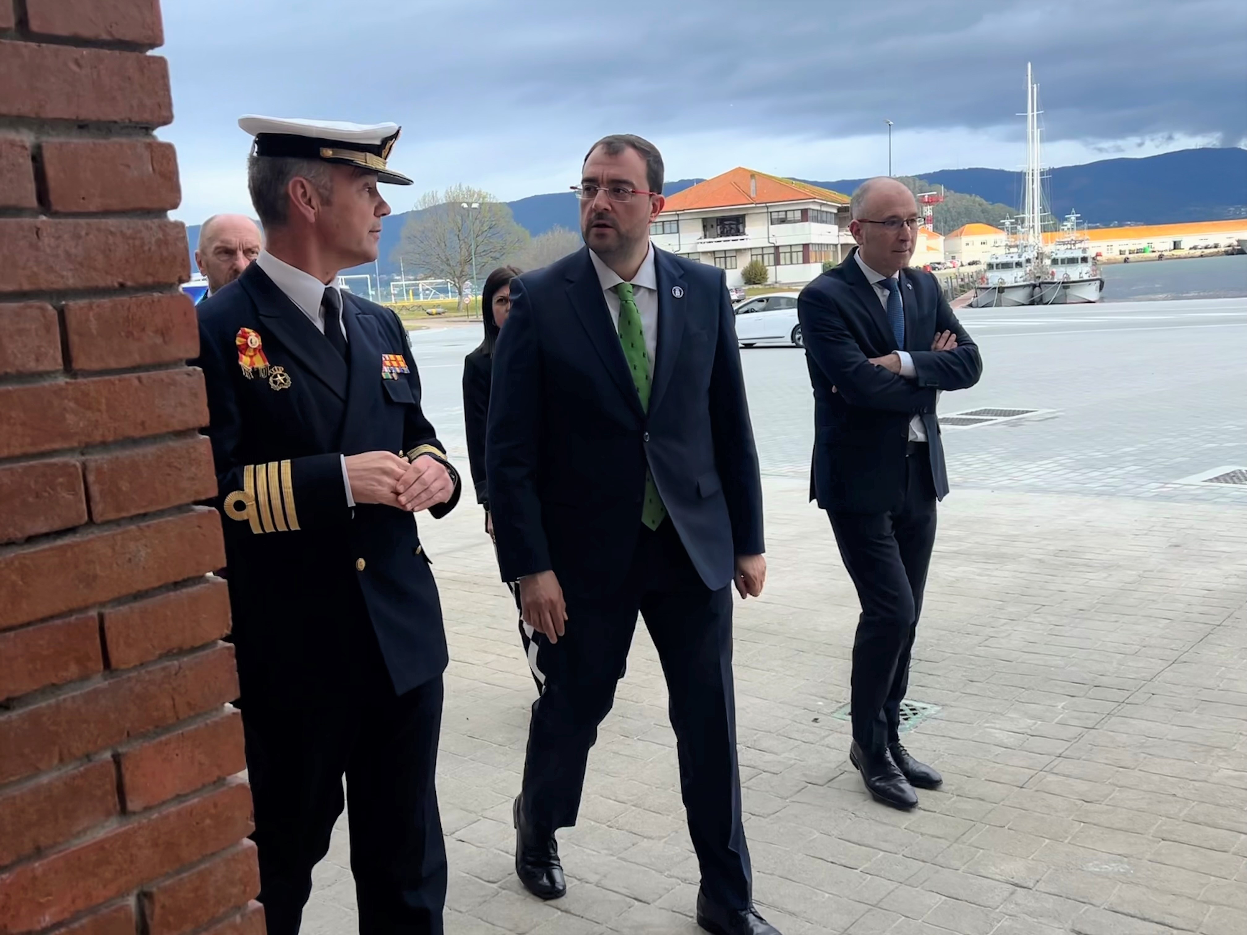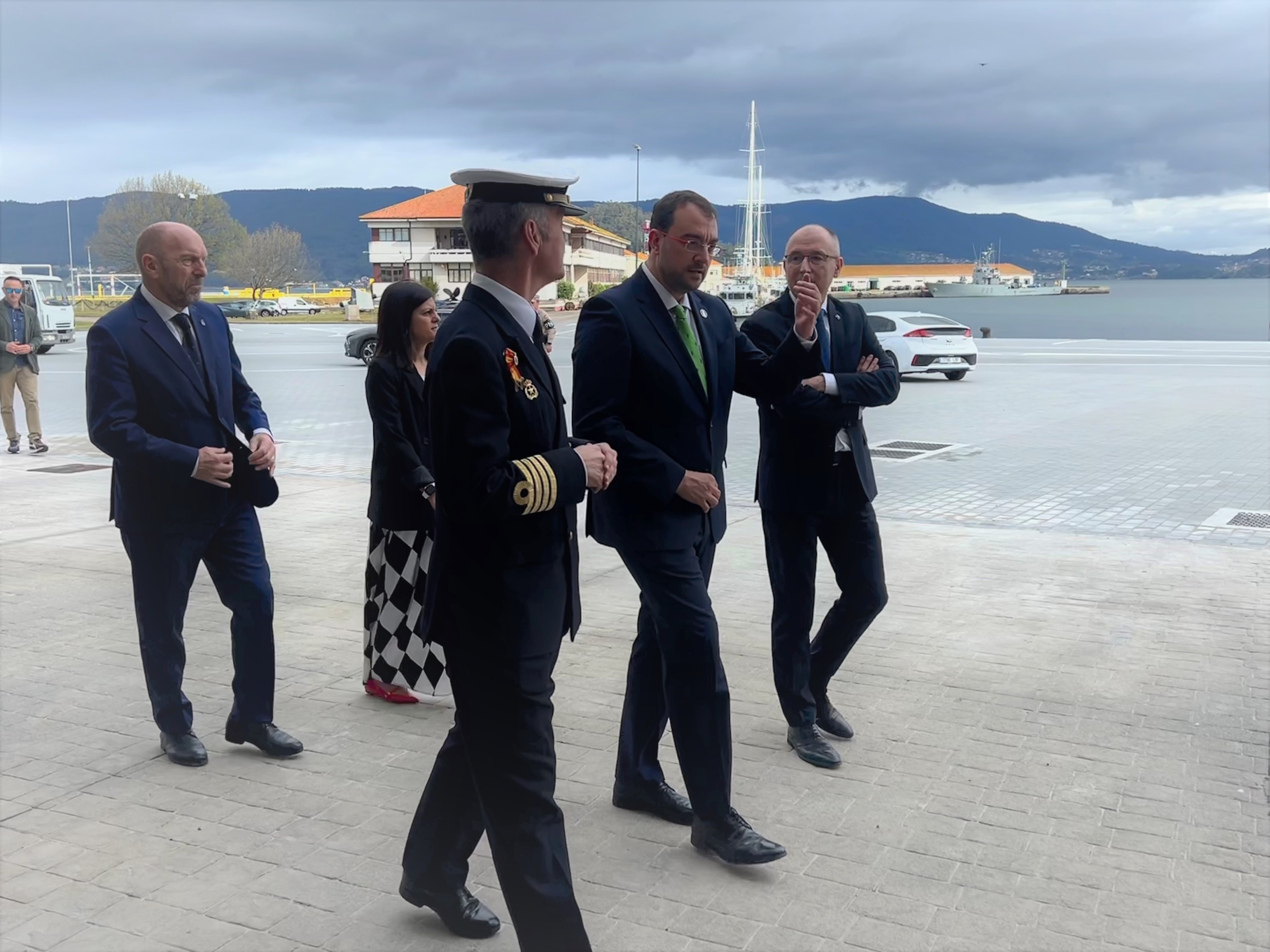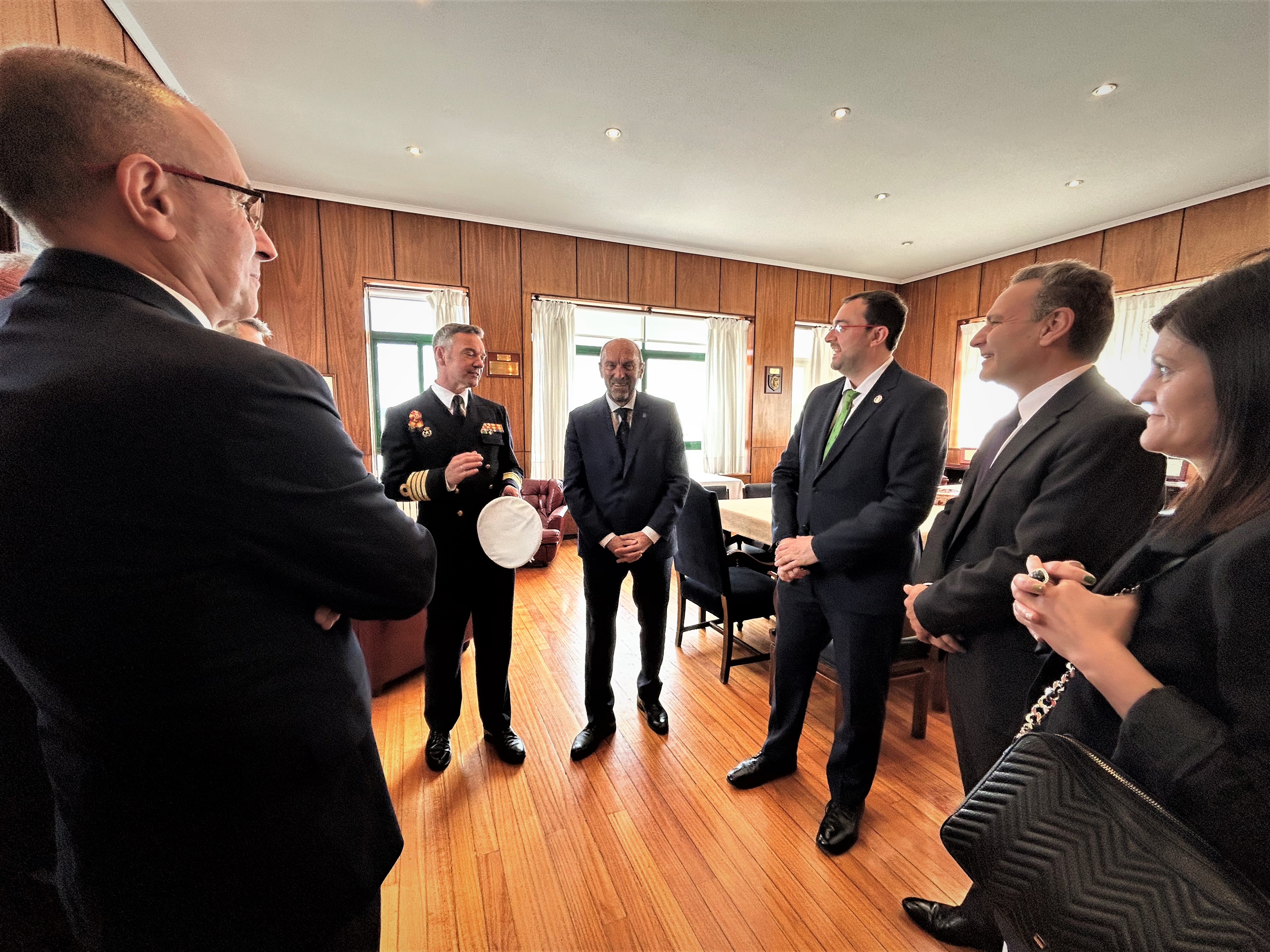 En la imagen, en primera fila y de izquierda a derecha, el comandante-director de la Escuela Naval Militar de Marín, Pedro Cardona; el presidente del Principado, Adrián Barbón, y el coordinador del Foro Comunicación y Escuela, Luis Felipe Fernández. Detrás, de izquierda a derecha, el presidente de la Junta General del Principado, Juan Cofiño, y la jefa de estudios del IES Elisa y Luis Villamil de Vegadeo, Eva Pérez.