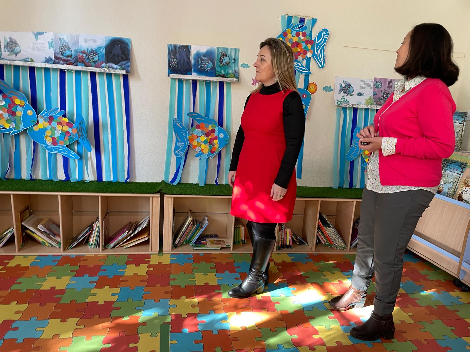 La consejera de Educación, Lydia Espina, visita en la entrada del Colegio Público Xove una exposición sobre el 8-M.