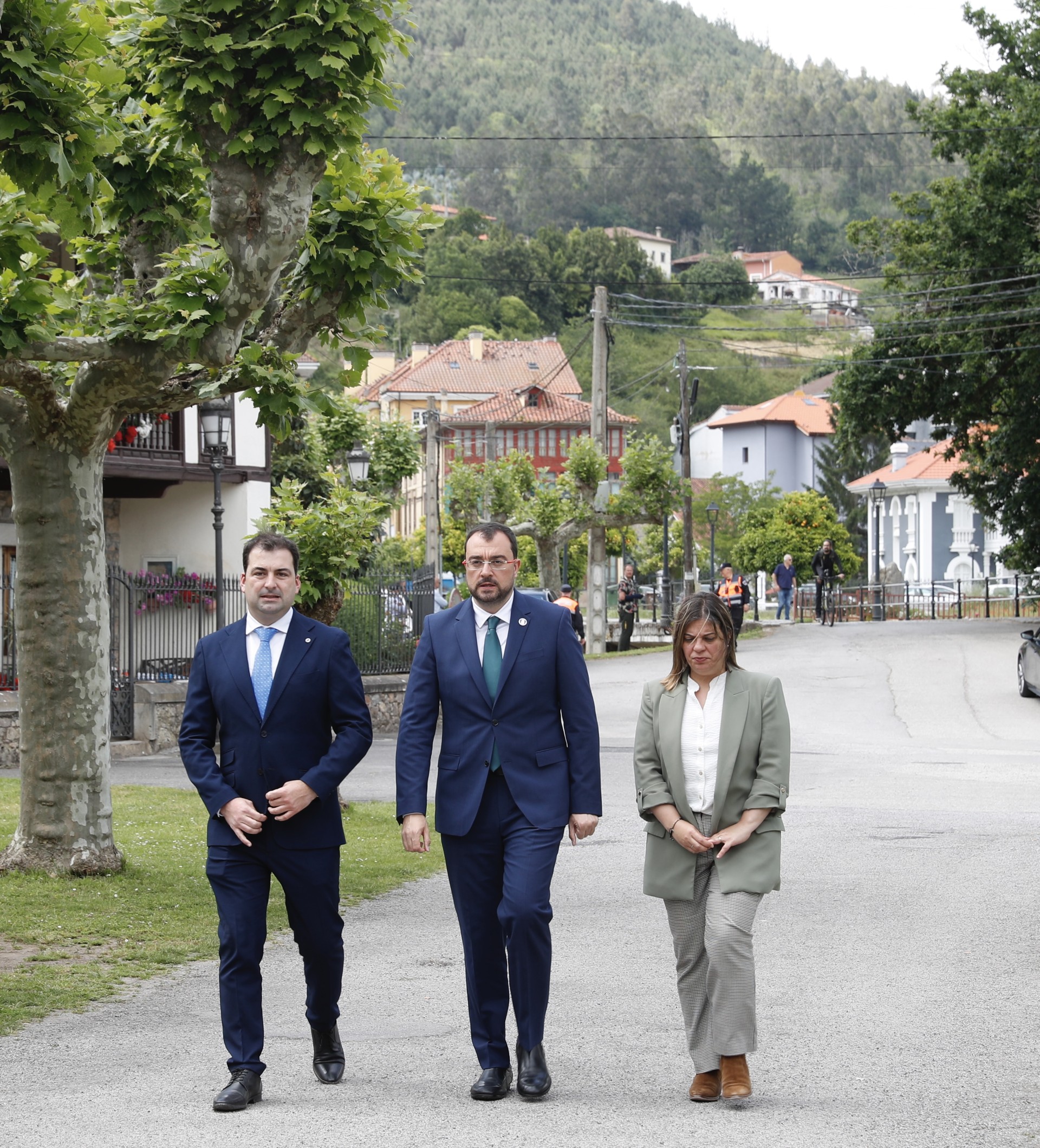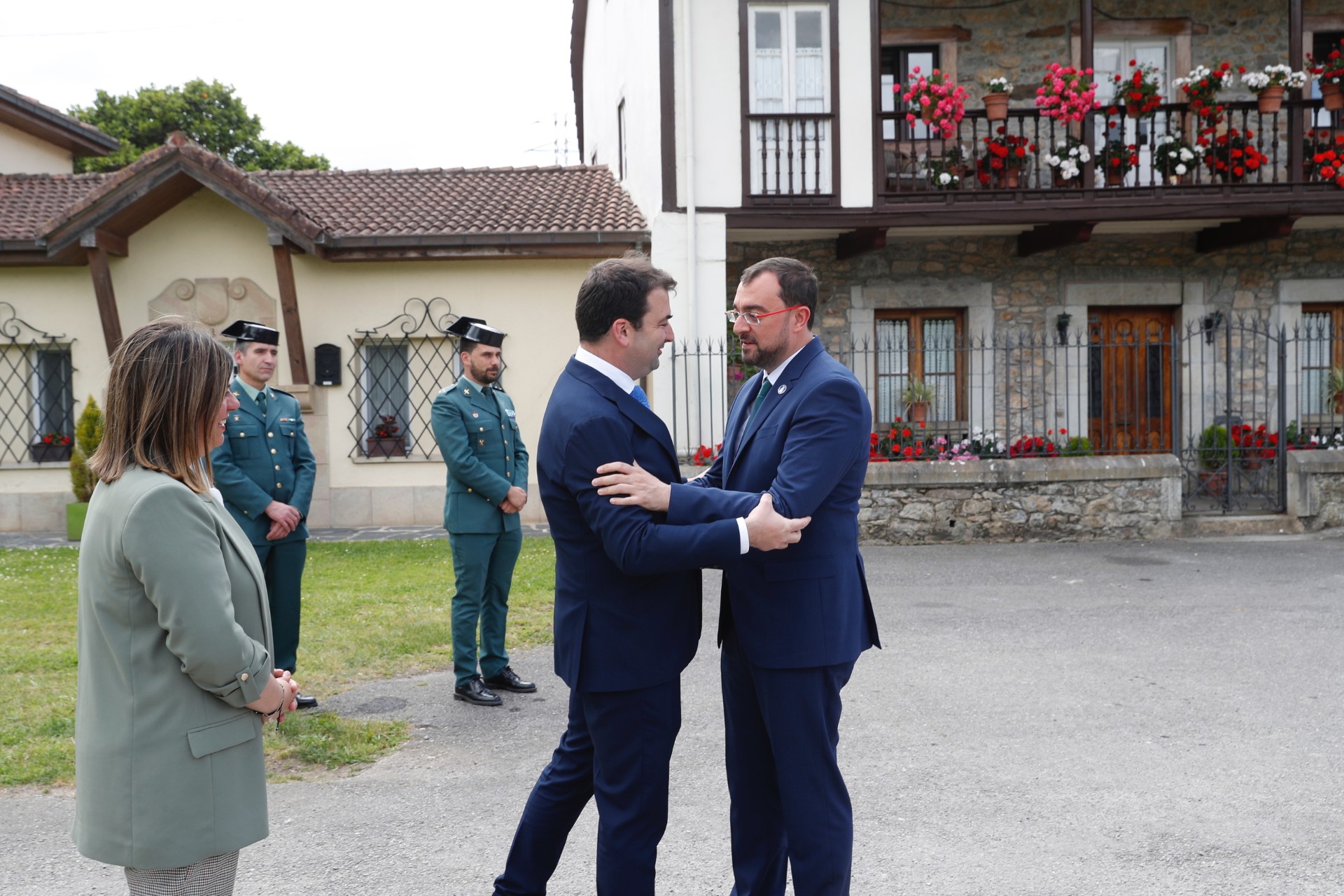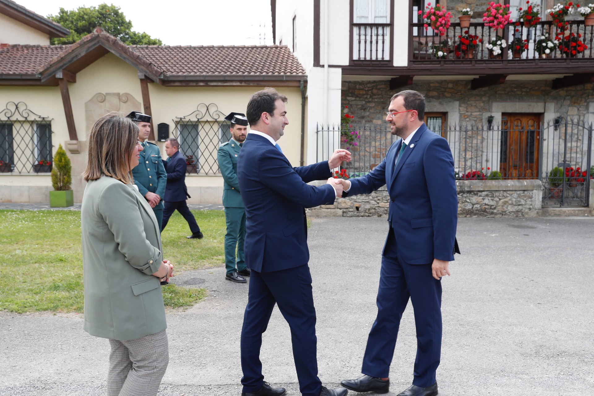 El alcalde de Salas, Sergio Hidalgo, (primero por la izda.),en presencia de la vicepresidenta del Principado, Gimena Llamedo, saluda al presidente del Principado de Asturias , Adrián Barbón ( a la derecha), a su llegada al concejo de Salas, donde hoy se ha celebrado la reunión semanal del Consejo de Gobierno.