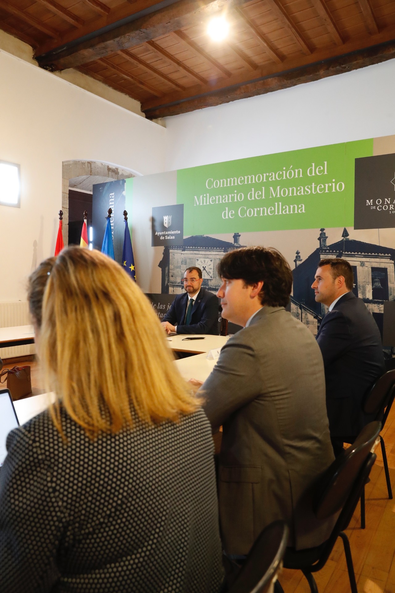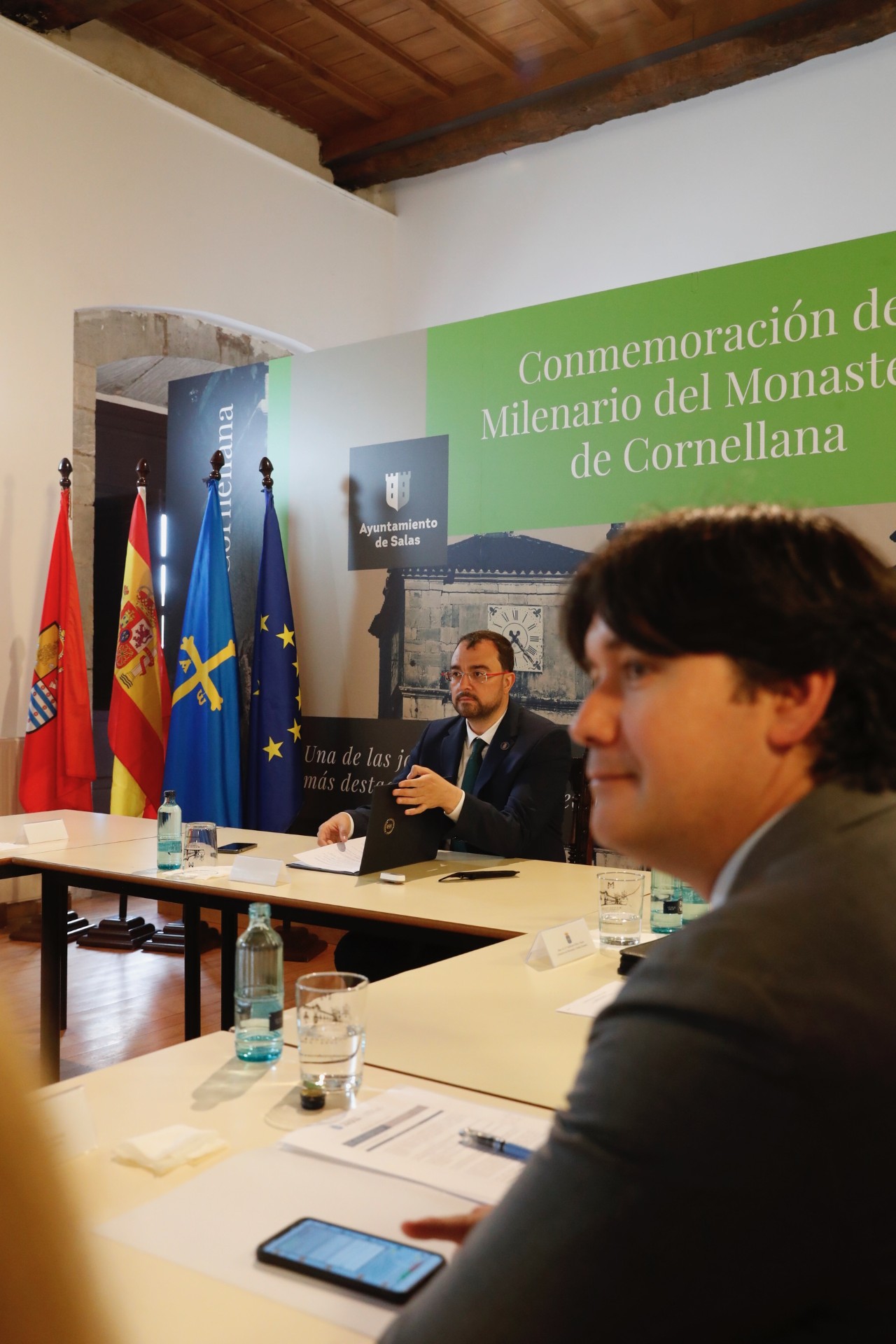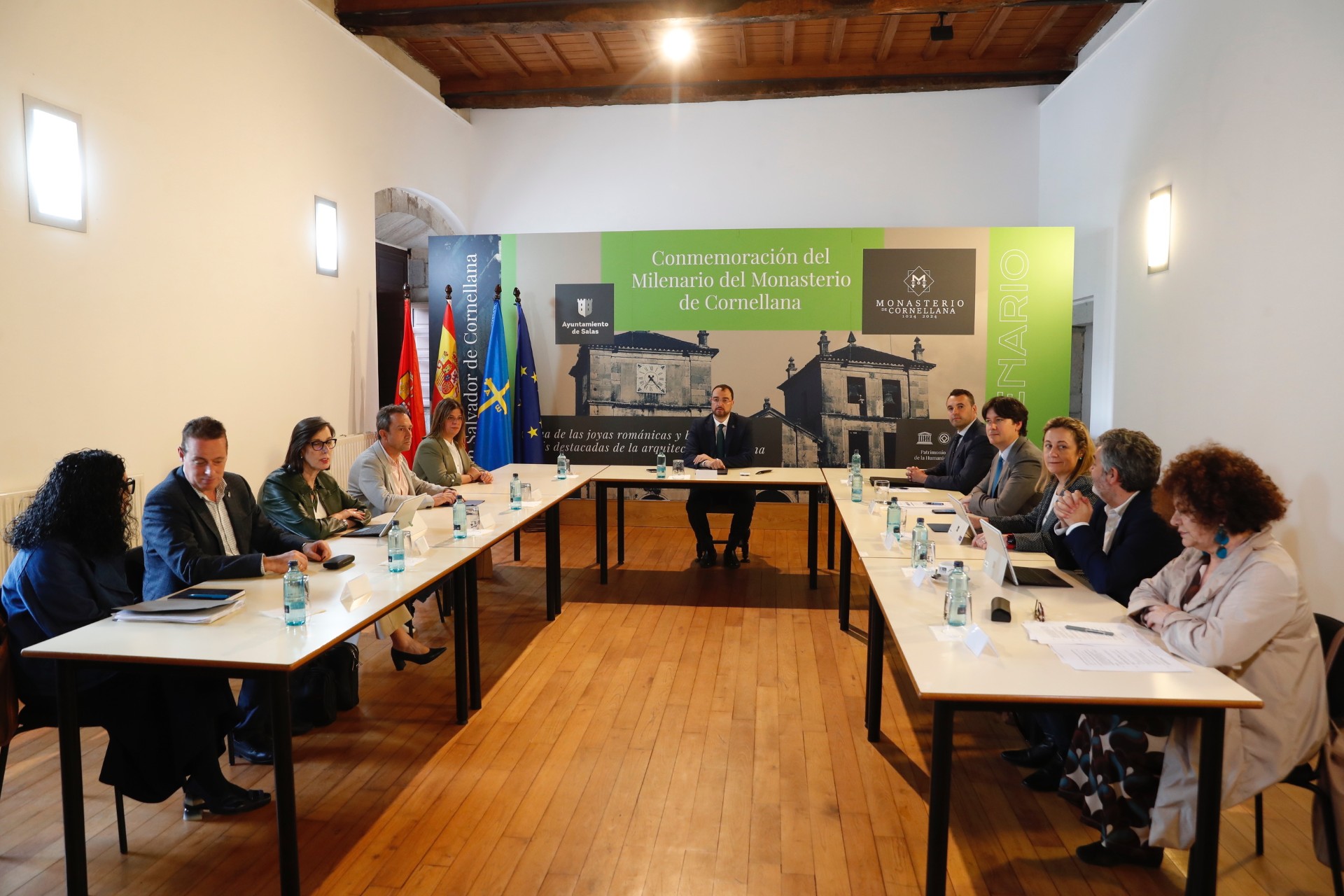 El presidente del Principado de Asturias, Adrián Barbón (en la cabecera de la mesa en la imagen) preside la reunión semanal del Consejo de Gobierno, que hoy se ha celebrado en el Monasterio de San Salvador de Corniana/Cornellana.