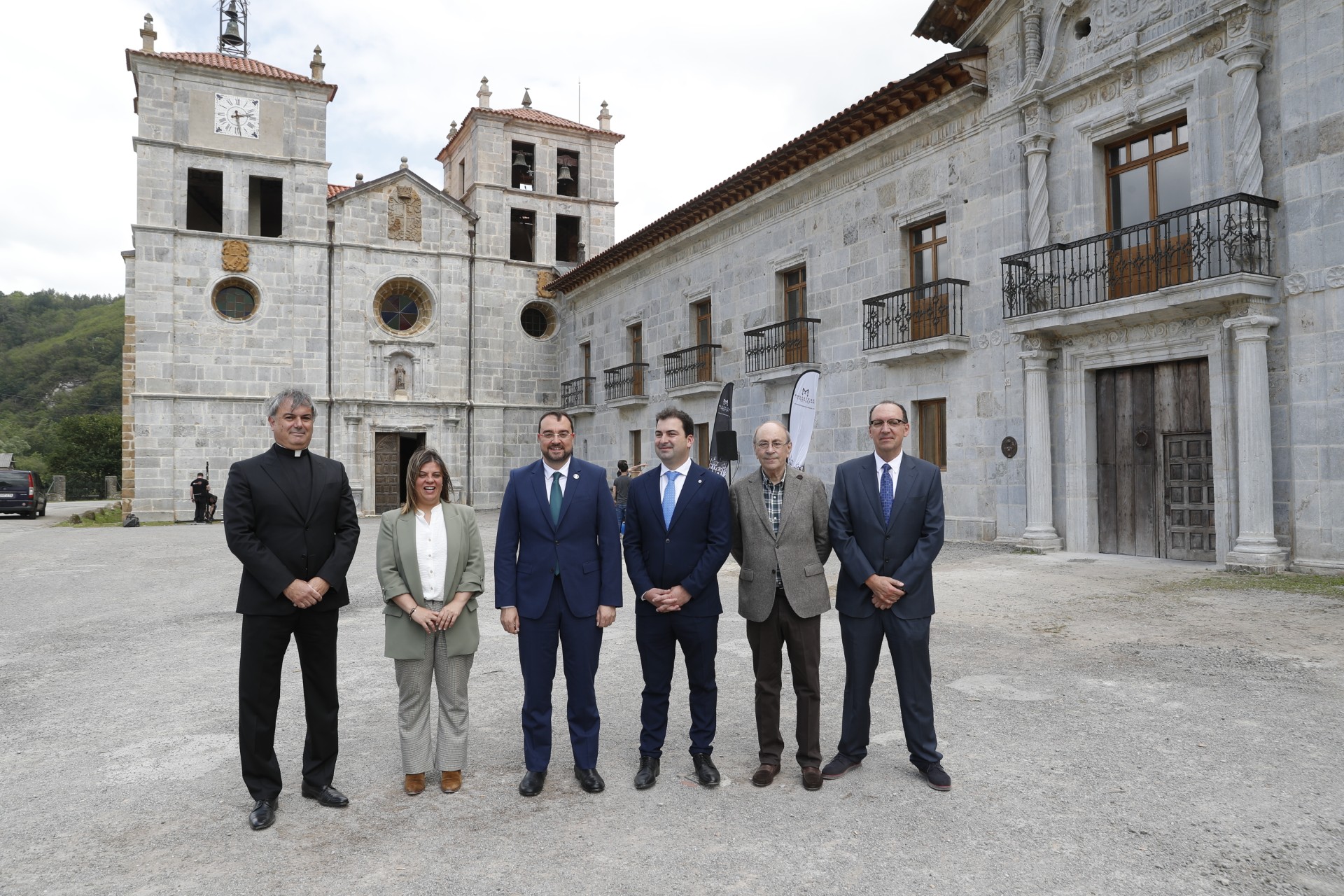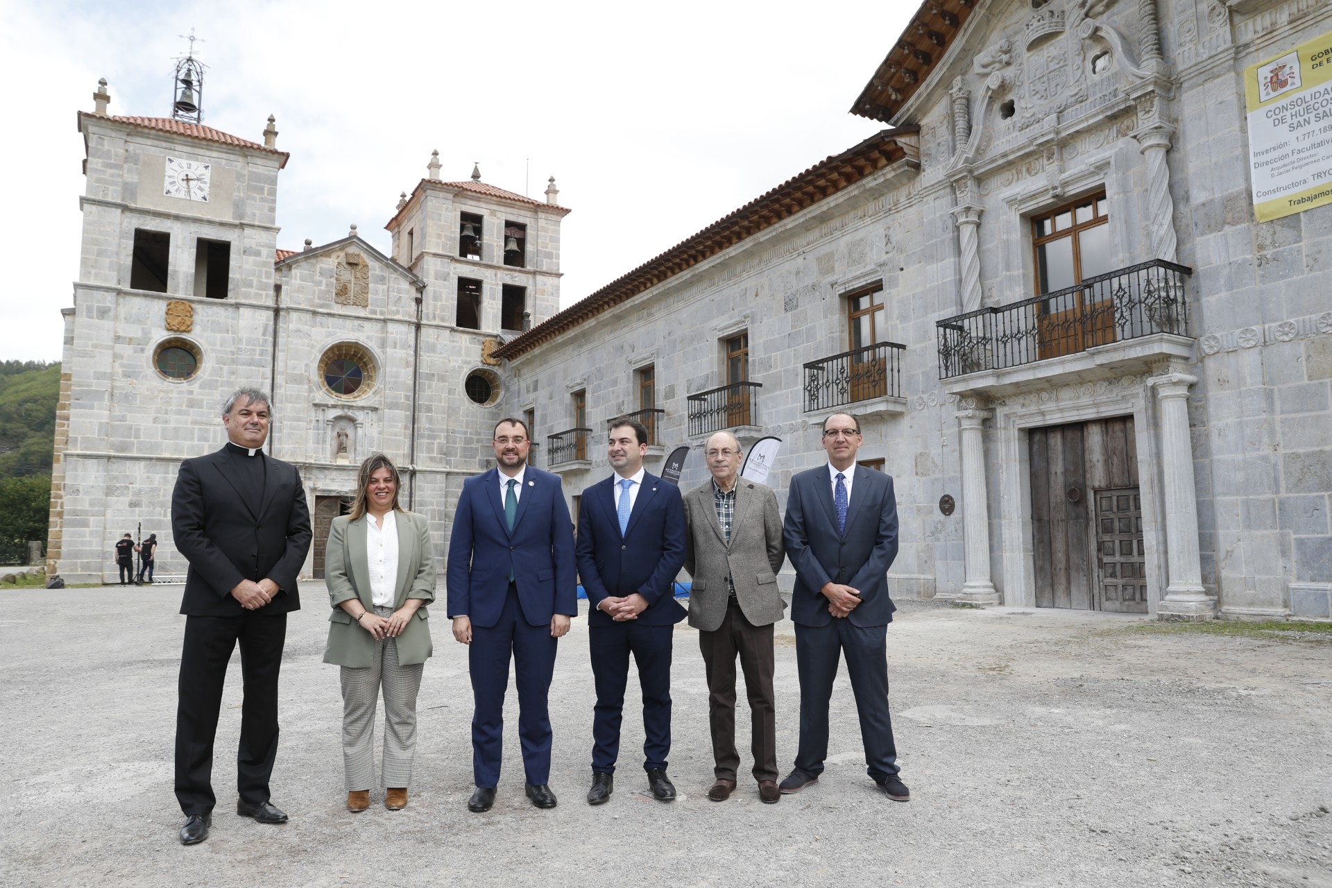 De izquierda a derecha en la imagen, el párroco de Corniana/Cornellana, Arturo García; la vicepresidenta del Principado, Gimena Llamedo; el presidente del Principado de Asturias, Adrián Barbón; el alcalde de Salas, Sergio Hidalgo; el representante vecinal de Corniana/Cornellana,Moisés Suárez, e Isidro Sánchez, presidente de la Fundación Valdes Salas.