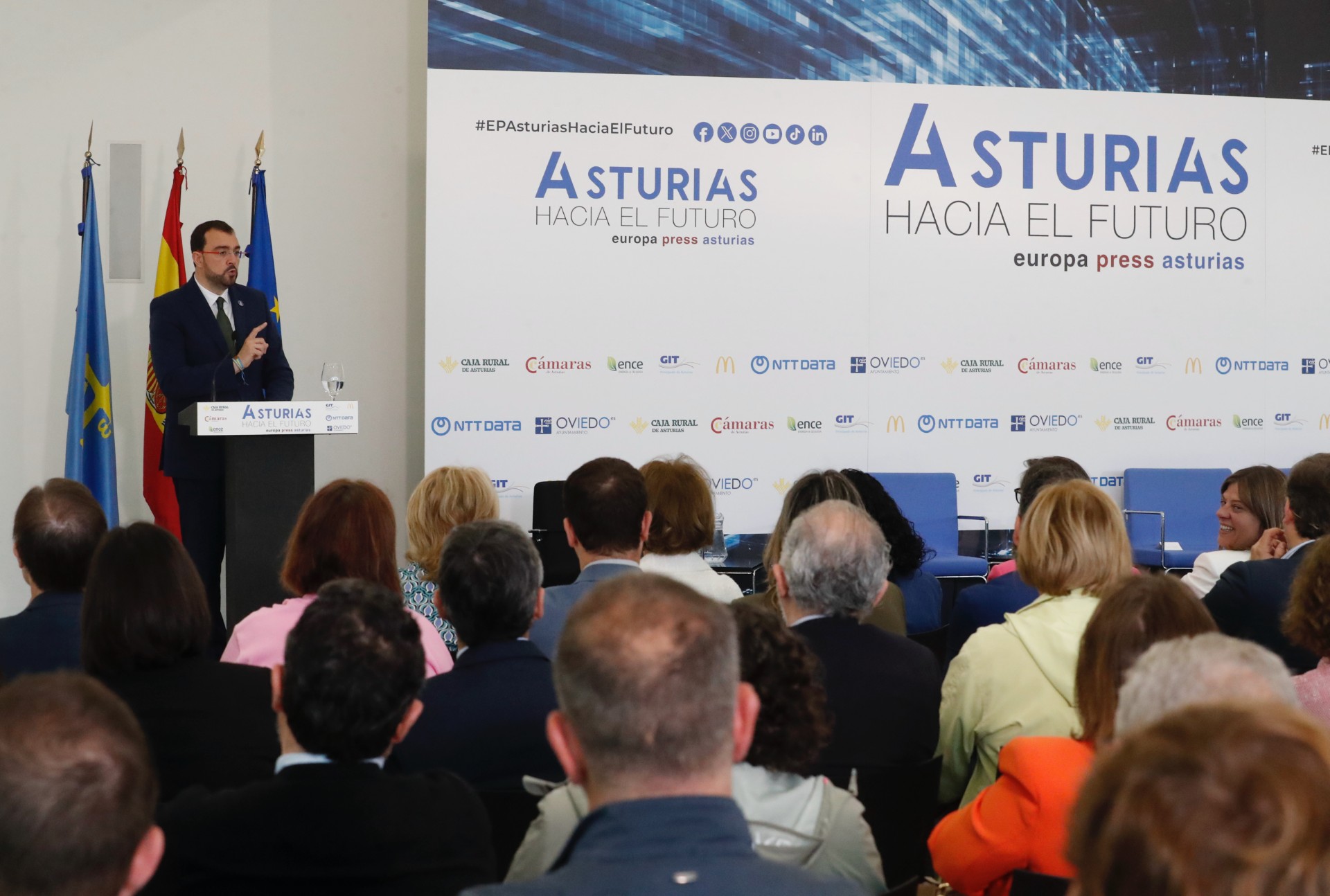 El presidente del Principado de Asturias, Adrián Barbón, interviene en la inauguración del 'Foro Asturias hacia el futuro', organizado por Europa Press.