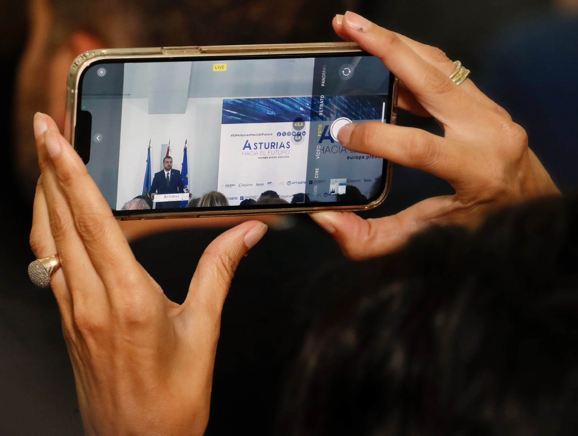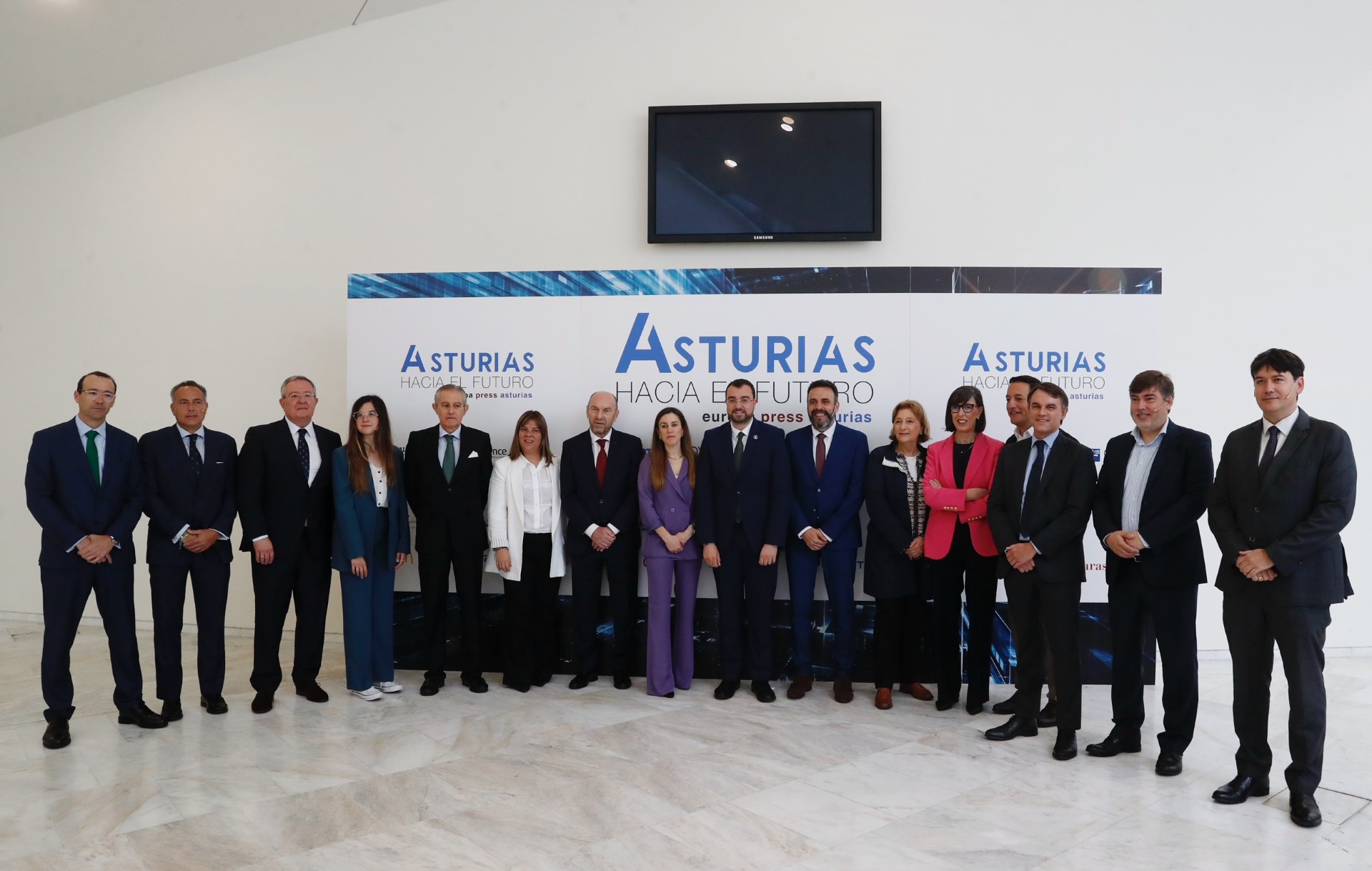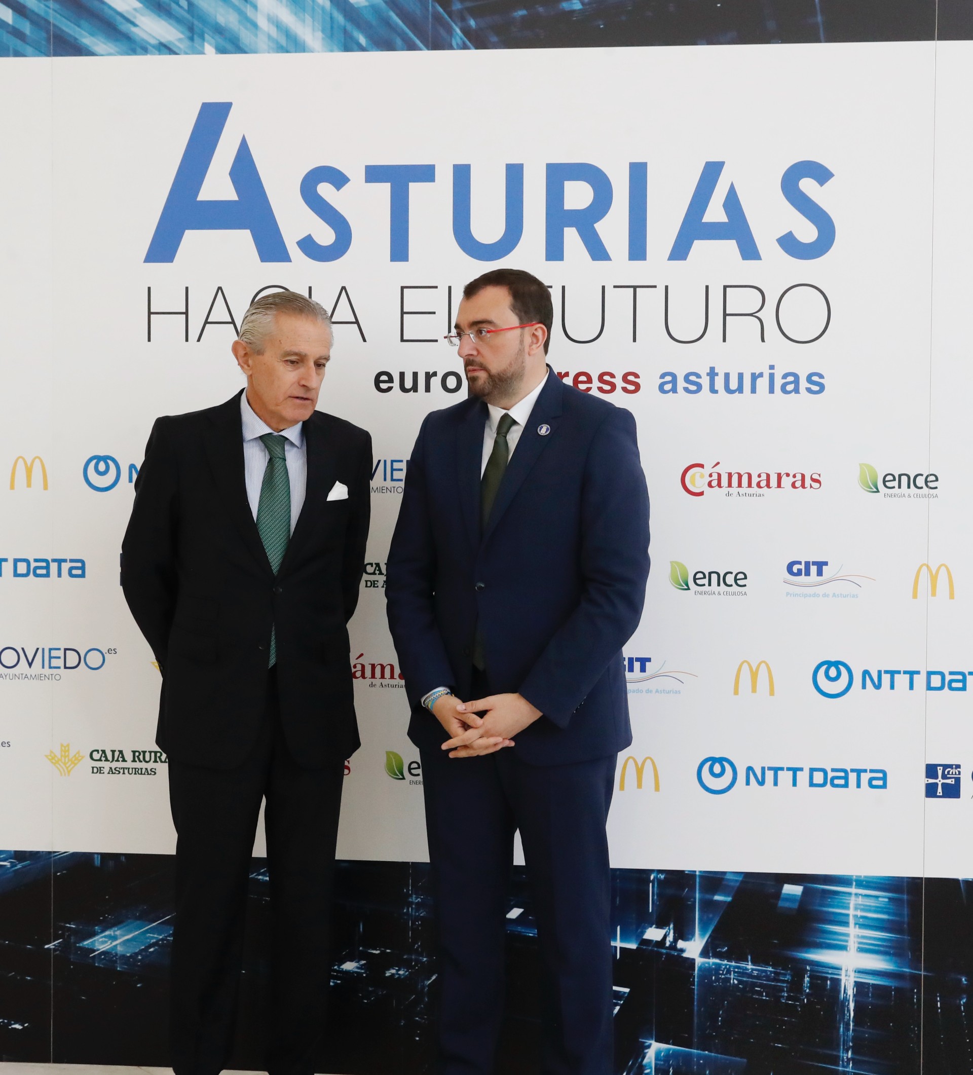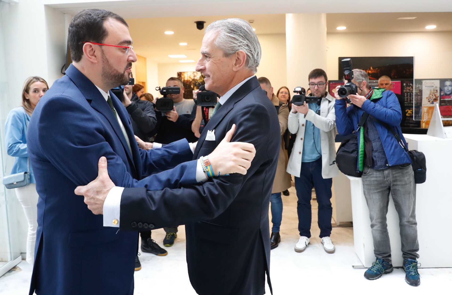 El presidente del Principado de Asturias, Adrián Barbón, saluda al presidente Ejecutivo de Europa Press, Asís Martín de Cabiedes.