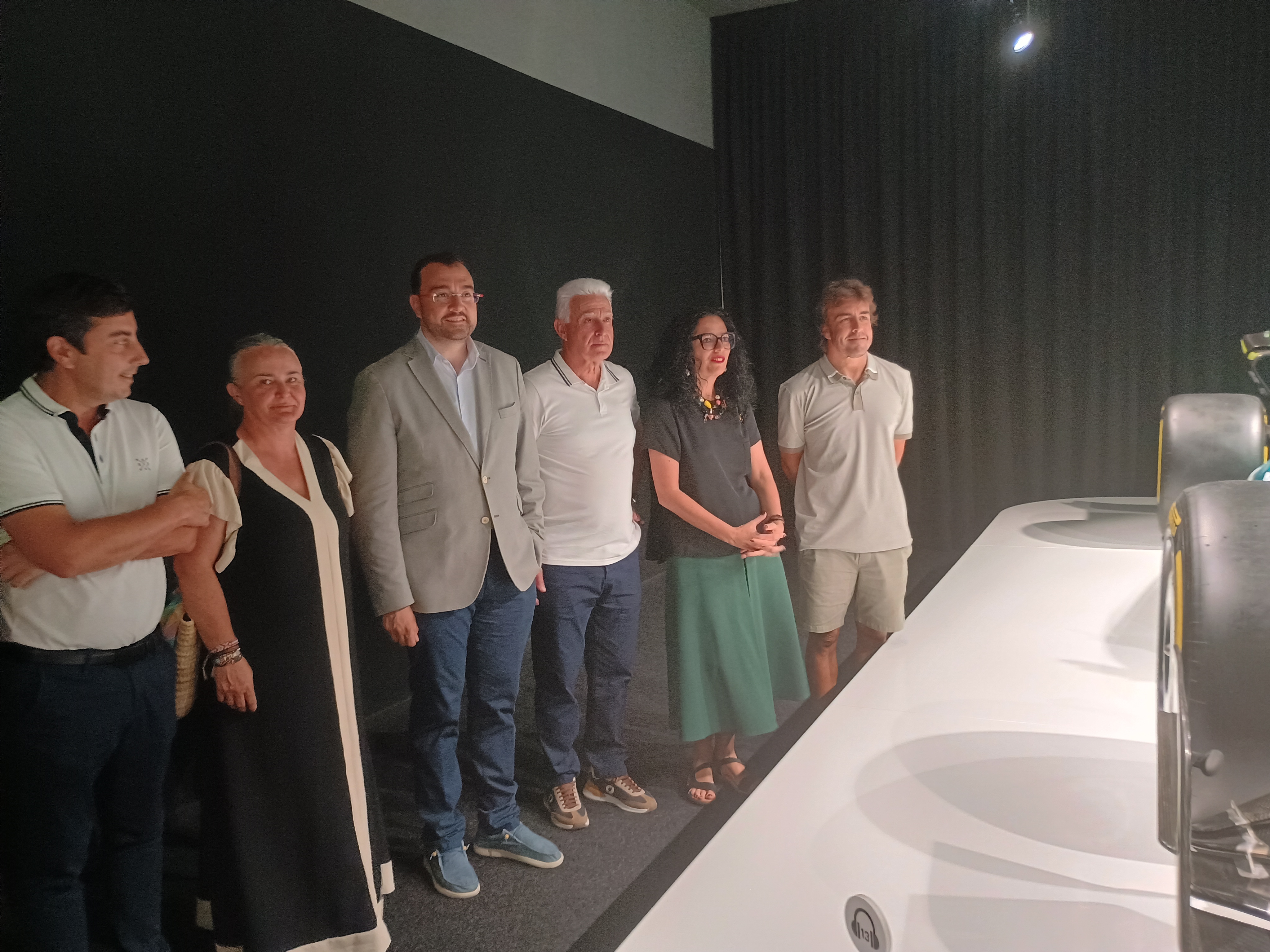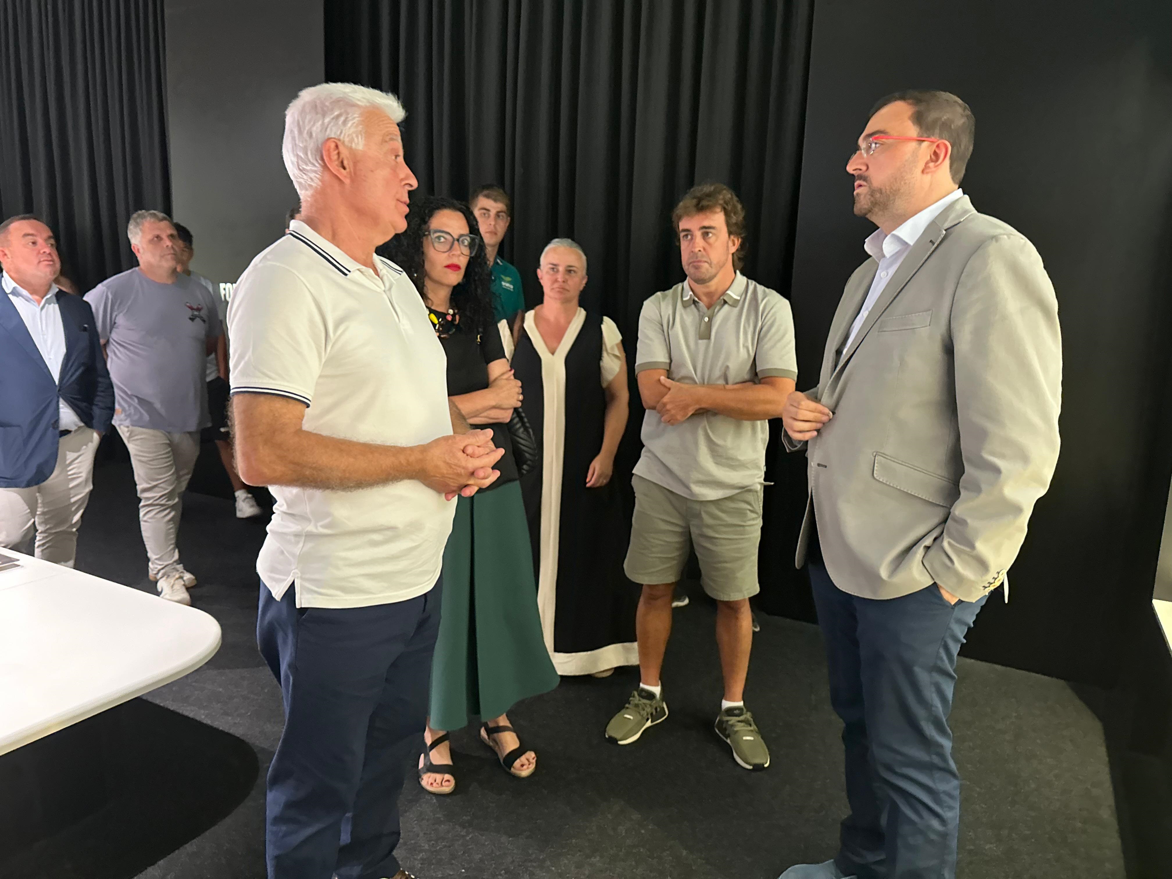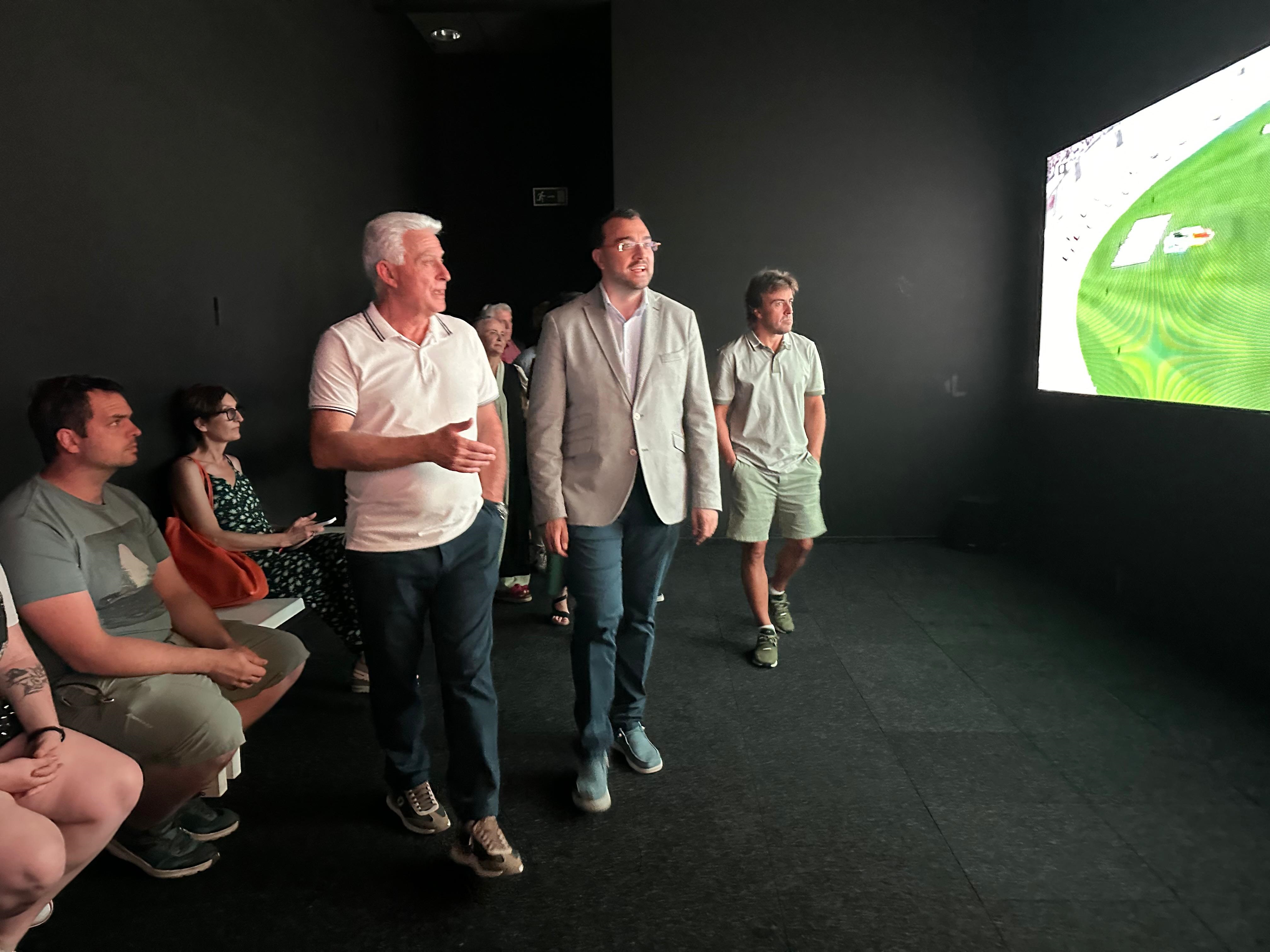 De izquierda a derecha, el presidente del Principado, Adrián Barbón; la consejera de Cultura, Vanessa Gutiérrez; el piloto Fernando Alonso; y el padre del piloto asturiano, José Luis Alonso.