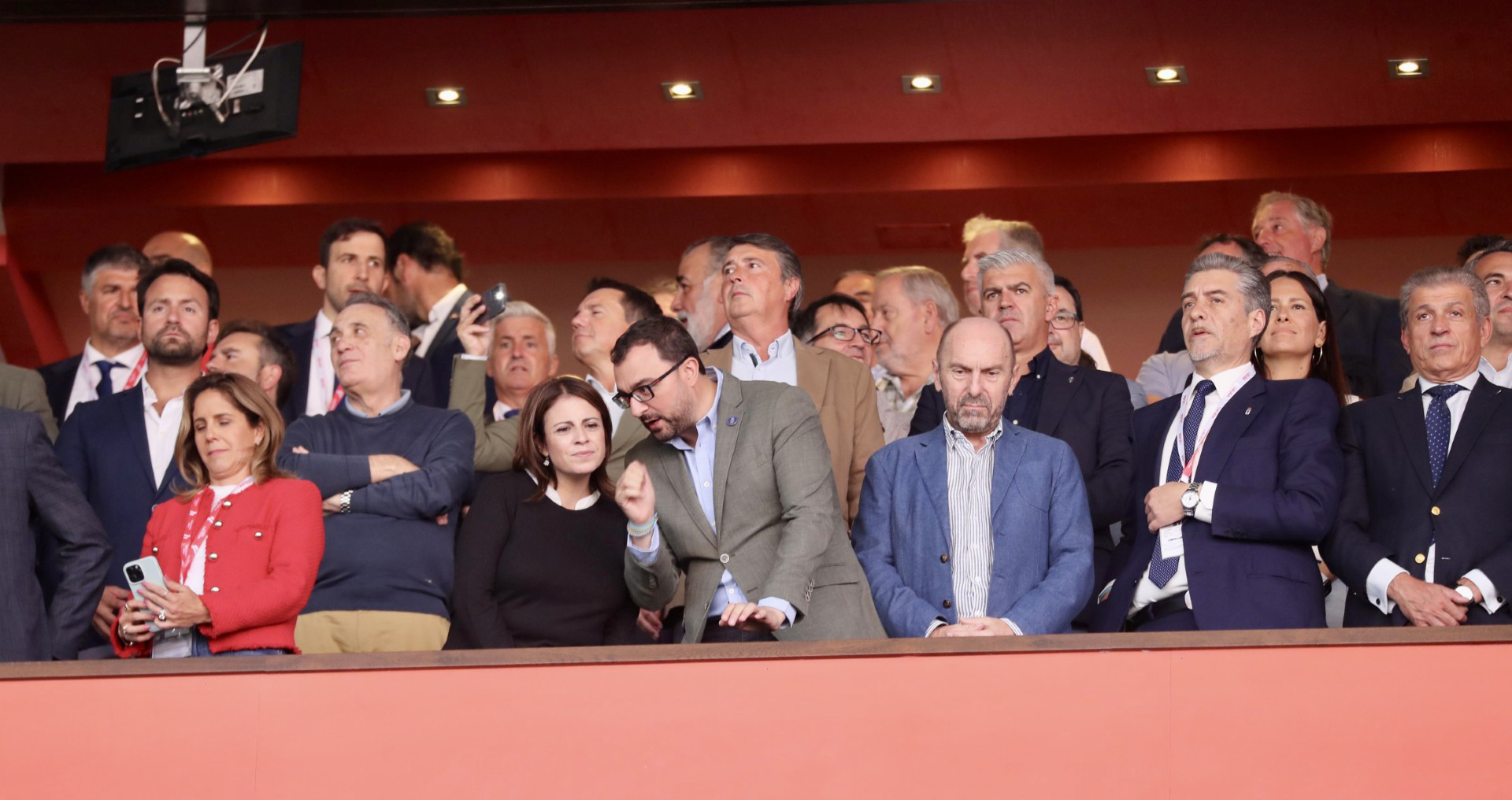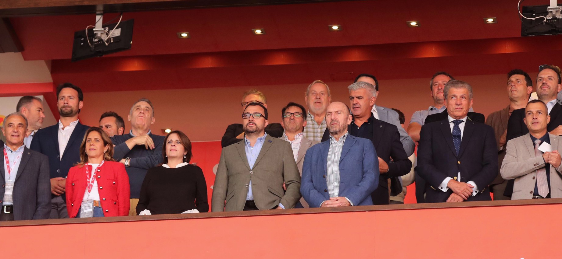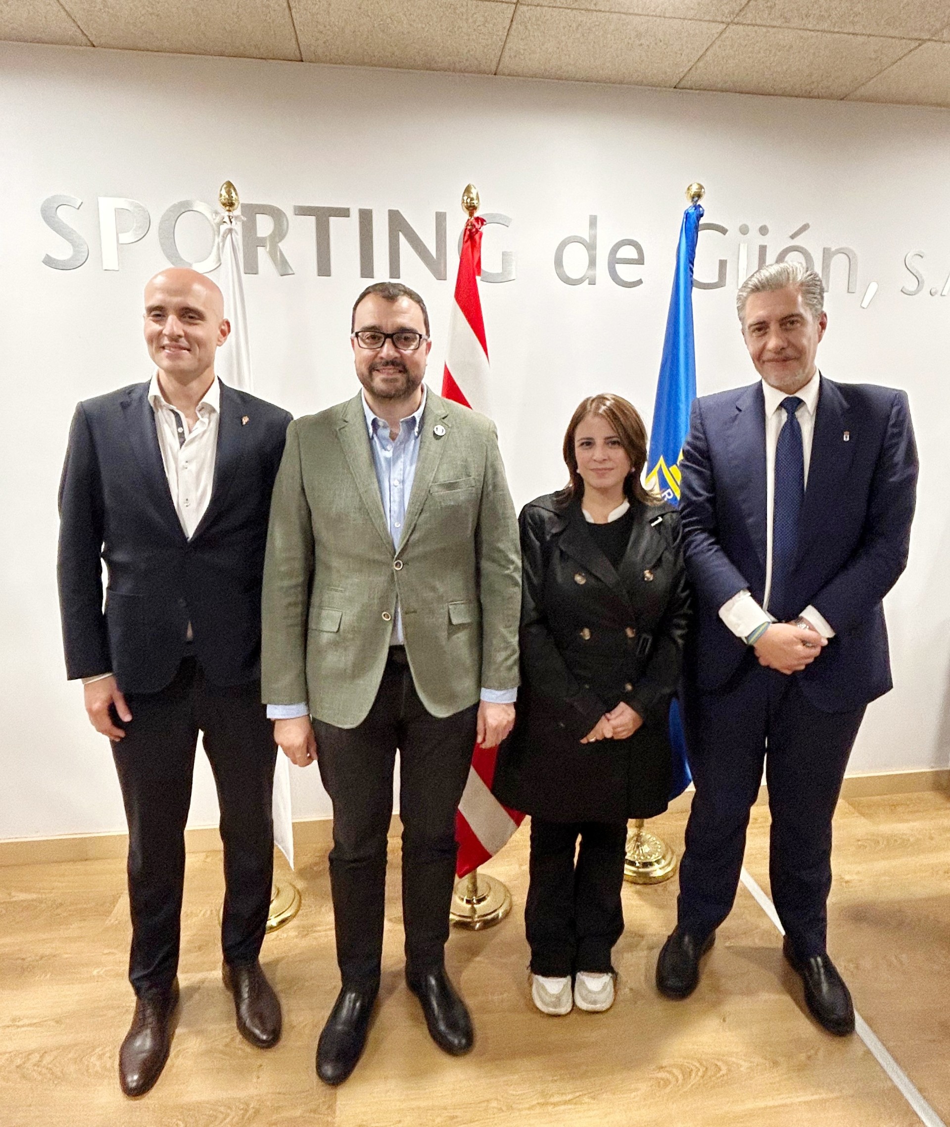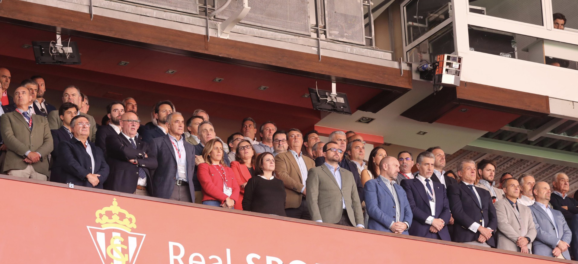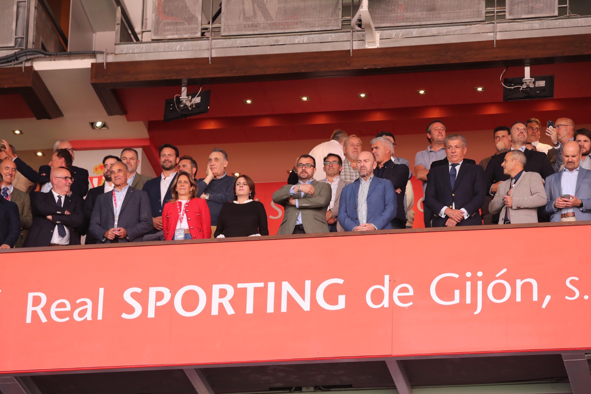 De izquierda a derecha, David Guerra, presidente del Sporting de Gijón; Adrián Barbón, presidente del Principado; Adriana Lastra, delegada del Gobierno en Asturias; y Martín Peláez, presidente del Real Oviedo.