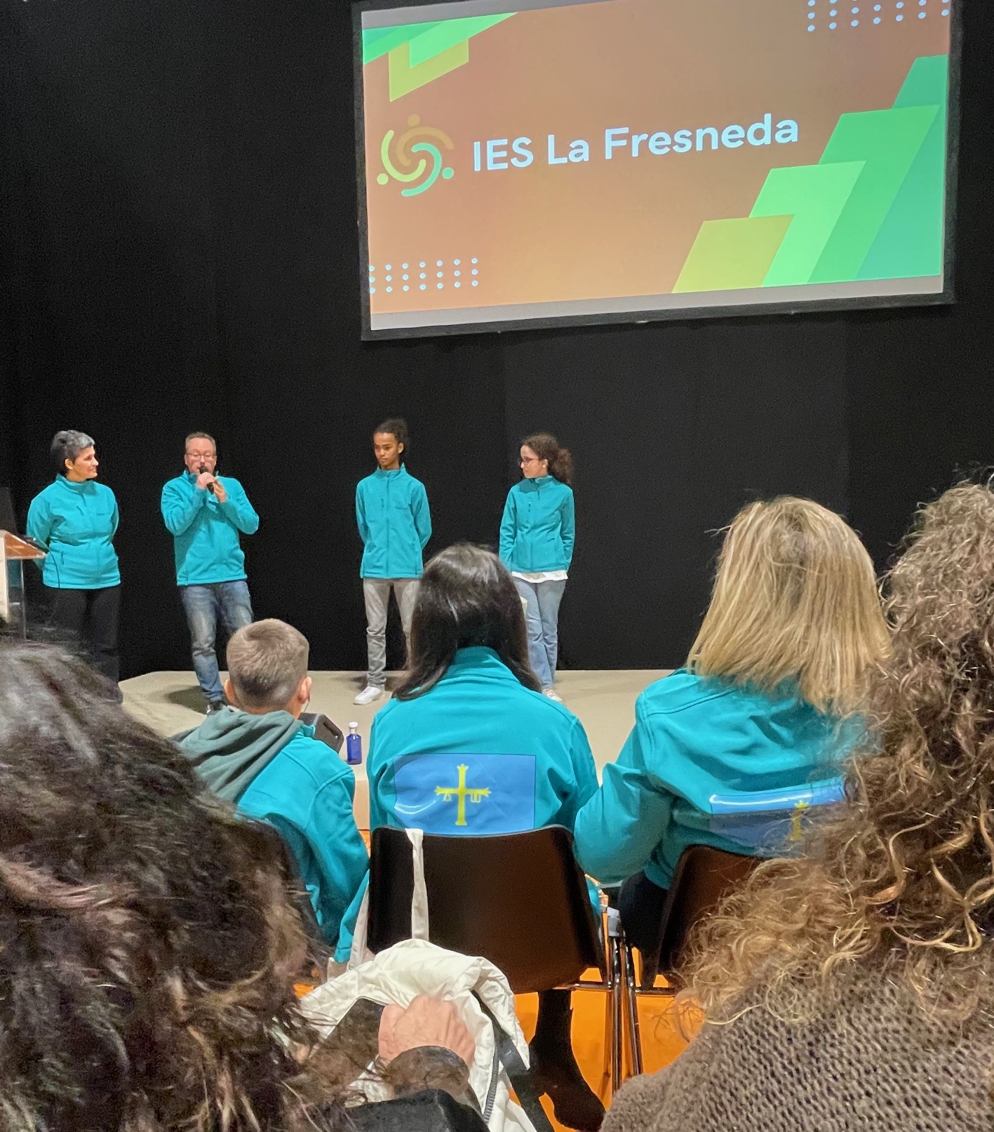 La consejera de Educación, Lydia Espina, y el director general, Julio Vallaure, con el alumnado y el profesorado del IES La Fresneda.