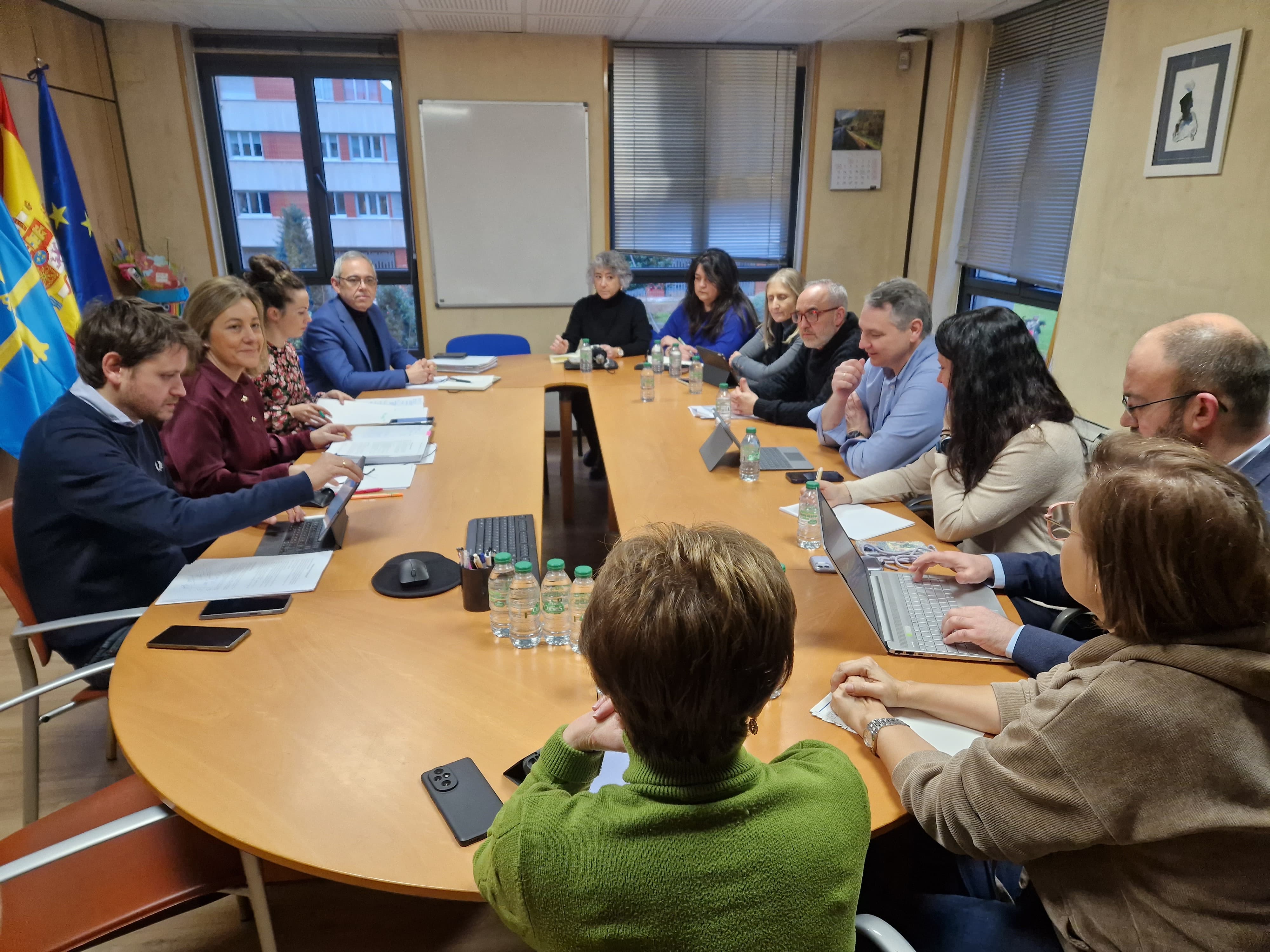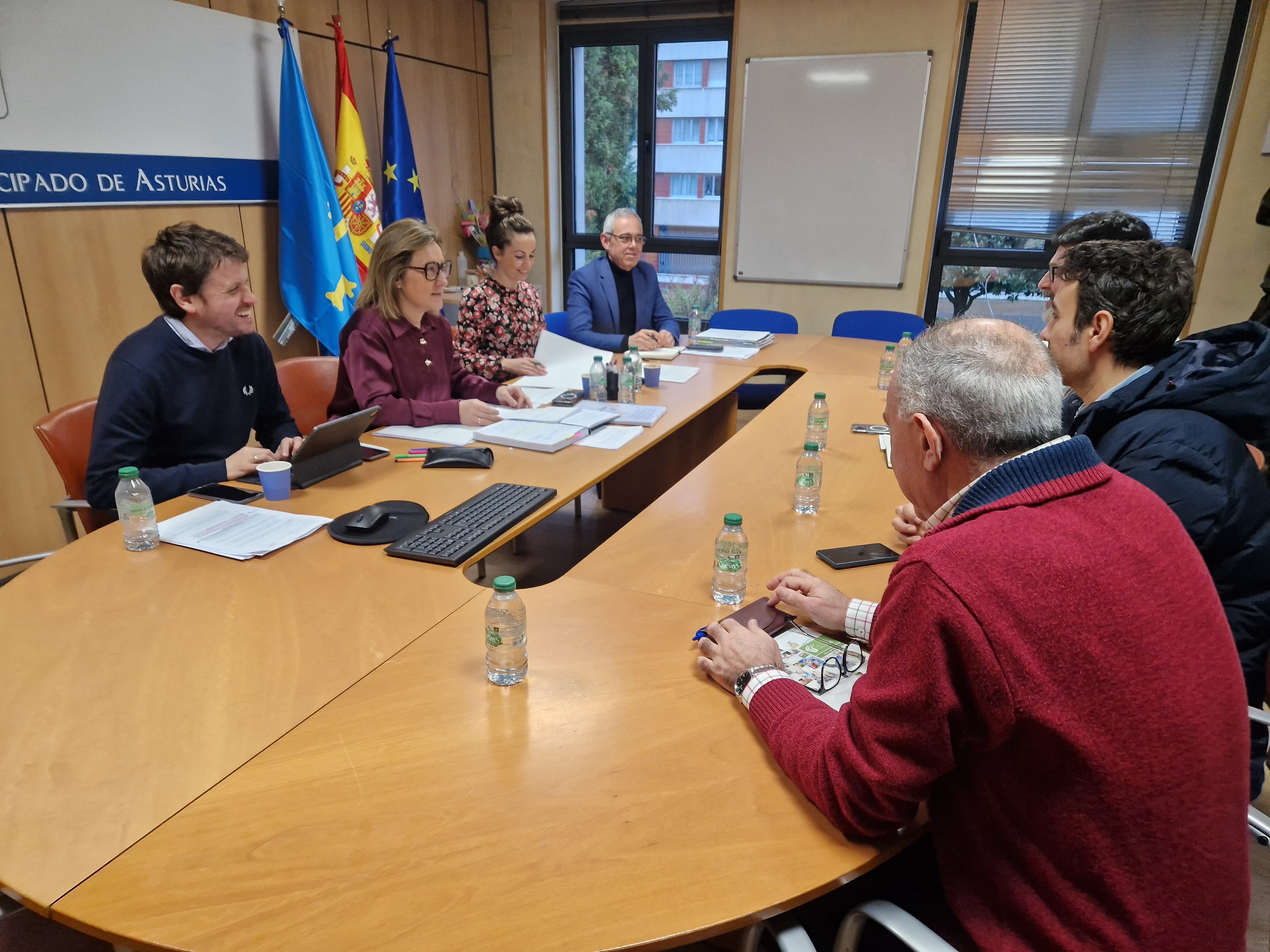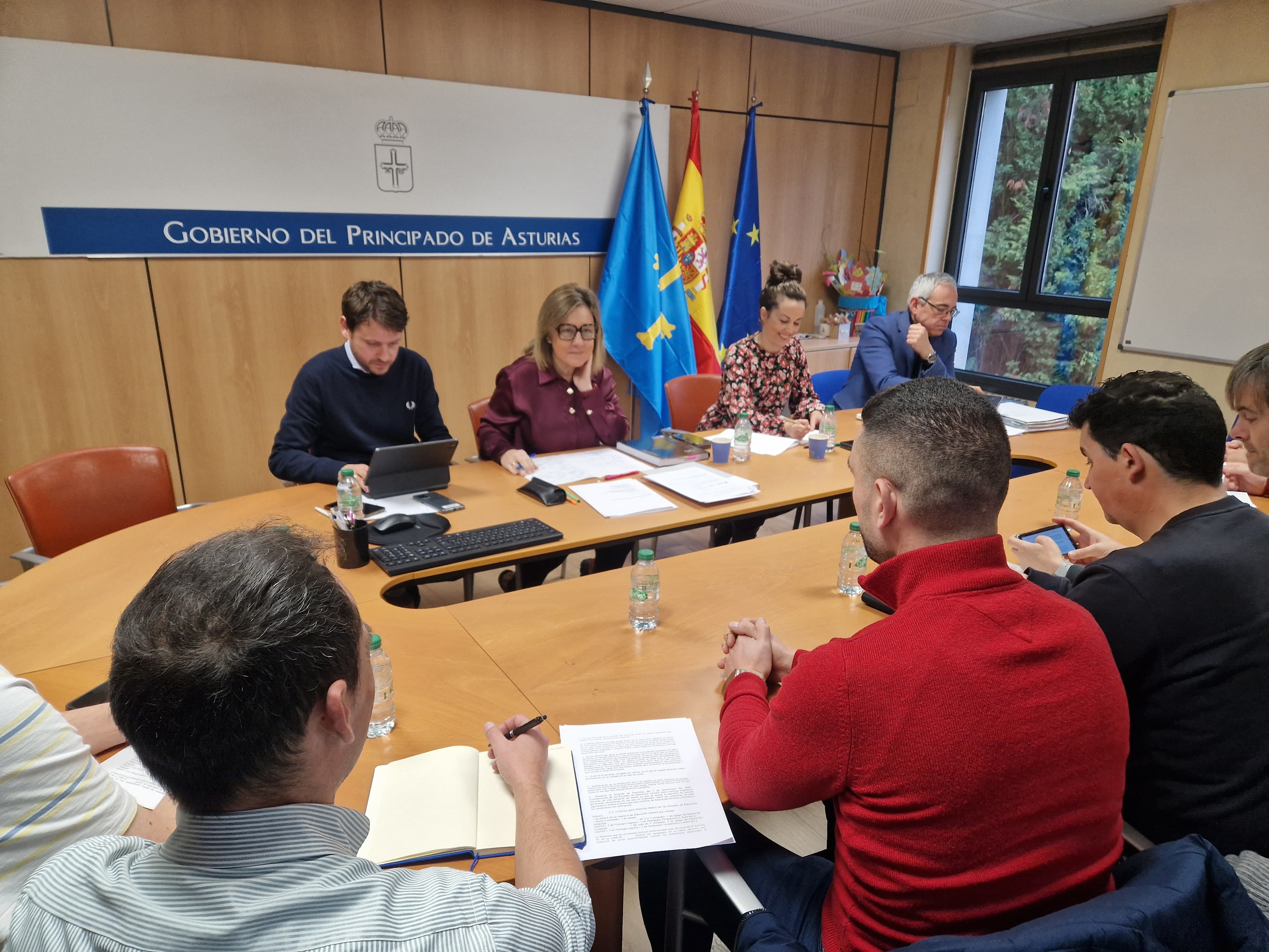 En la imagen, al fondo y de izquierda a derecha, el director general de Inclusión Educativa y Ordenación, David Artime; la consejera de Educación, Lydia Espina; la directora general de Centros, Red 0-3 y Enseñanzas Profesionales, Cristina Blanco, y el director general de Infraestructuras y Tecnologías Educativas, Julio Vallaure, durante su reunión con el comité de direcciones de Infantil y Primaria.