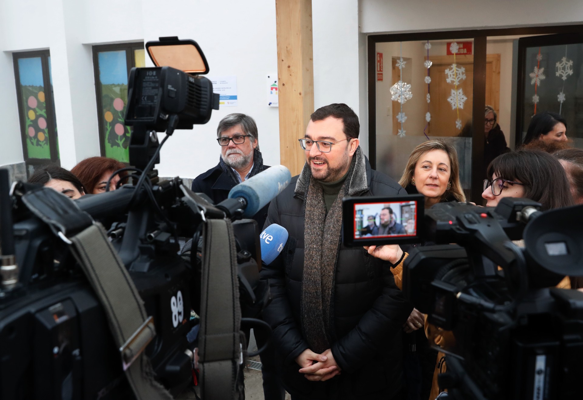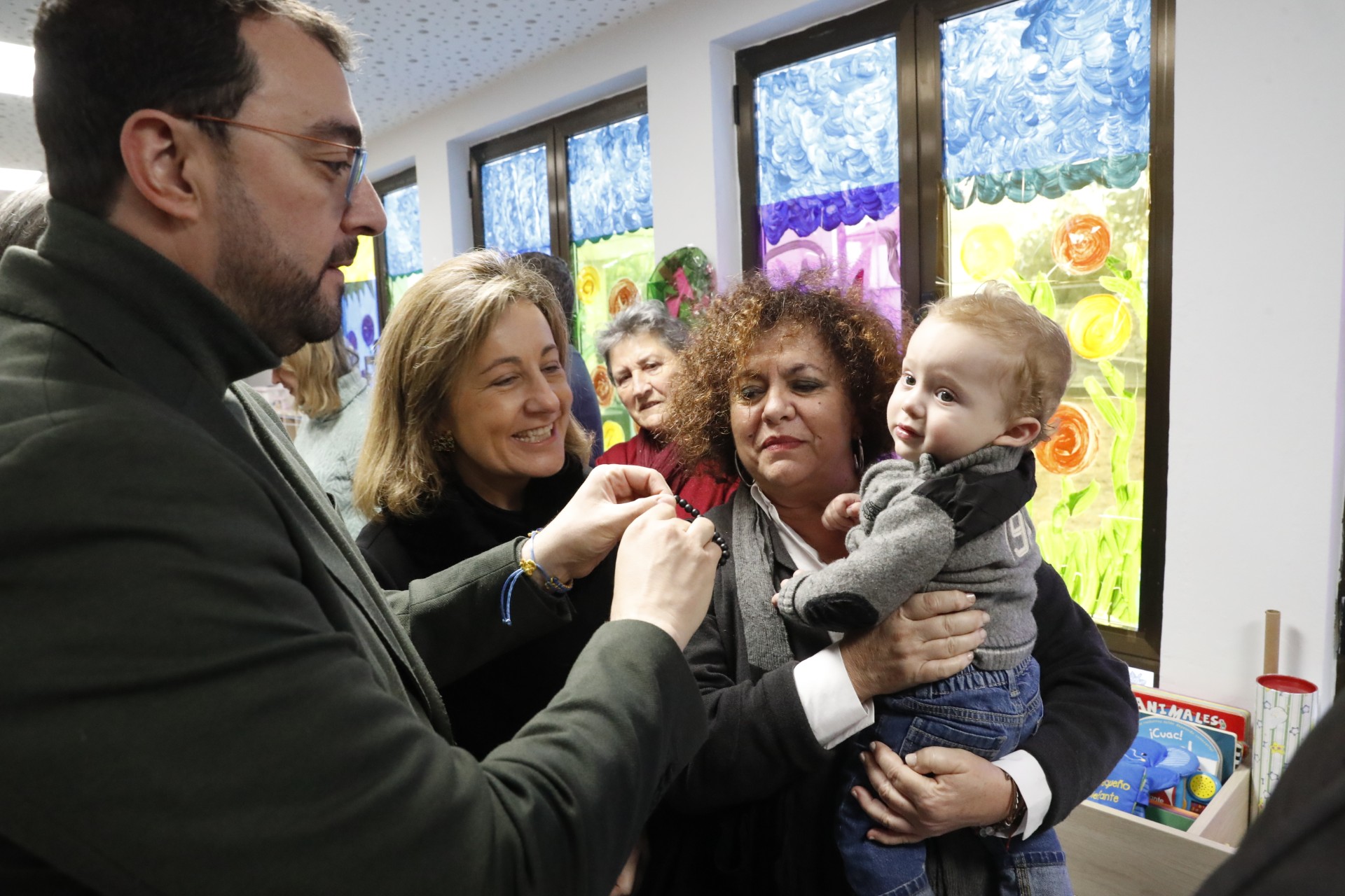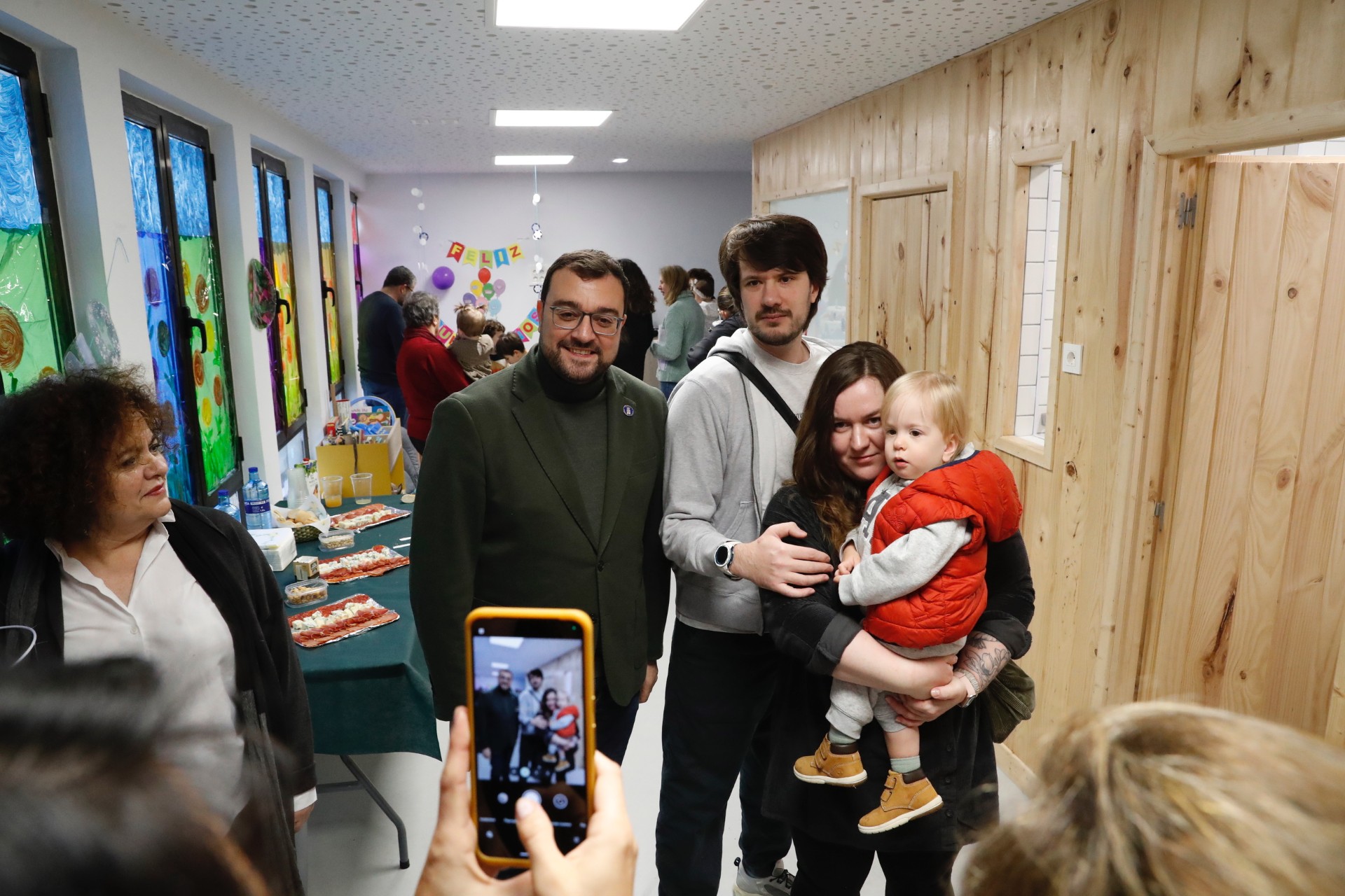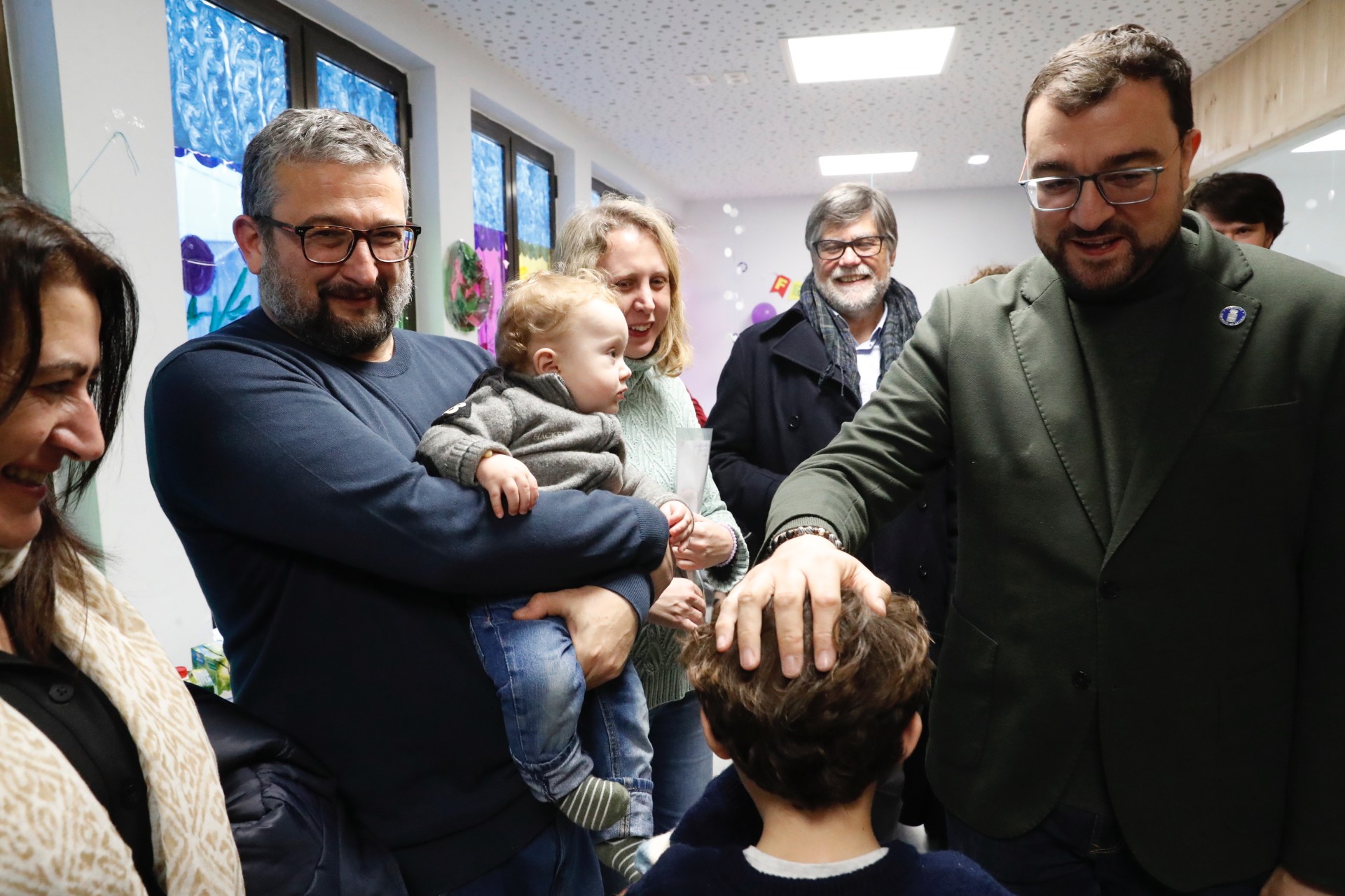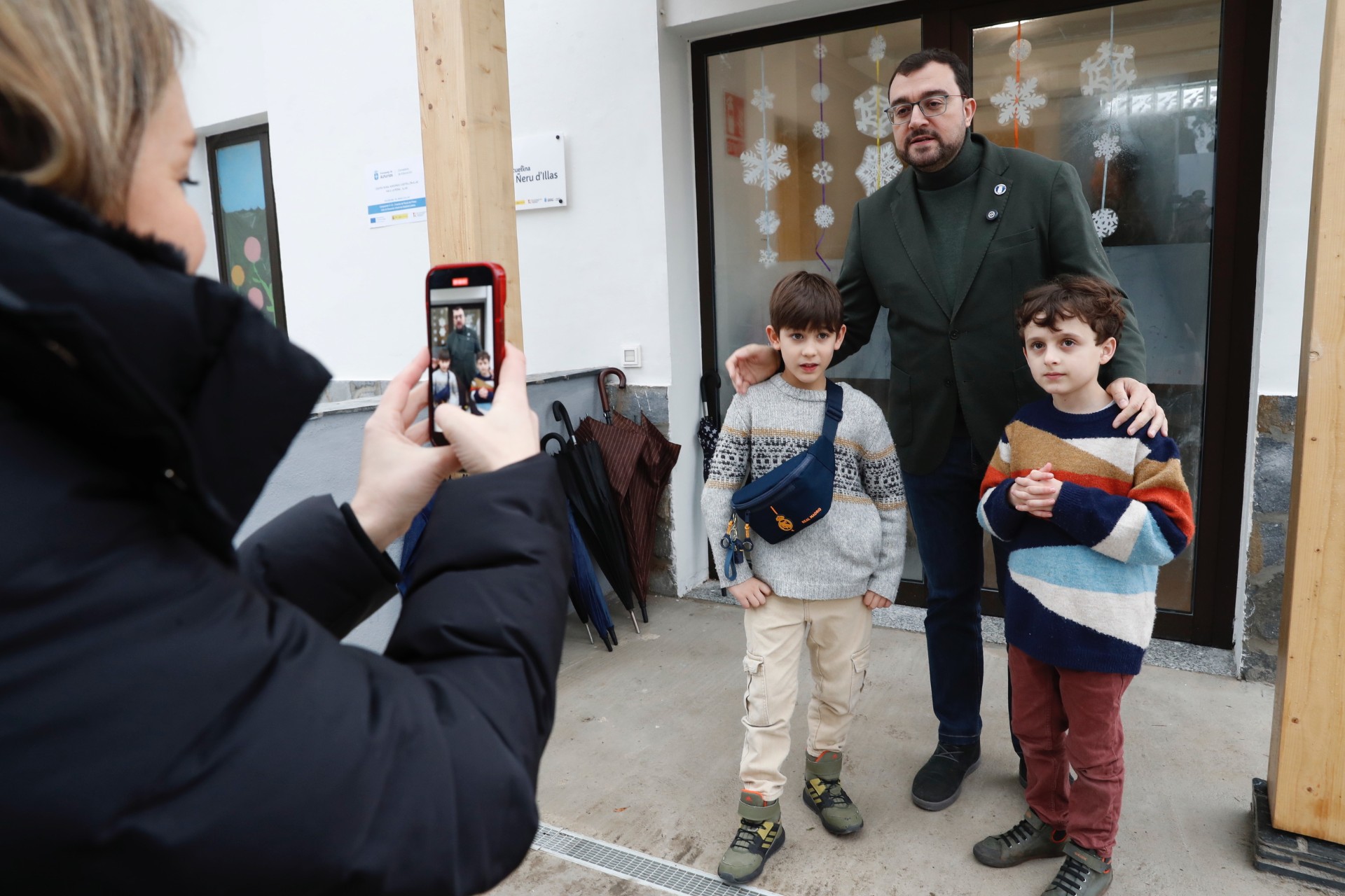 El presidente, Adrián Barbón, posa con una familia en la escuelina 'El Ñeru' de Illas.