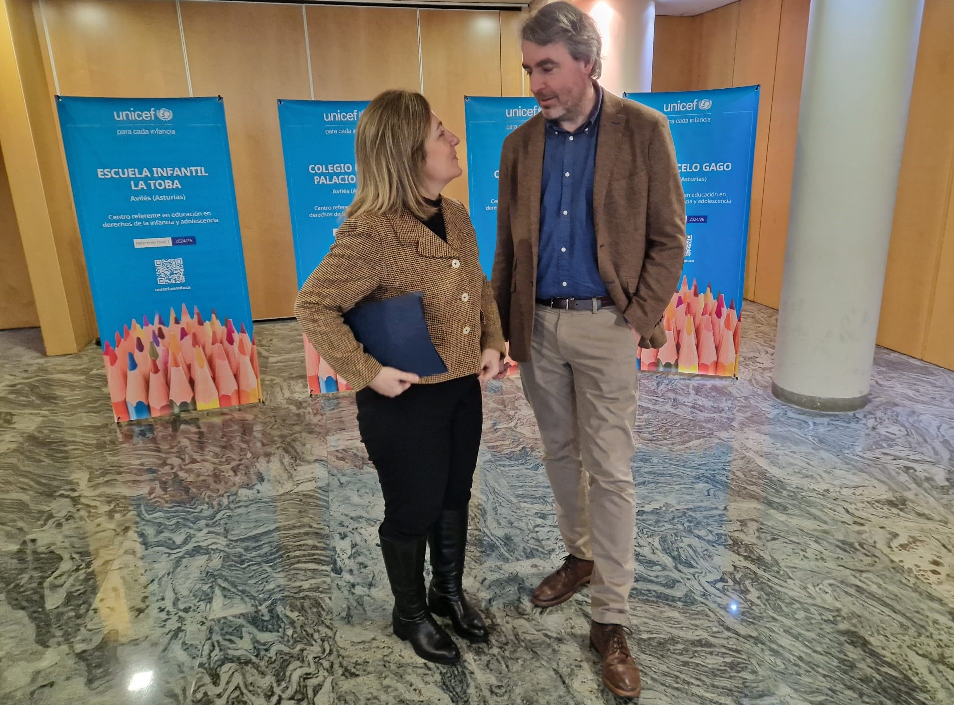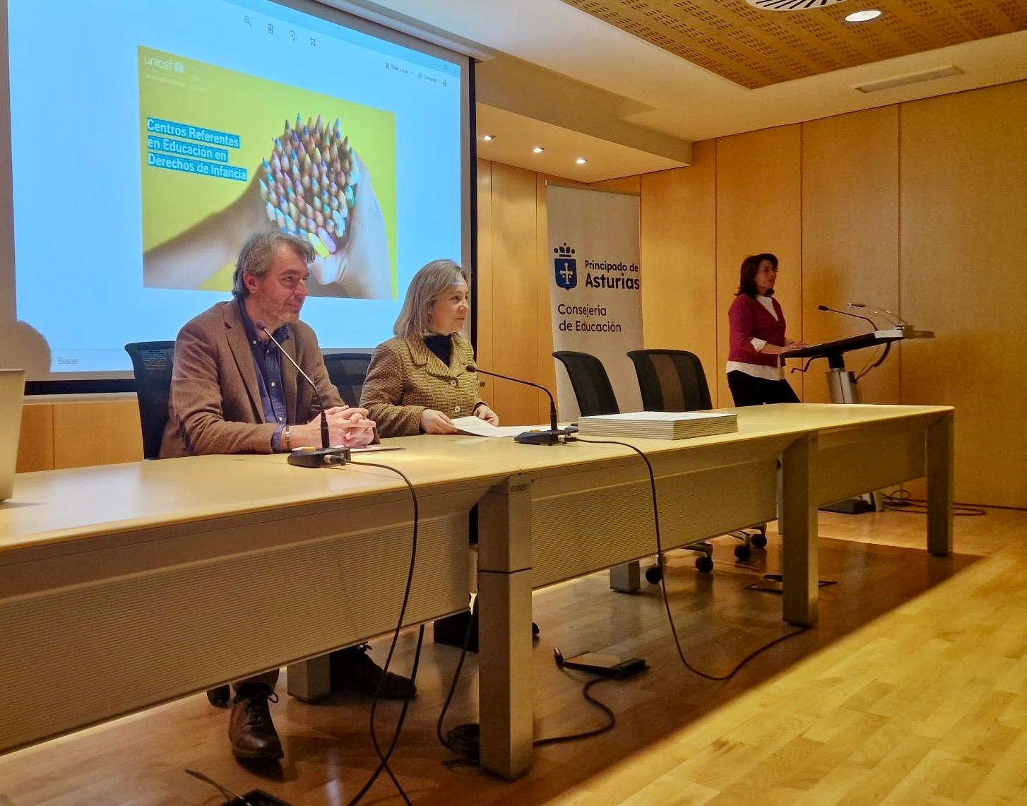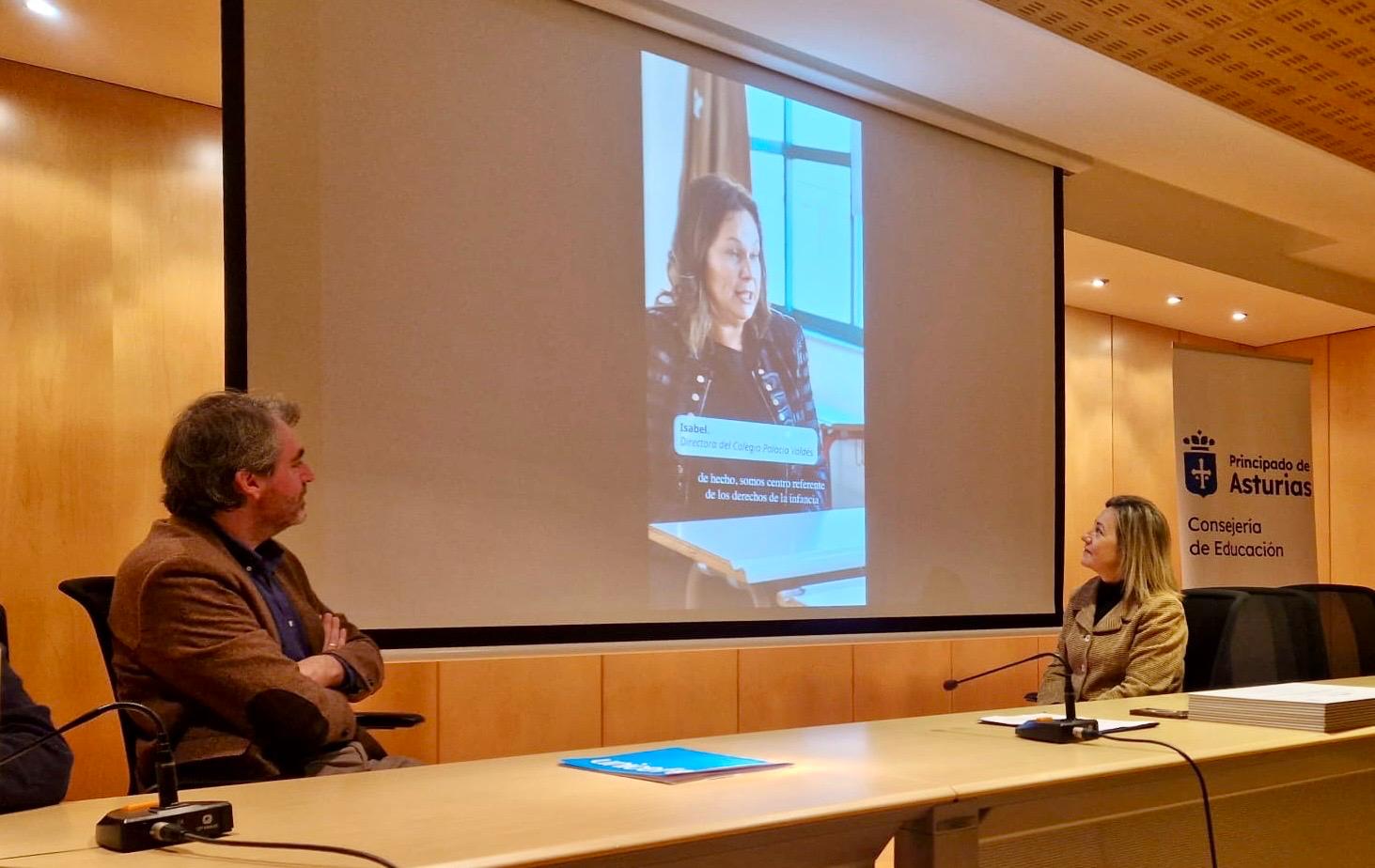 El presidente del Comité de Unicef en Asturias, Ignacio Calviño, y la consejera de Educación, Lydia Espina, durante el acto de entrega de reconocimientos.