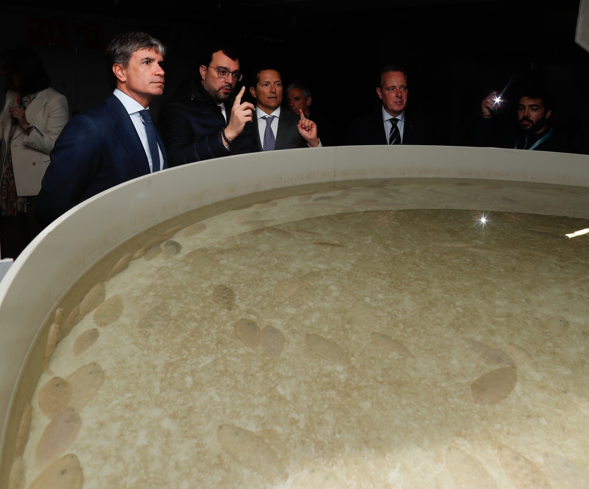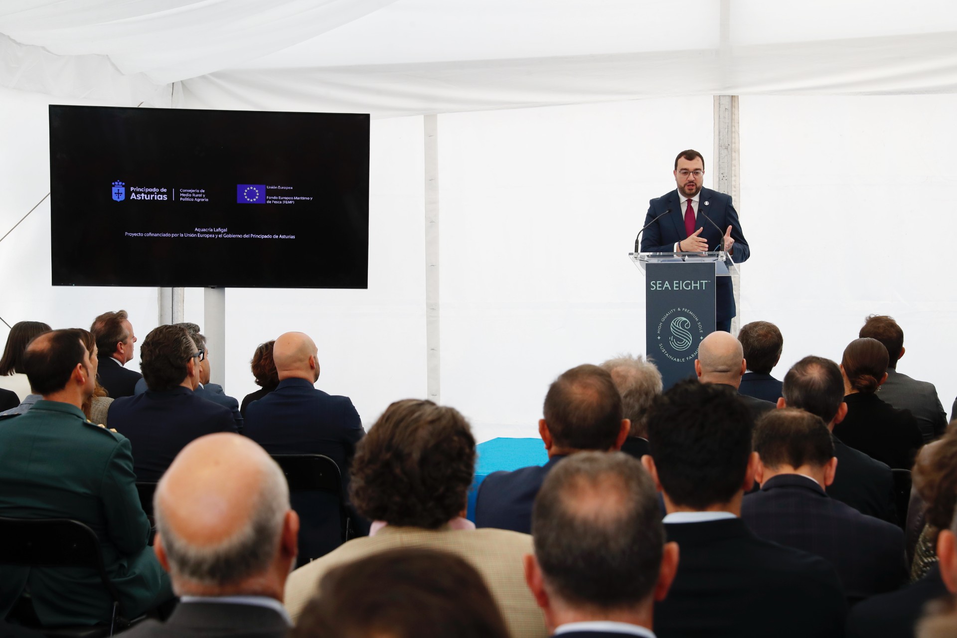 El presidente del Principado de Asturias, Adrián Barbón, ha intervienido hoy en el acto de inauguración de la planta de engorde de lenguado de la empresa Sea Eight en el puerto de El Musel.
