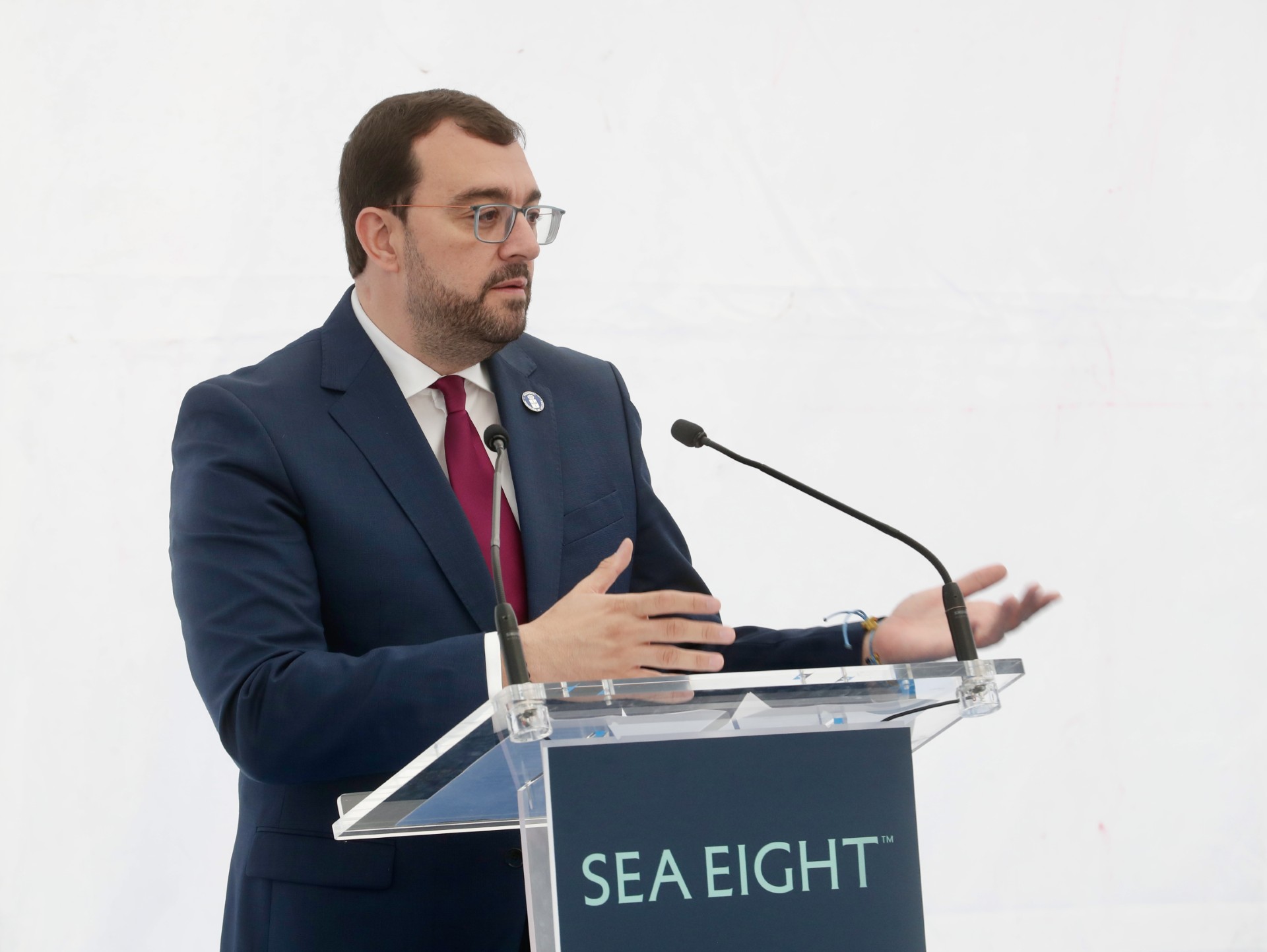 En la imagen (de izqda. a dcha.): el consejero de Movilidad, Medio Ambiente y Gestión de Emergencias, Alejandro Calvo; el consejero delegado de Sea Eight, Jaime León; la alcaldesa de Gijón, Carmen Moriyón; el presidente del Principado de Asturias, Adrián Barbón; el presidente del Grupo Atitlan, Roberto Centeno; el consejero de Medio Rural y Política Agraria, Marcelino Marcos, y la presidenta de la Autoridad Portuaria de Gijón, Nieves Roqueñí.