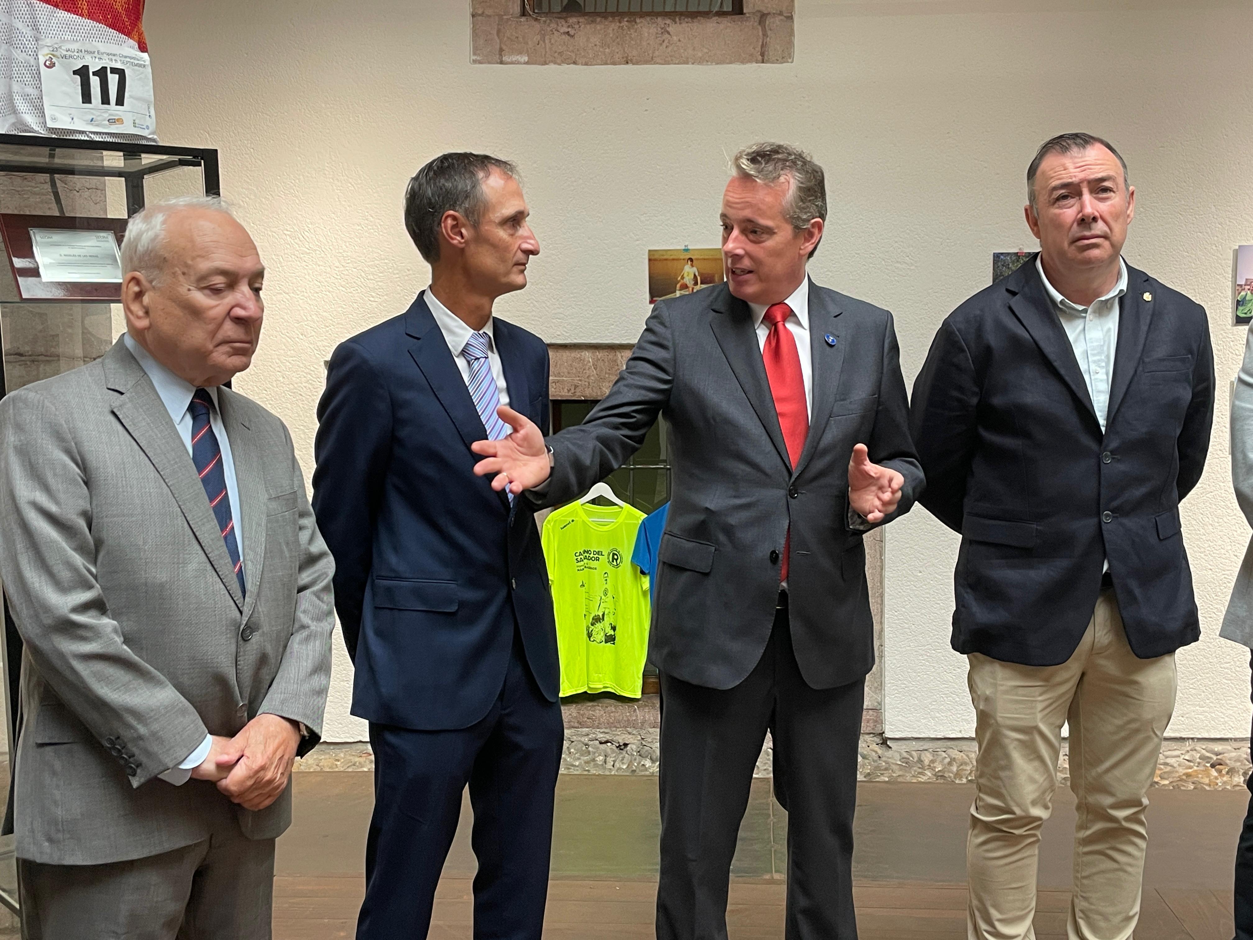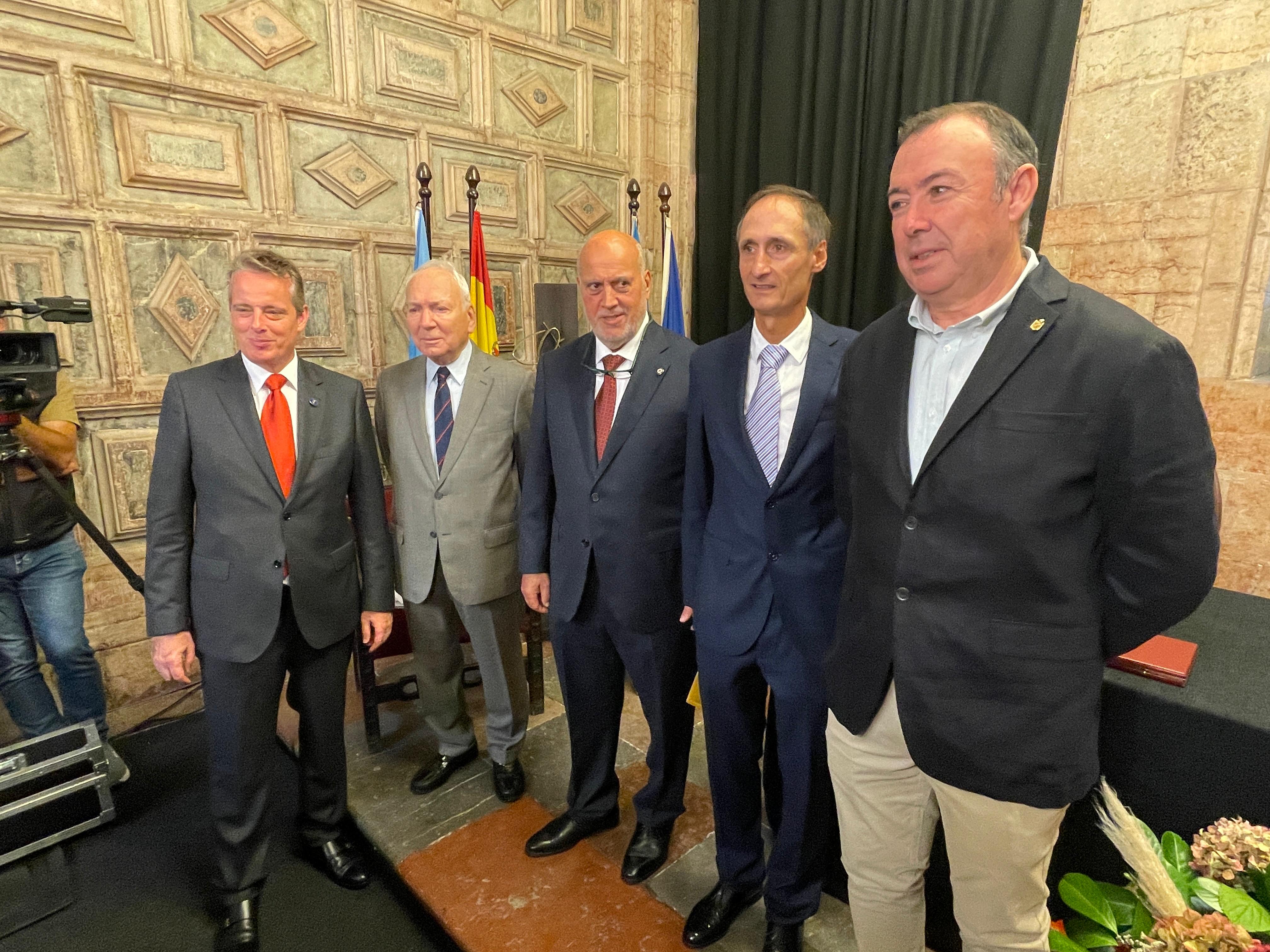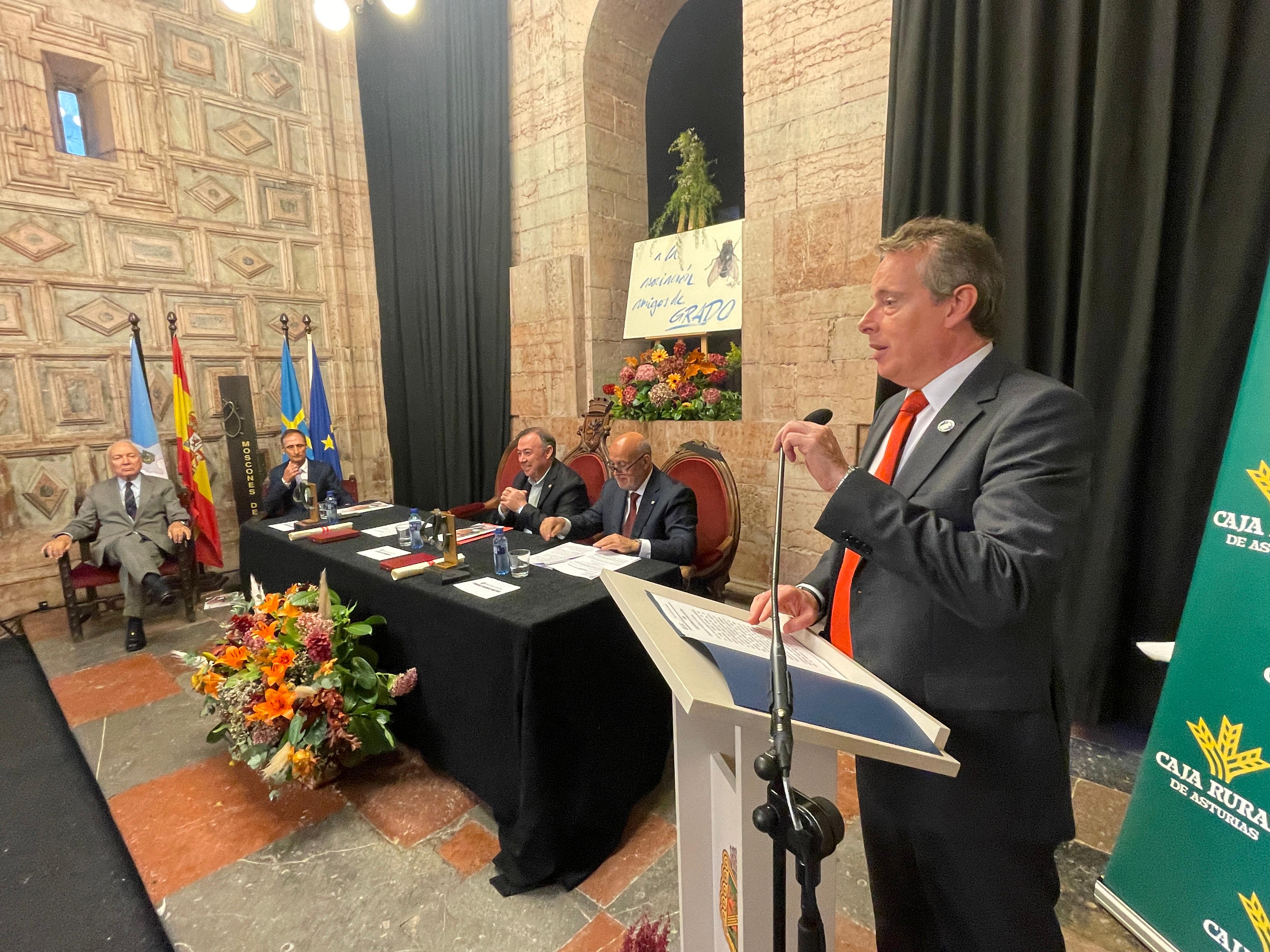 En la imagen (de izqda. a dcha.): el empresario Francisco Rodríguez, fundador de Industrias Lácteas Asturianas, Moscón de Oro Nacional e Internacional; el farmacéutico y ultrafondista, Nicolás de las Heras, Moscón de Oro Local; el consejero Marcelino Marcos, y el alcalde de Grado, José Luis Trabanco.