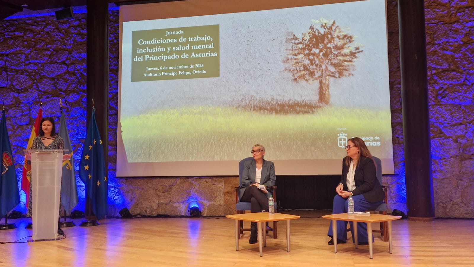 La consejera de Salud, Concepción Saavedra ( en el atril),   y la directora del Instituto Asturiano de Prevención de Riesgos Laborales, Miryam Hernández, han participado en la inauguración de la jornada 'Condiciones de trabajo, inclusión y salud mental del Principado de Asturias', foro enmarcado en una de las líneas del Plan de Salud Mental 2023-2030 del Principado.