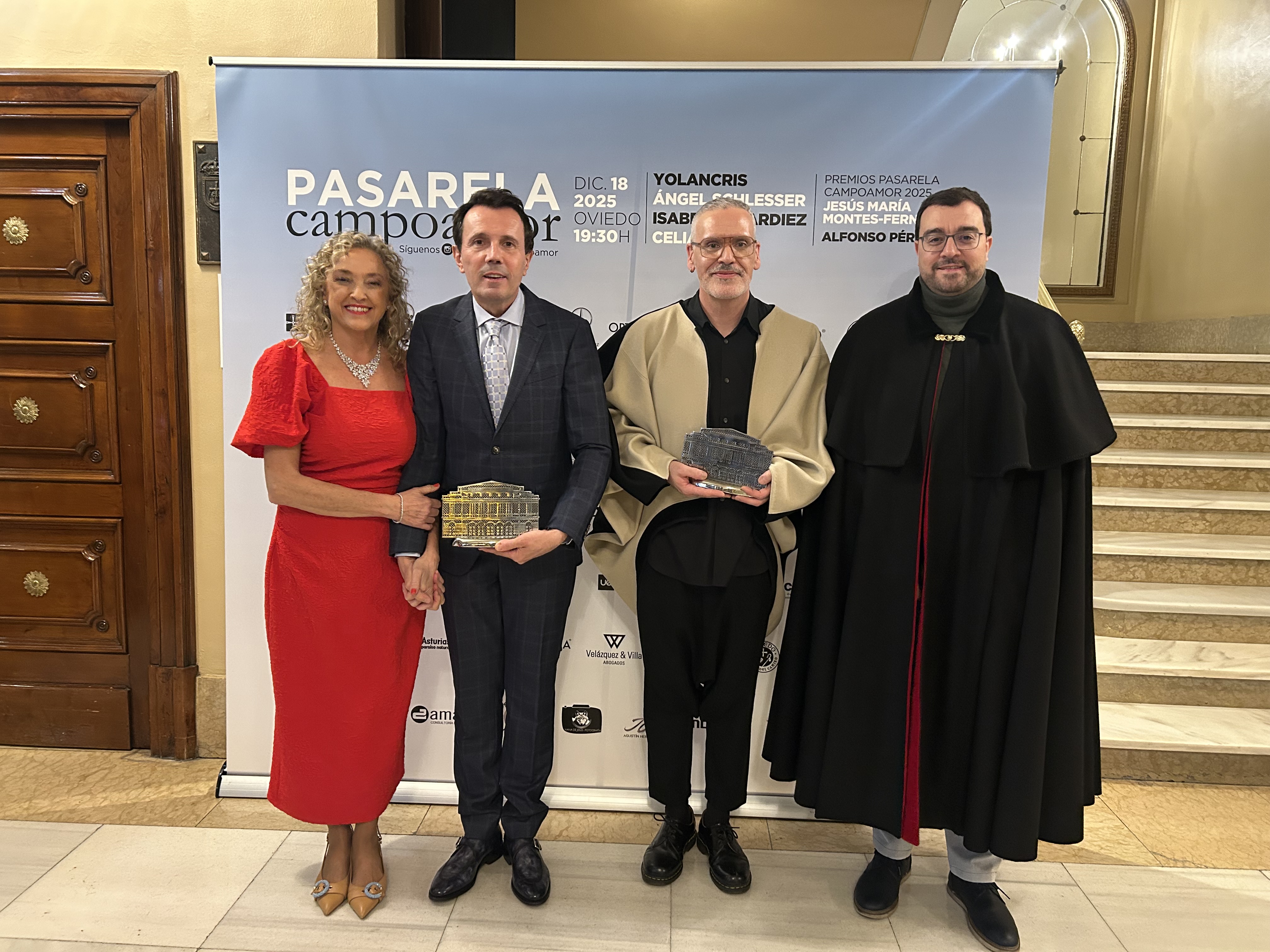 La directora de la Pasarela Campoamor, Graciela Súarez; los premiados Jesús María Montes, del programa de TVE Flash-Moda y el director creativo de Ángel Schelesser, Alfonso Pérez, y el presidente del Principado de Asturias, Adrián Barbón.