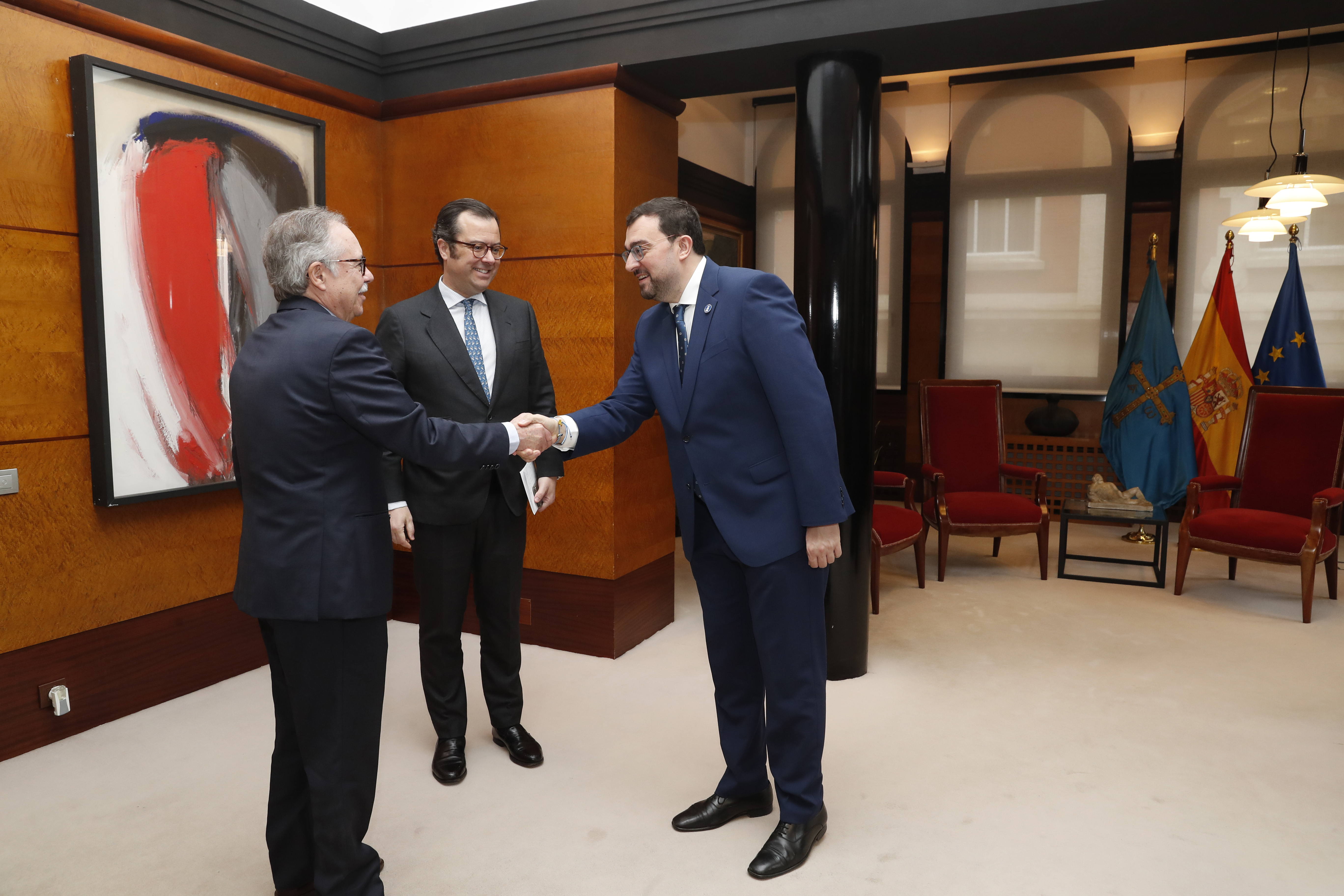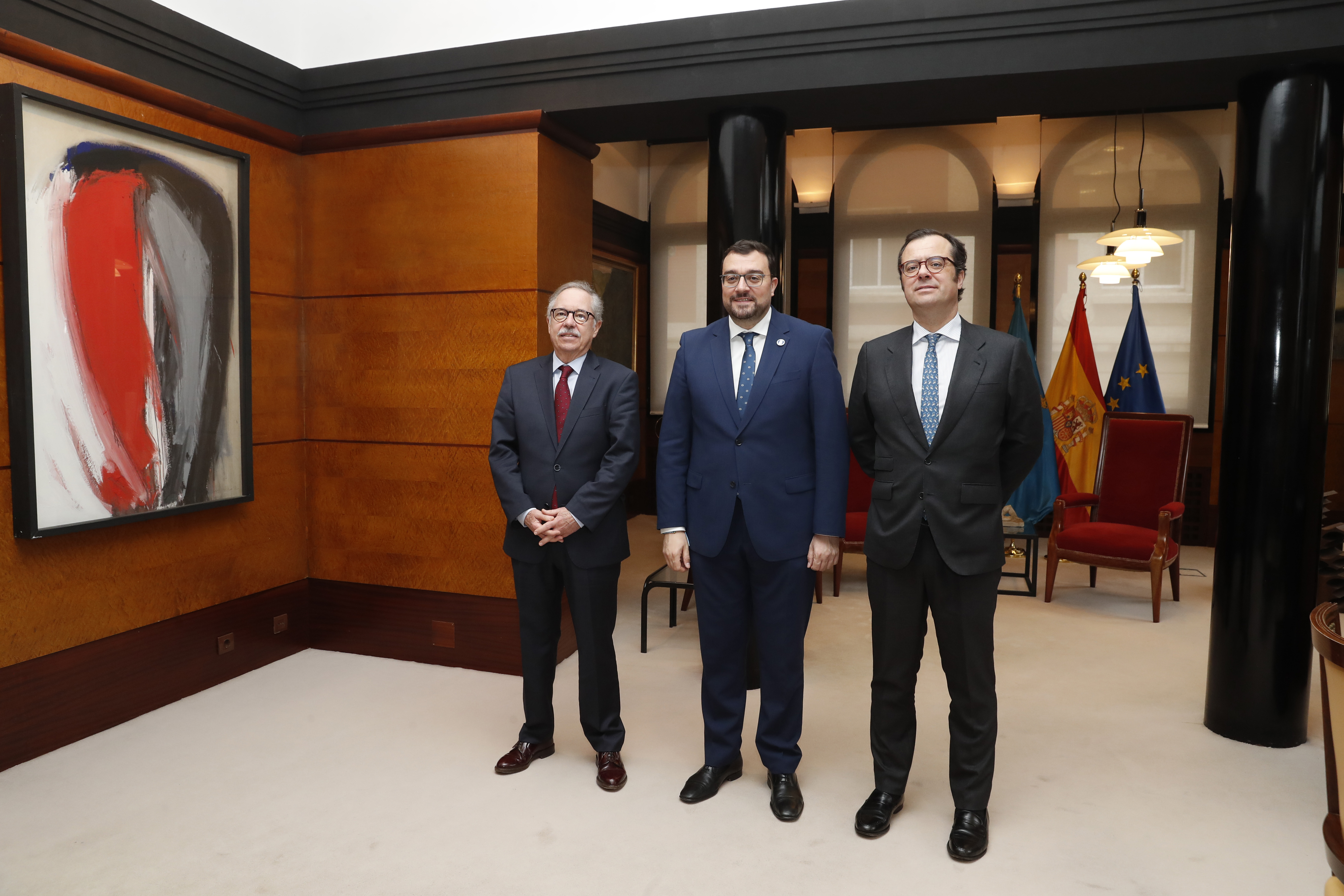 De izquierda a derecha, el vocal del Consejo General del Poder Judicial (CGPJ), Bernardo Fernández; el presidente del Principado de Asturias, Adrián Barbón, y el segundo vocal asturiano en el CGPJ, Alejandro Abascal.
