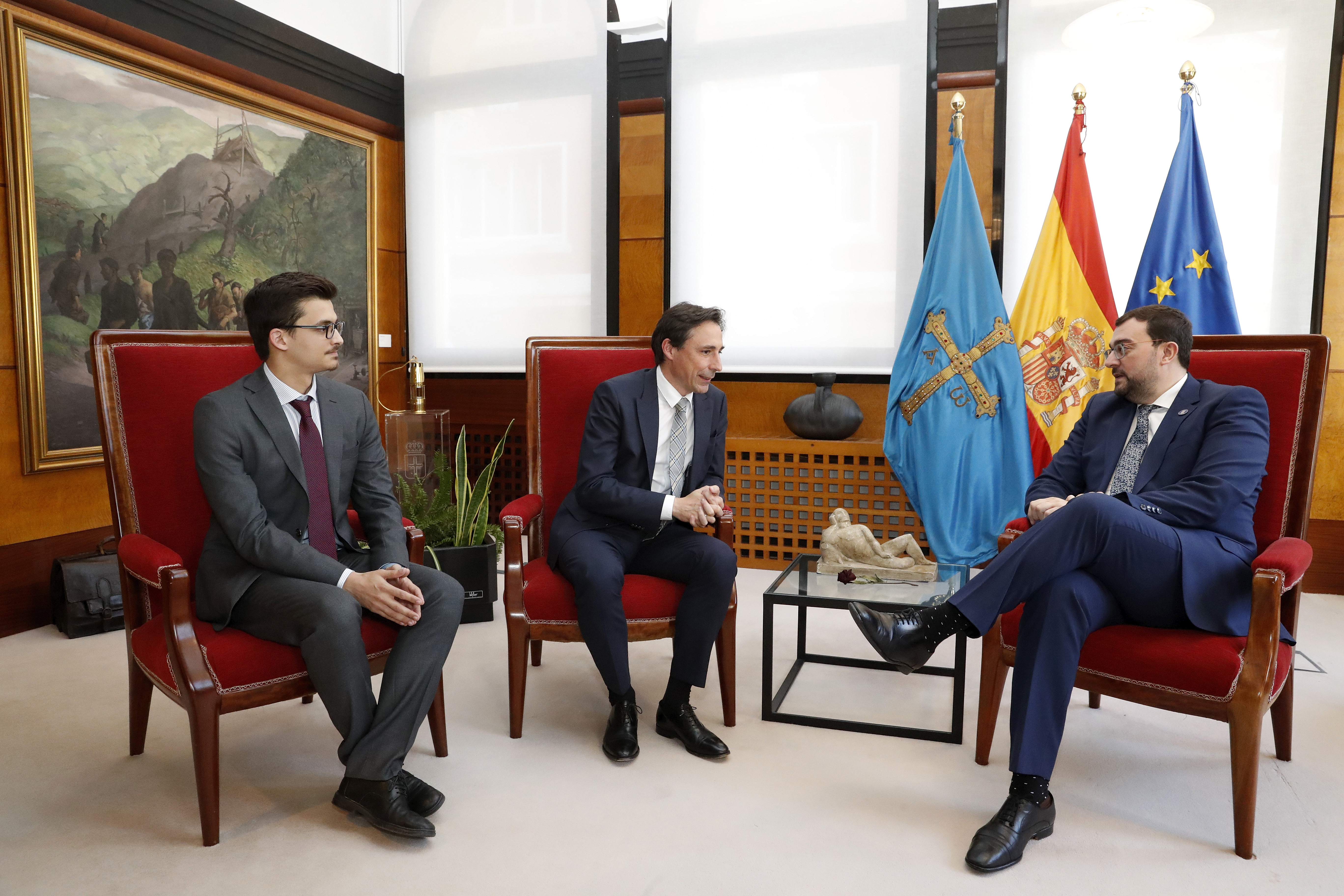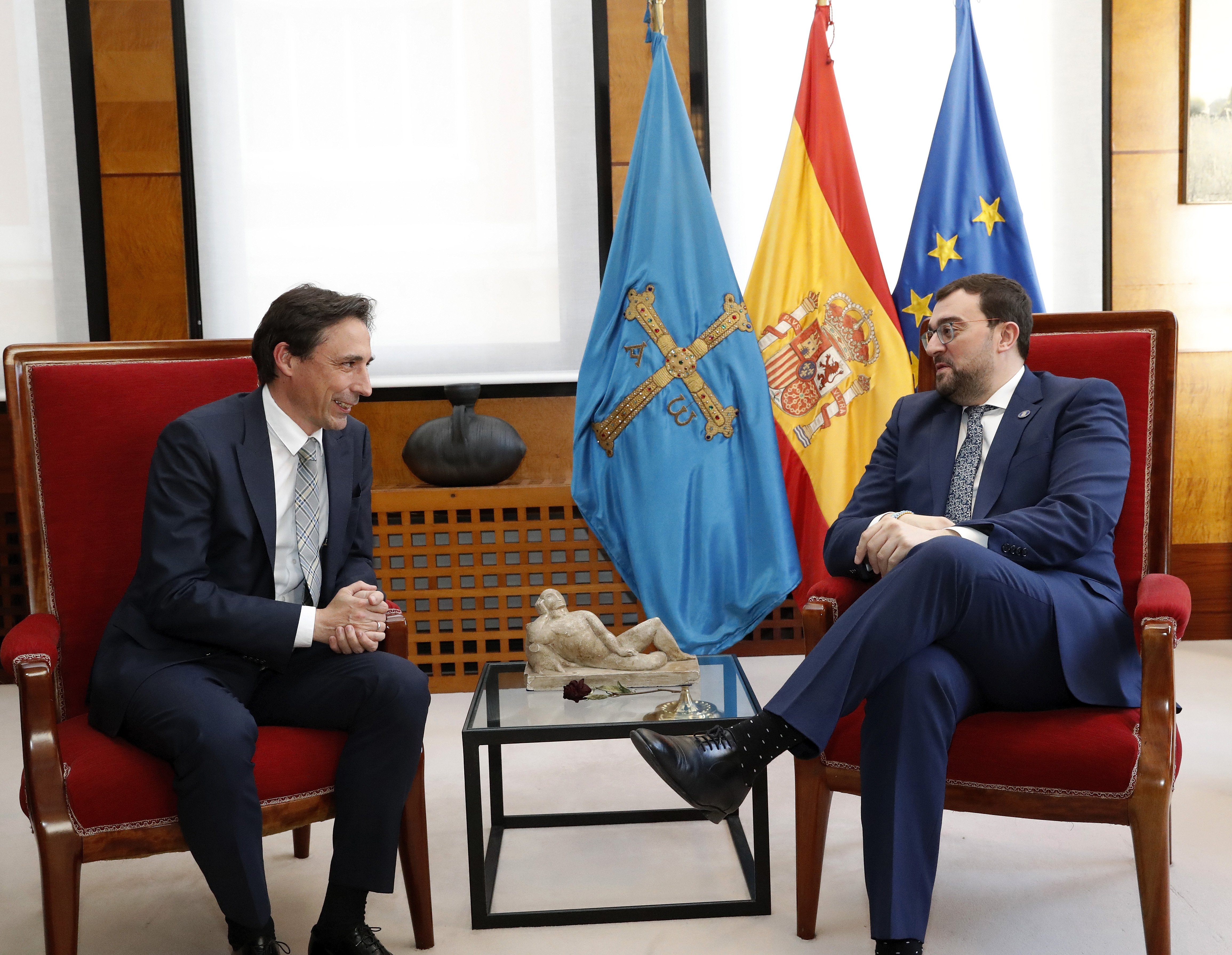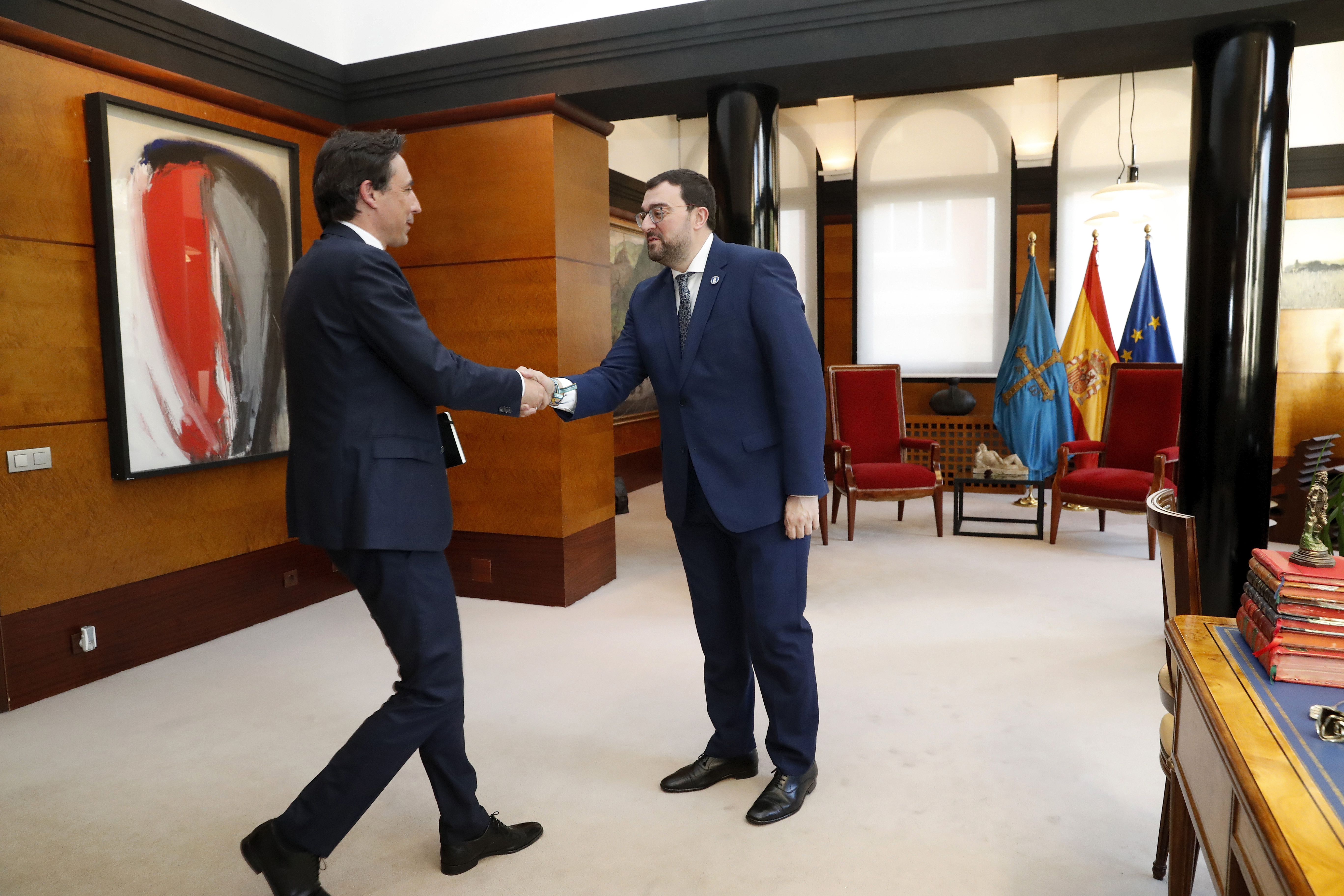 En la imagen, el presidente del Principado, Adrián Barbón (a la derecha), recibe al presidente de Microsoft España, Paco Salcedo.
