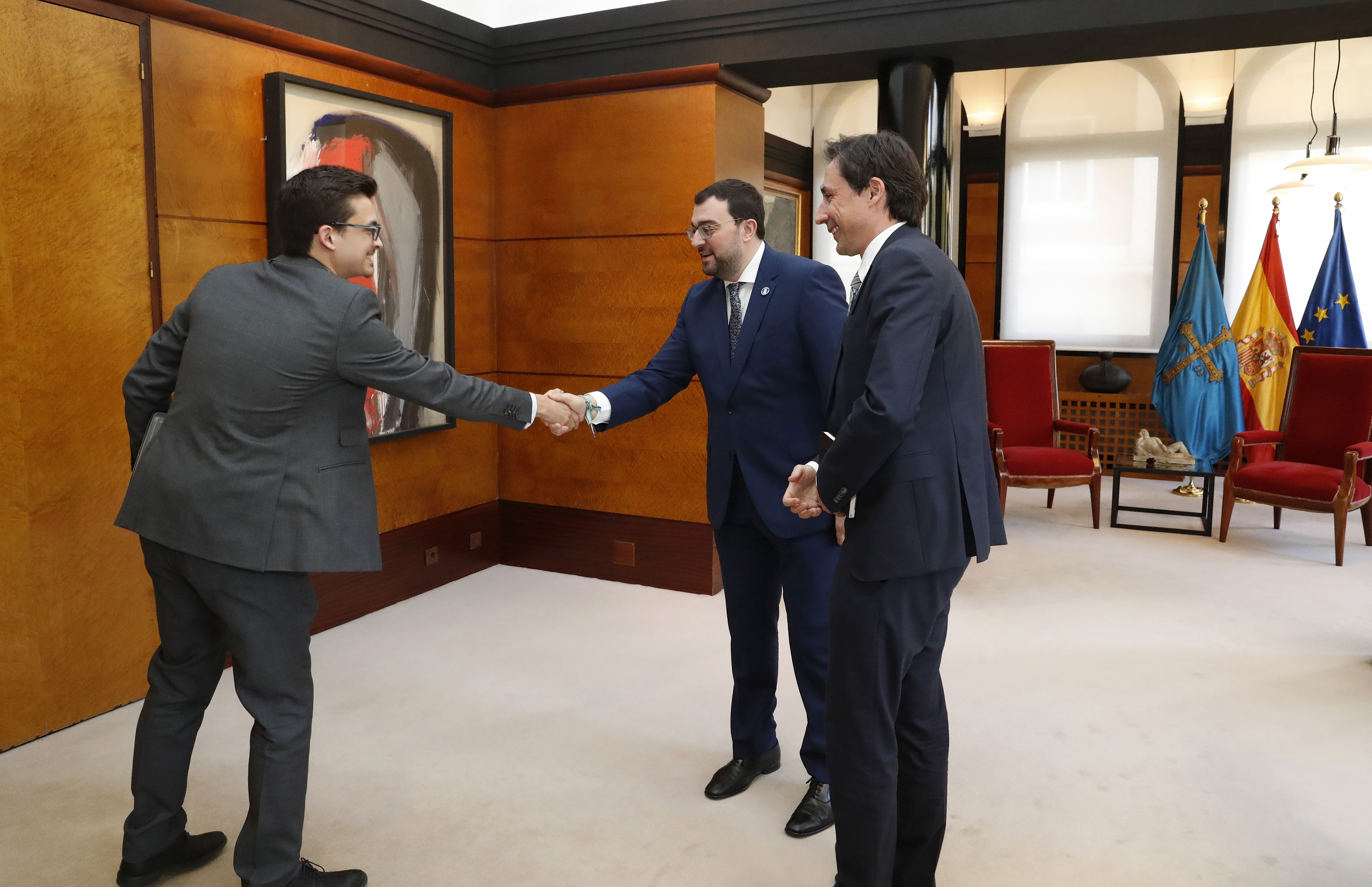 Adrián Barbón saluda al ejecutivo de la multinacional tecnológica, Gonzalo de la Torre, en presencia del presidente de la entidad en España.