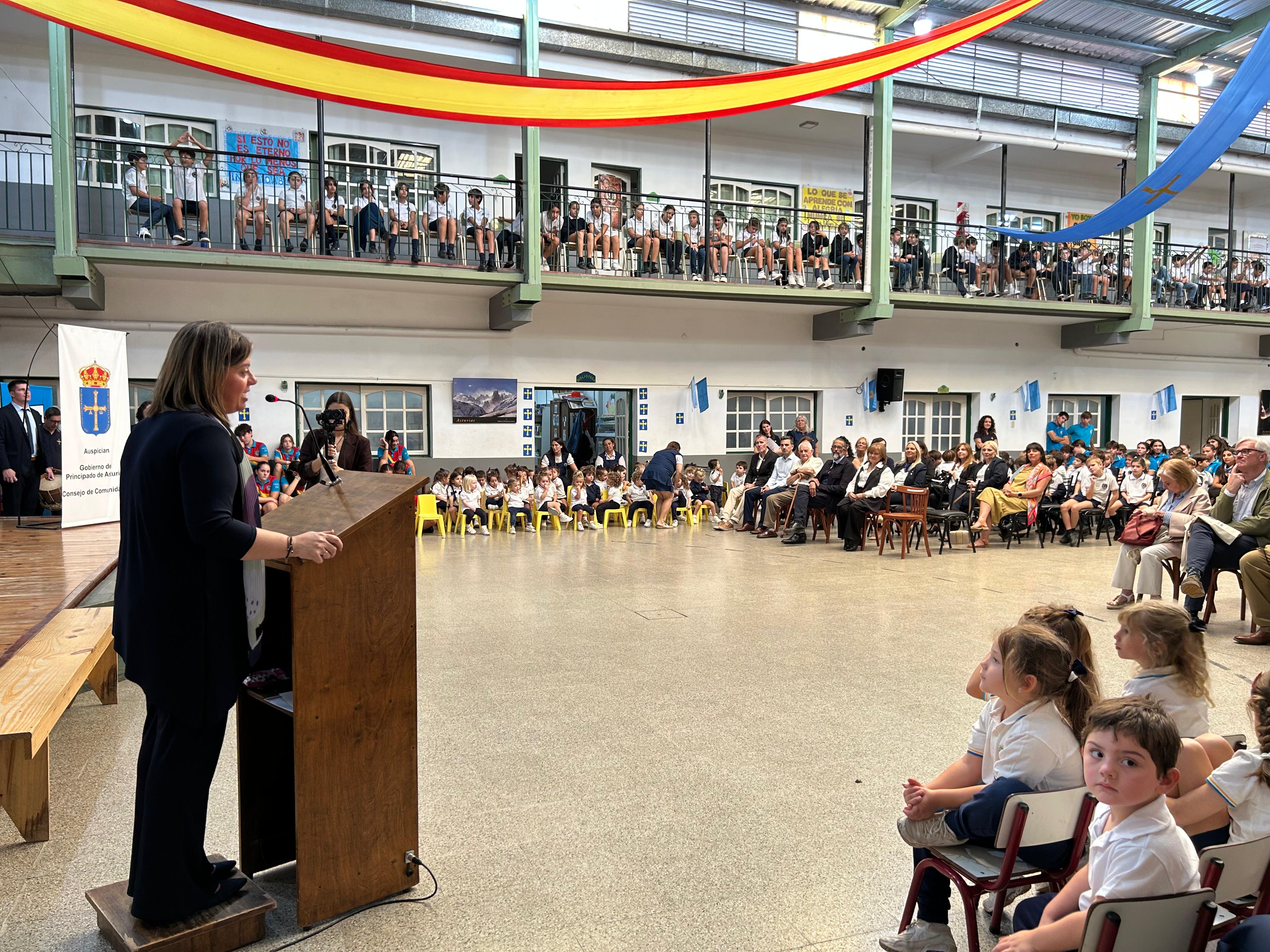La vicepresidenta del Principado, Gimena Llamedo, entrega a la presidenta del Centro Asturiano de Santa Fe, Lila Magdalena, el símbolo de Asturias Paraíso Natural, ante la atenta mirada del cónsul, Pablo Platas.