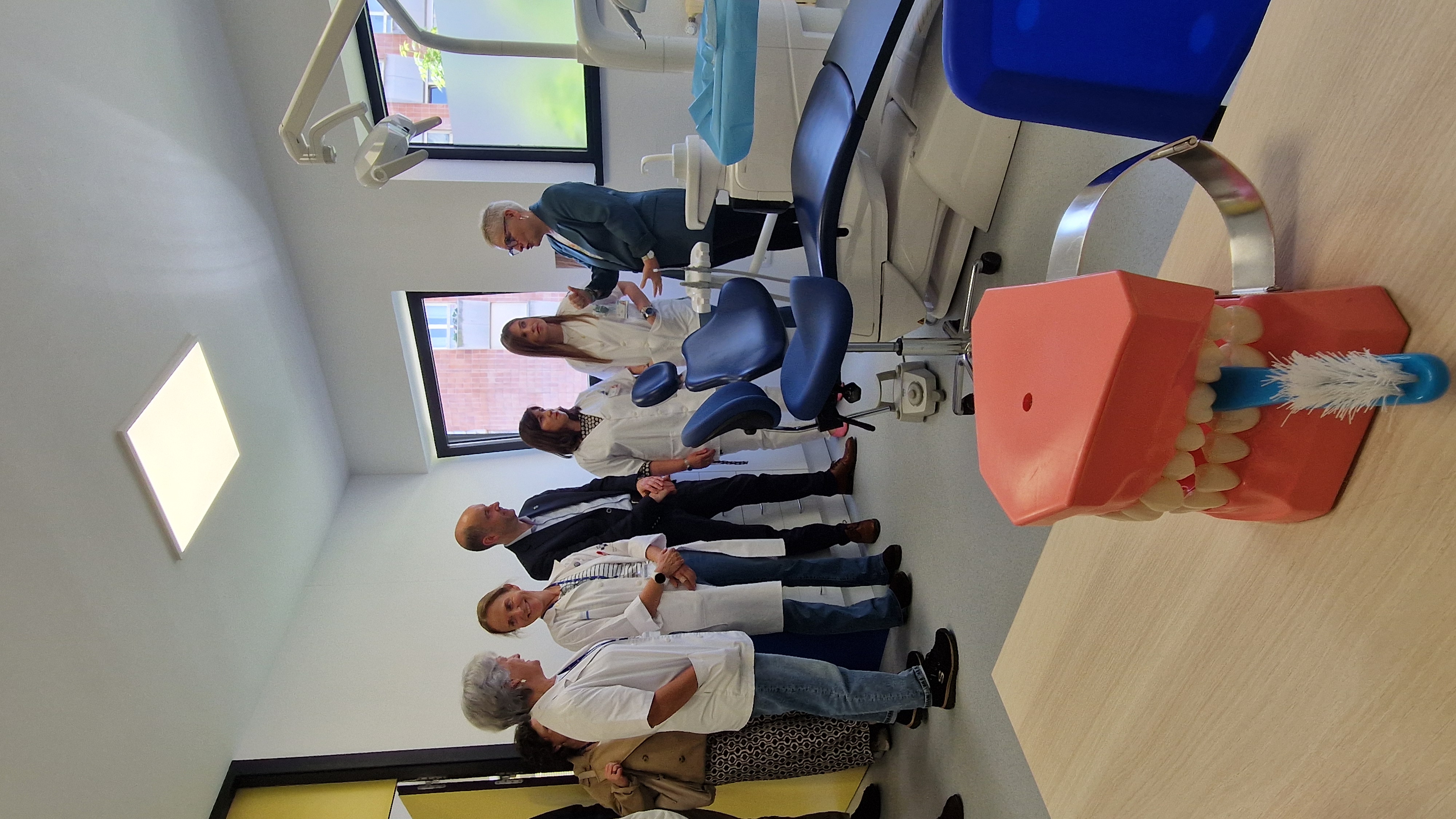De izquierda a derecha, la gerente del área III Oriente, María Luisa Sánchez; la odontóloga, María Fernández Cancio; el viceconsejero de Política Sanitaria, Pablo García; la higienista, Sonia Álvarez Ordiales; y la consejera de Salud, Concepción Saavedra.