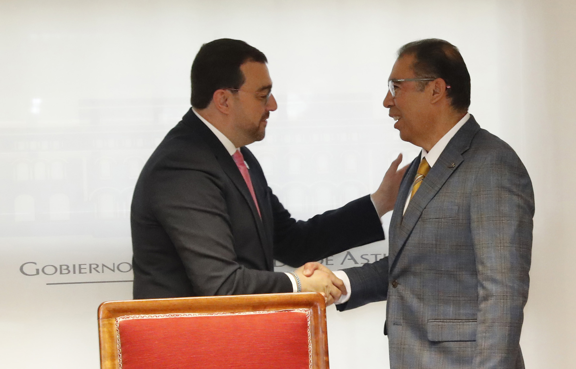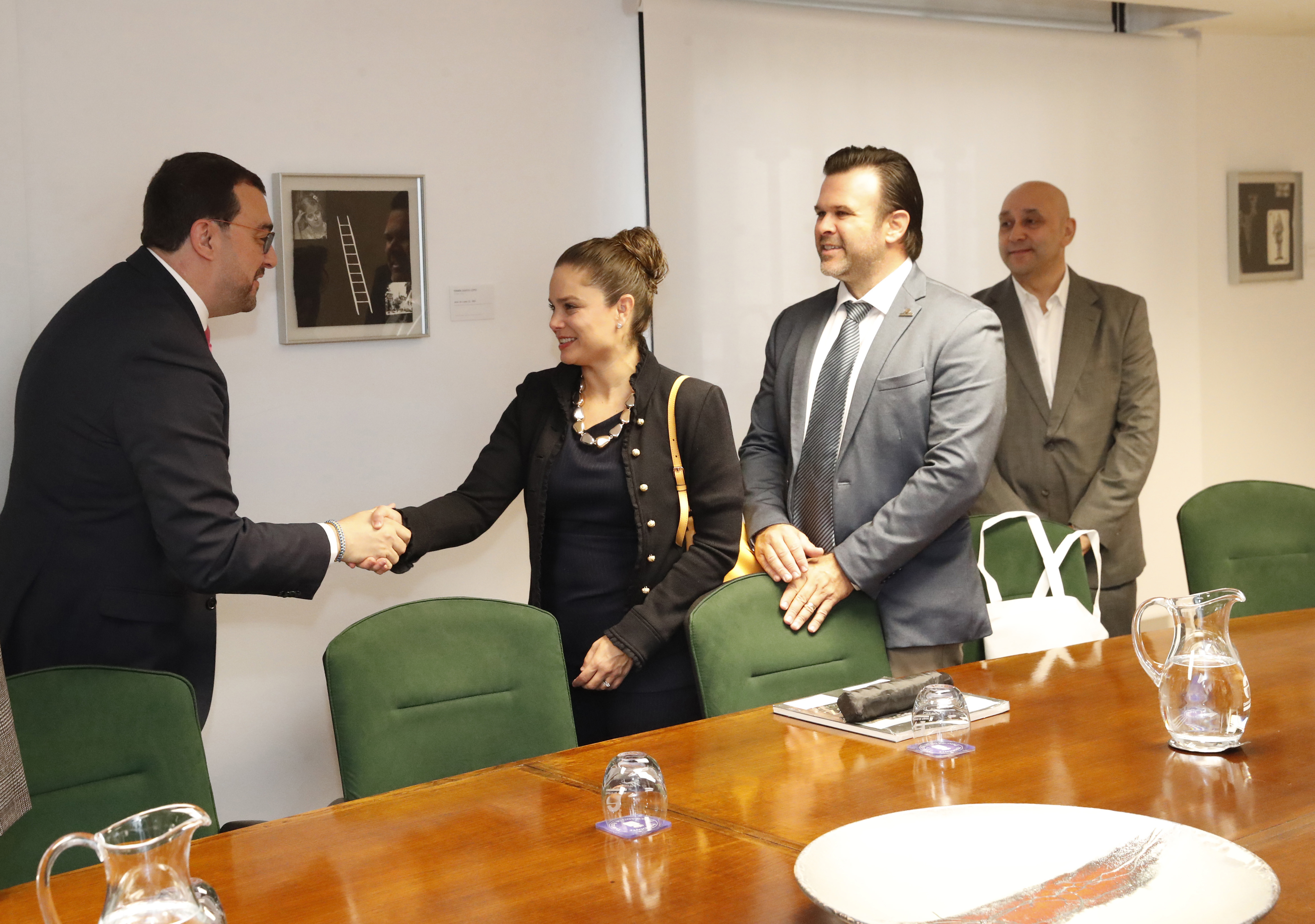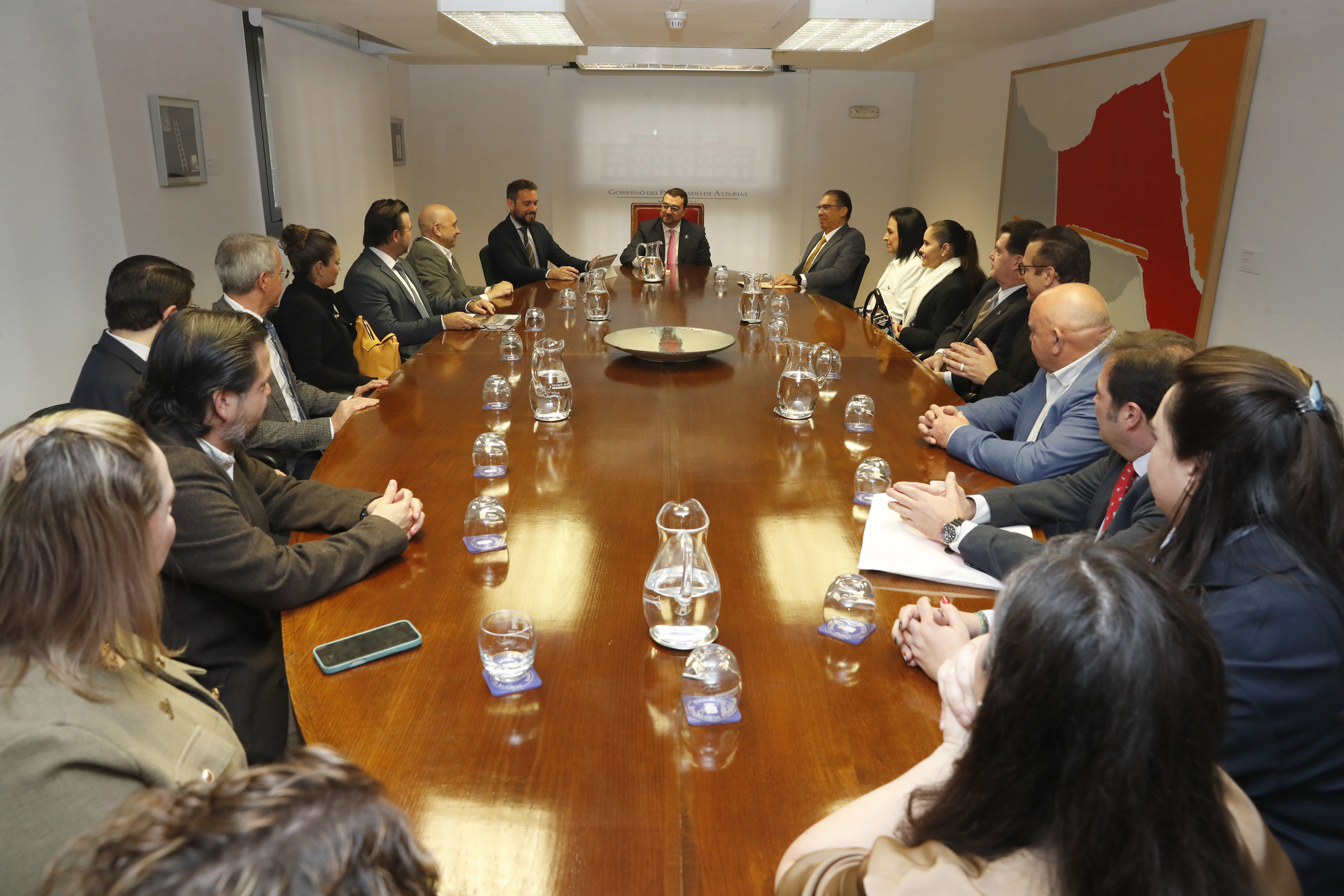 En la imagen, el presidente del Principado, Adrián Barbón (al fondo, presidiendo la mesa), y el director de la Oficina Económica de la Presidencia, José Sicre (a su derecha), junto a la delegación de Veracruz de la Confederación Patronal de la República Mexicana (Coparmex) y a representantes de Casintra.