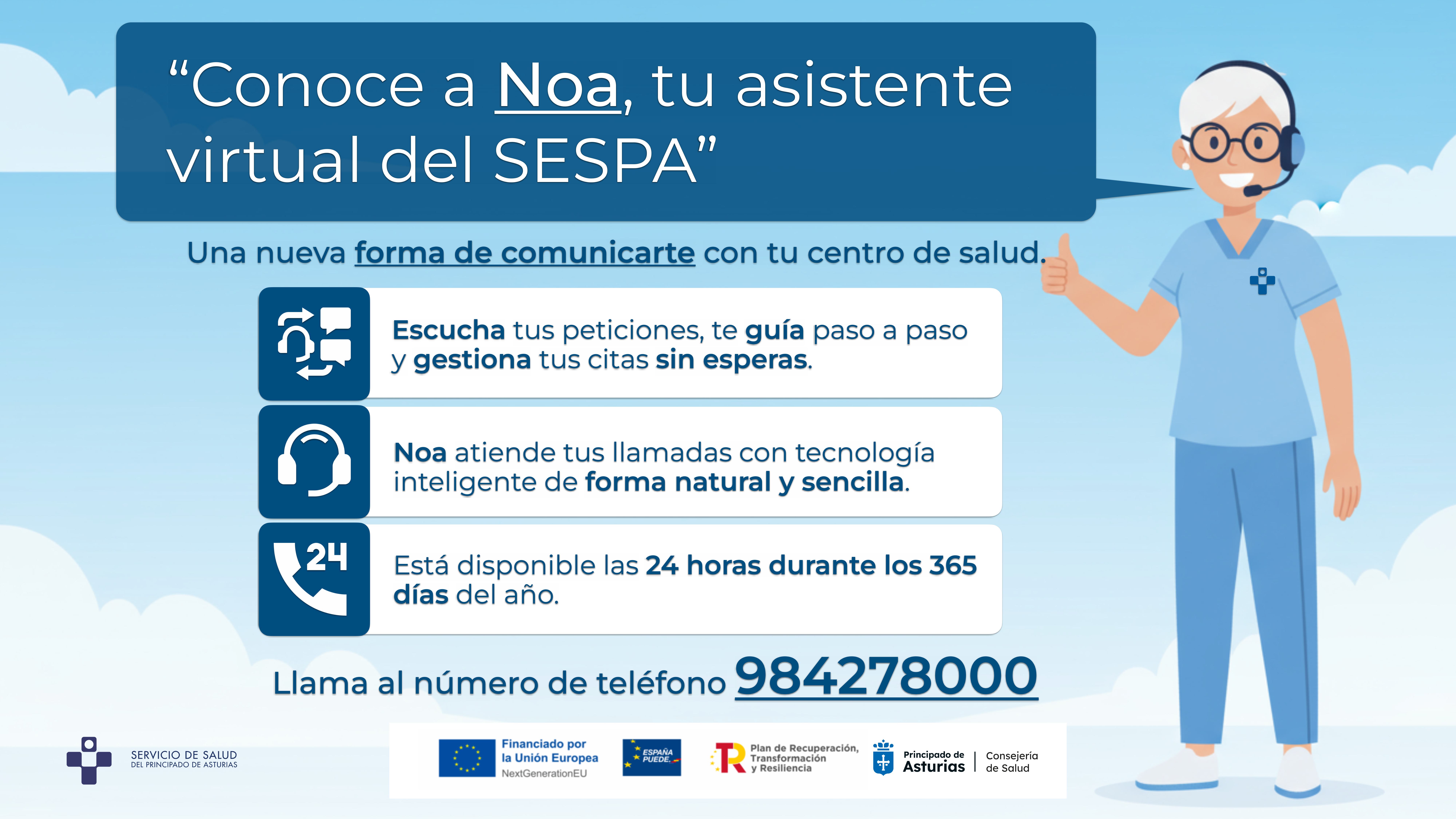 El Servicio de Salud del Principado (Sespa) pondrá en marcha mañana, martes 3 de marzo, el agente virtual Noa, un modelo de atención telefónica que permite obtener citas con profesionales de la red de primaria, las 24 horas del día, los siete días de la semana. El sistema, basado en la inteligencia artificial, opera con un lenguaje natural y refuerza este nivel asistencial de forma accesible, moderna y segura.