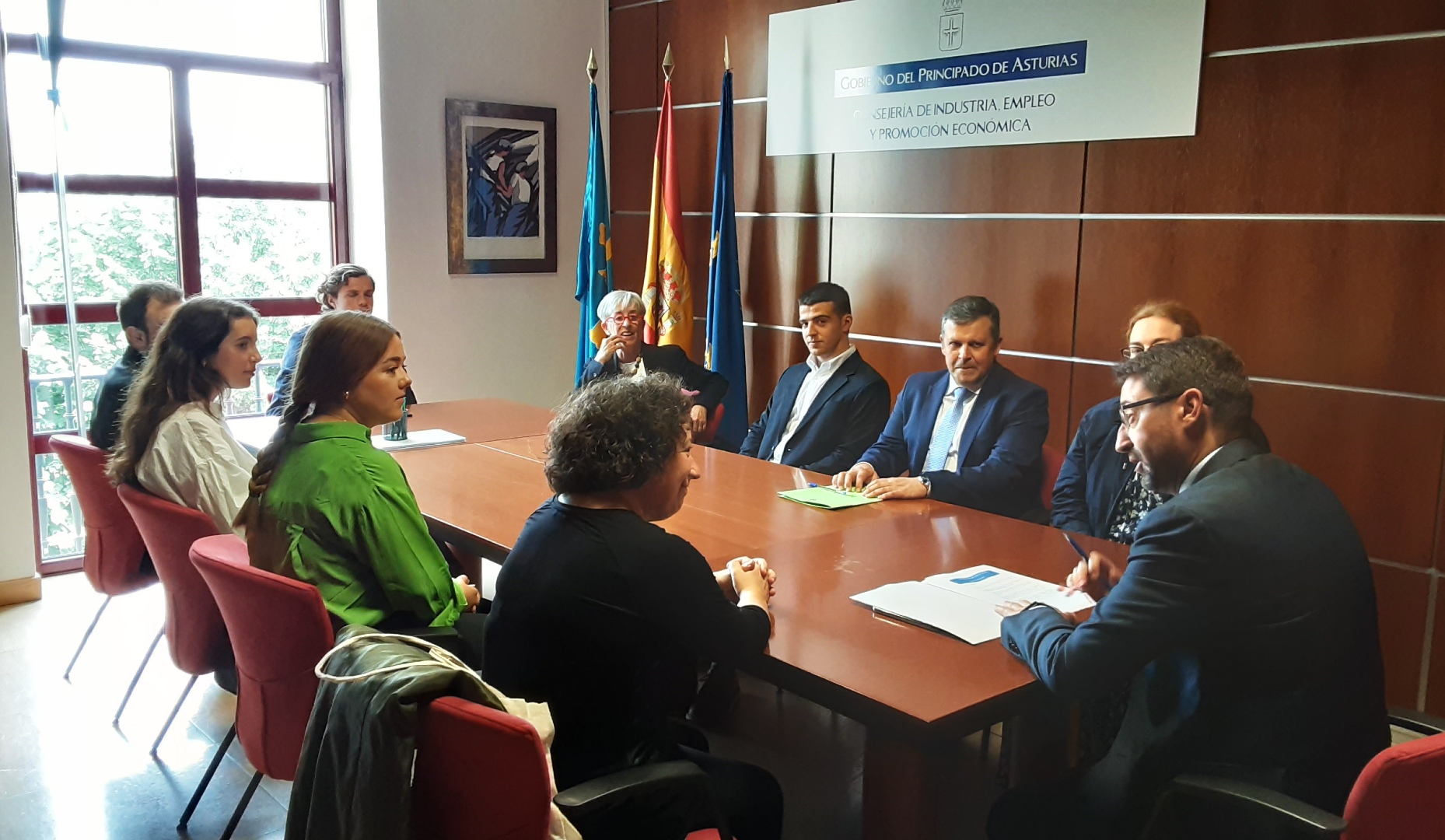 Los jóvenes becarios que iniciarán su andadura internacional en las sedes de las compañías asturianas en el exterior han sido recibidos esta mañana en la sede de la Consejería de Empleo, Industria y Turismo por el consejero y presidente de Asturex, Enrique Fernández; la vicerrectora de Transferencia y Relaciones con la Empresa, Begoña Cueto; la directora de Asturex, Teresa Vigón, y el director de la FUO, Santiago Fernández López.