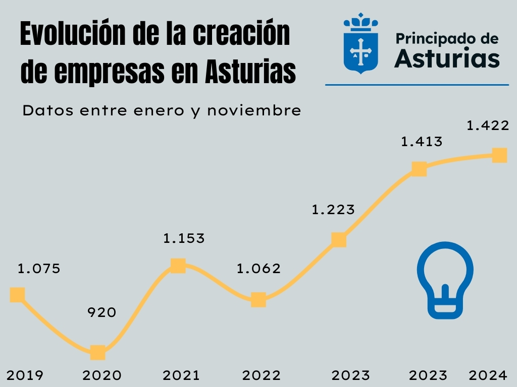 Asturias ha alcanzado un récord histórico en la creación de empresas, con 1.422 nuevas sociedades en los primeros once meses del año. Se trata de la mejor cifra de demografía empresarial desde 2019.