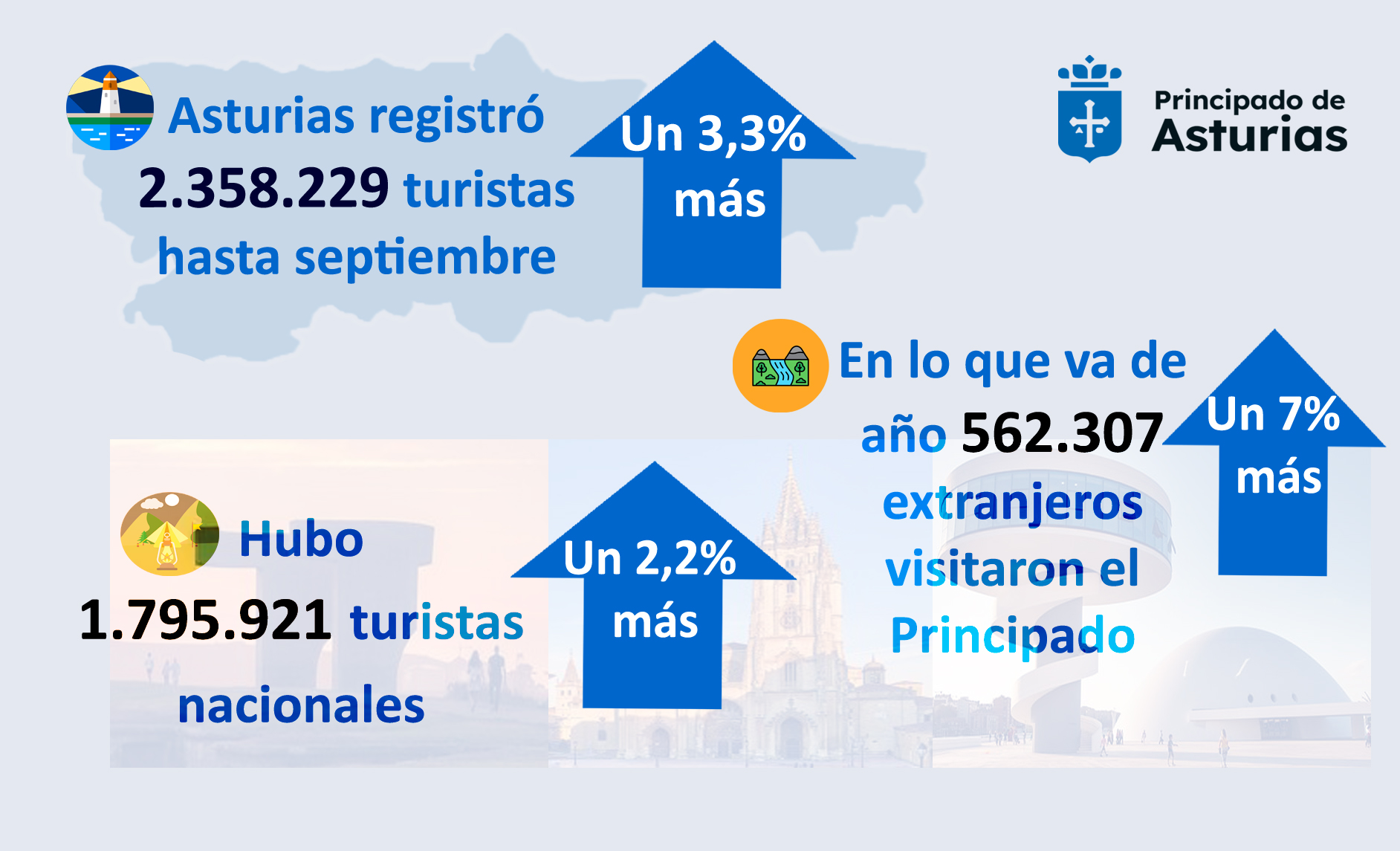 Asturias alcanza un nuevo hito turístico: de enero a septiembre recibió a 2.358.229 visitantes que generaron 5.760.402 estancias en los alojamientos de la comunidad. Se trata de los números más elevados de la serie histórica que elabora el Instituto Nacional de Estadística (INE) y suponen un incremento del 3,3% respecto al número de turistas y del 1,8% en pernoctaciones en comparación con el mismo período del año pasado.