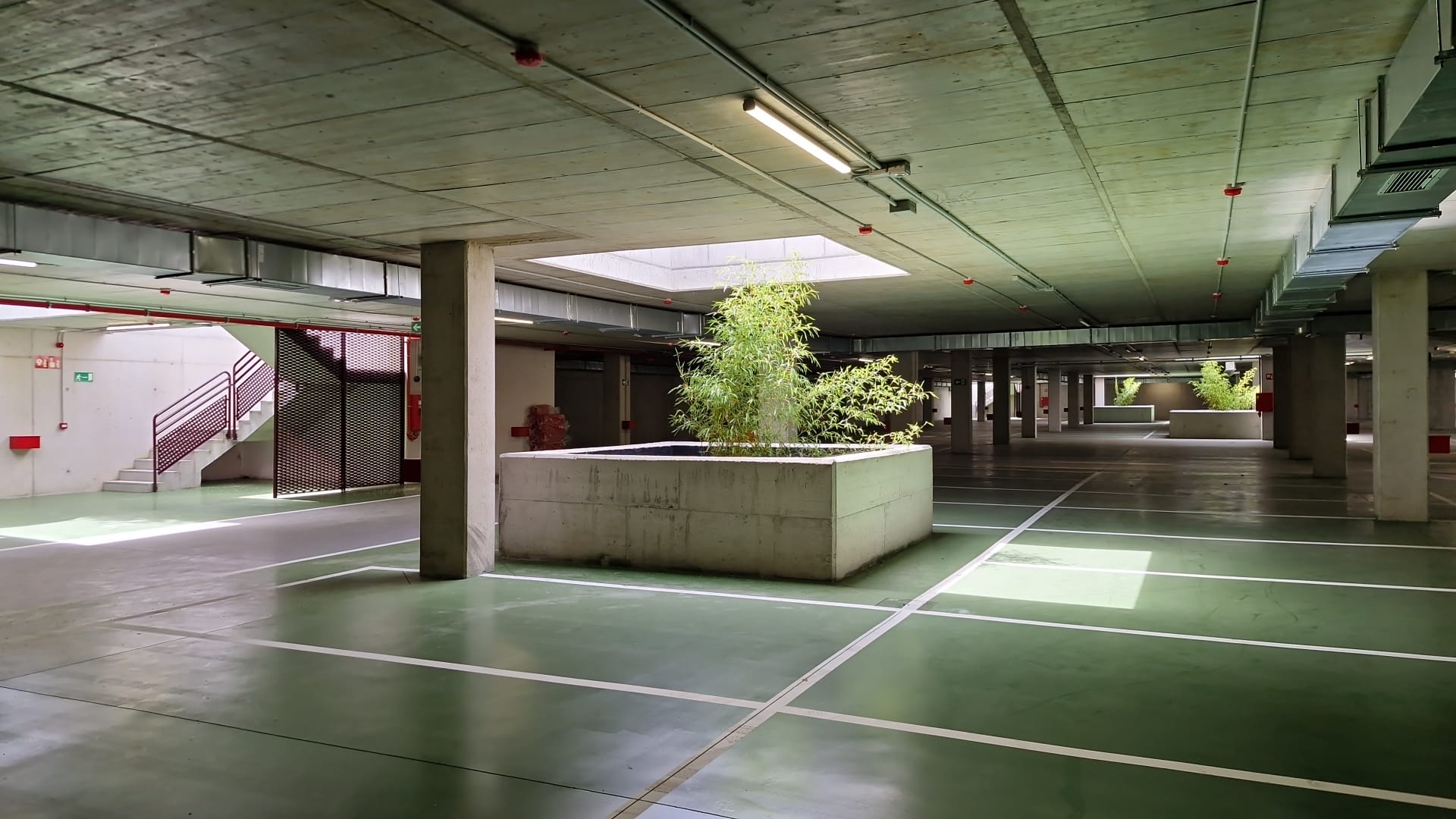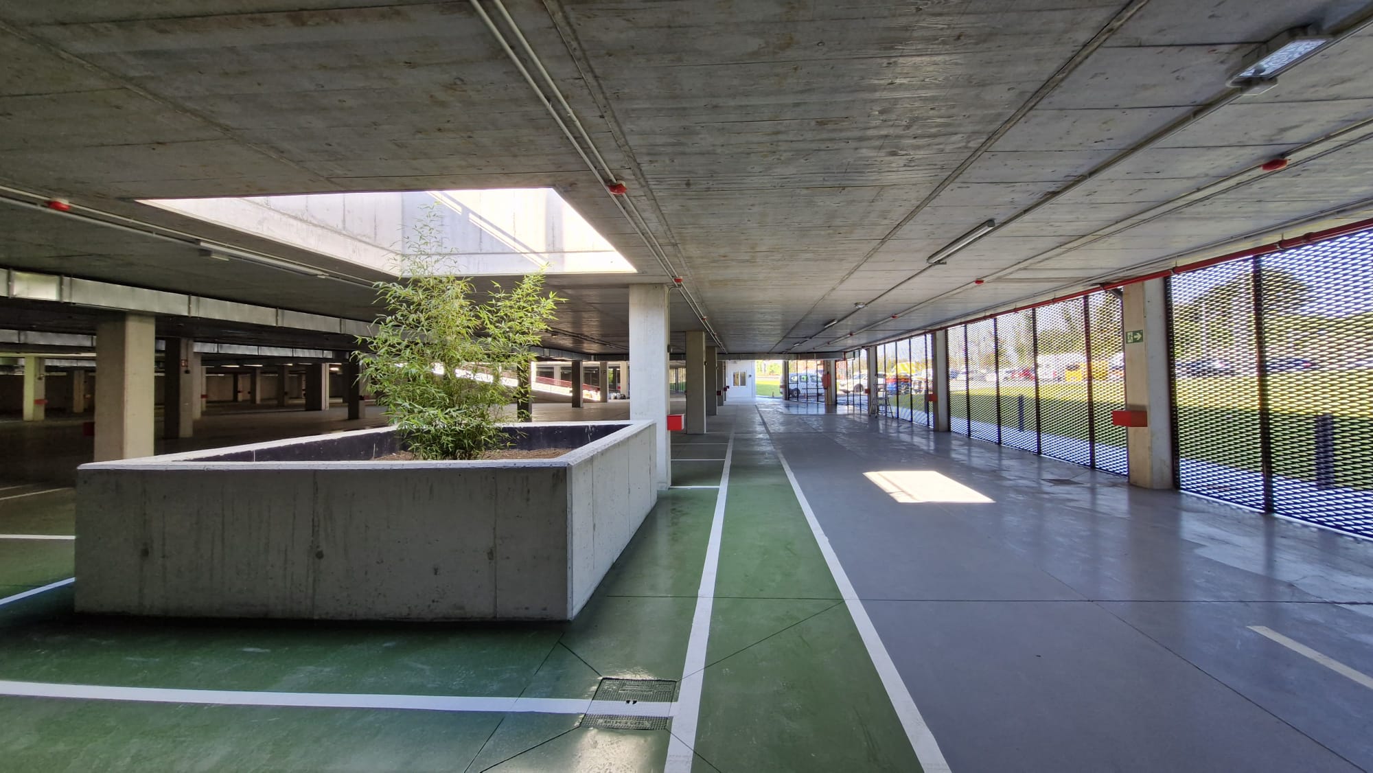 La planta cubierta dispone de 230 plazas, diez de ellas adaptadas para personas con movilidad reducida y 26 con preinstalación para su futura conversión en puntos de recarga para vehículos eléctricos. En la planta semisótano se localizan las 256 plazas restantes. Todas las plazas adaptadas se sitúan en la planta cubierta, próximas al acceso y con salida directa a la calle, mientras que la planta inferior cuenta con acceso mediante ascensor desde la avenida de Portugal para garantizar la plena accesibilidad.
