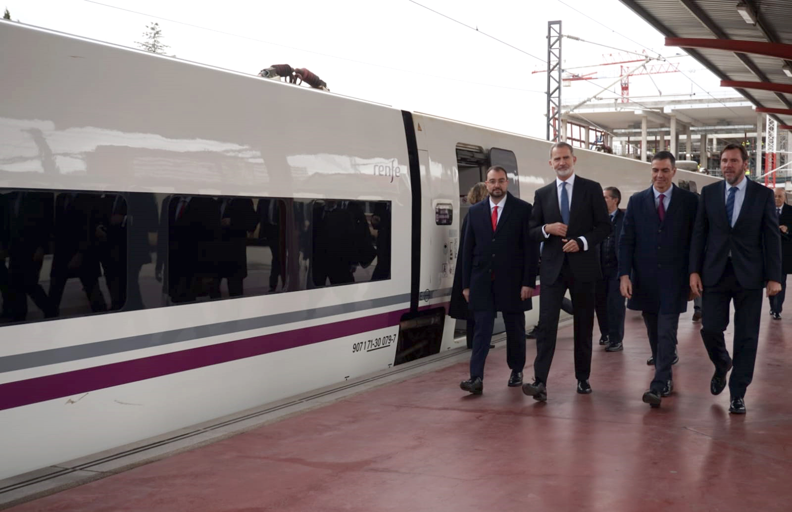 En la imagen (de izqda. a dcha.): el presidente del Principado de Asturias, Adrián Barbón; el rey Felipe VI; el presidente del Gobierno de España, Pedro Sánchez, y el ministro de Transportes y Movilidad Sostenible, Óscar Puente, llegando a la Estación de Madrid - Chamartín - 'Clara Campoamor para iniciar el viaje hacia Asturias en la nueva línea de alta velocidad que inaugurará la variante de Pajares.