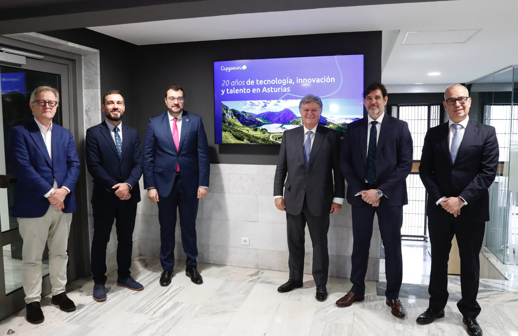 En la imagen (de izqda. a dcha.): el director de la Oficina Económica y Comercial de Asturias en Madrid, José Luis Huerta; el director de la Oficina Económica de la Presidencia, José Sicre; el presidente del Principado, Adrián Barbón; el consejero delegado de Capgemini, Luis Abad; el vicepresidente responsable de operaciones, Javier de la Lama, y el director del centro de Asturias de Capgemini, Juan Luis Lara.