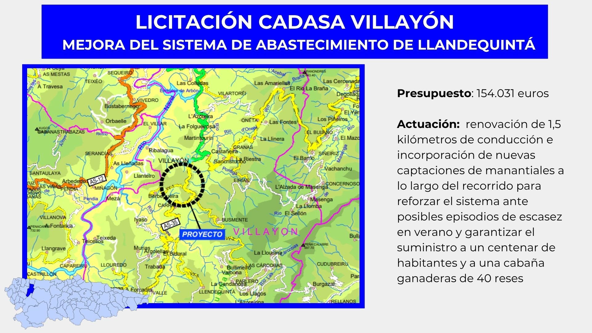 Cadasa licita en 154.000 euros la mejora del sistema de abastecimiento de agua potable de Llandequintá, en Villayón