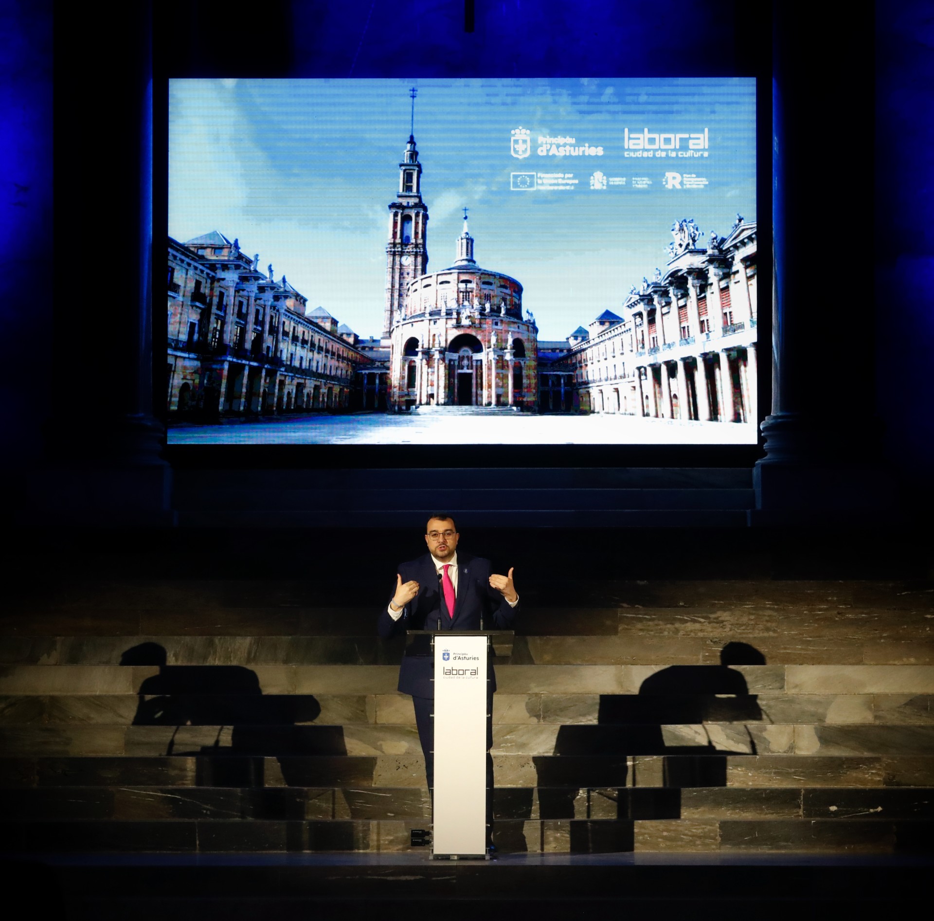 El presidente del Principado ha reivindicado hoy Laboral Ciudad de la Cultura como “foco de creación, estudio y actividad”, al tiempo que ha subrayado su proyección de futuro: “Tenemos claro que hoy, tantos años después de su inicio, y, por un supuesto, con un planteamiento radicalmente distinto, Laboral continúa siendo un proyecto de futuro”. Adrián Barbón ha intervenido esta tarde en la presentación de las obras de restauración de la cúpula del complejo y de la réplica de la Cruz de la Victoria, en las que se han invertido 814.000 euros, financiados en parte con fondos europeos del Mecanismo de Recuperación y Resiliencia (MRR).