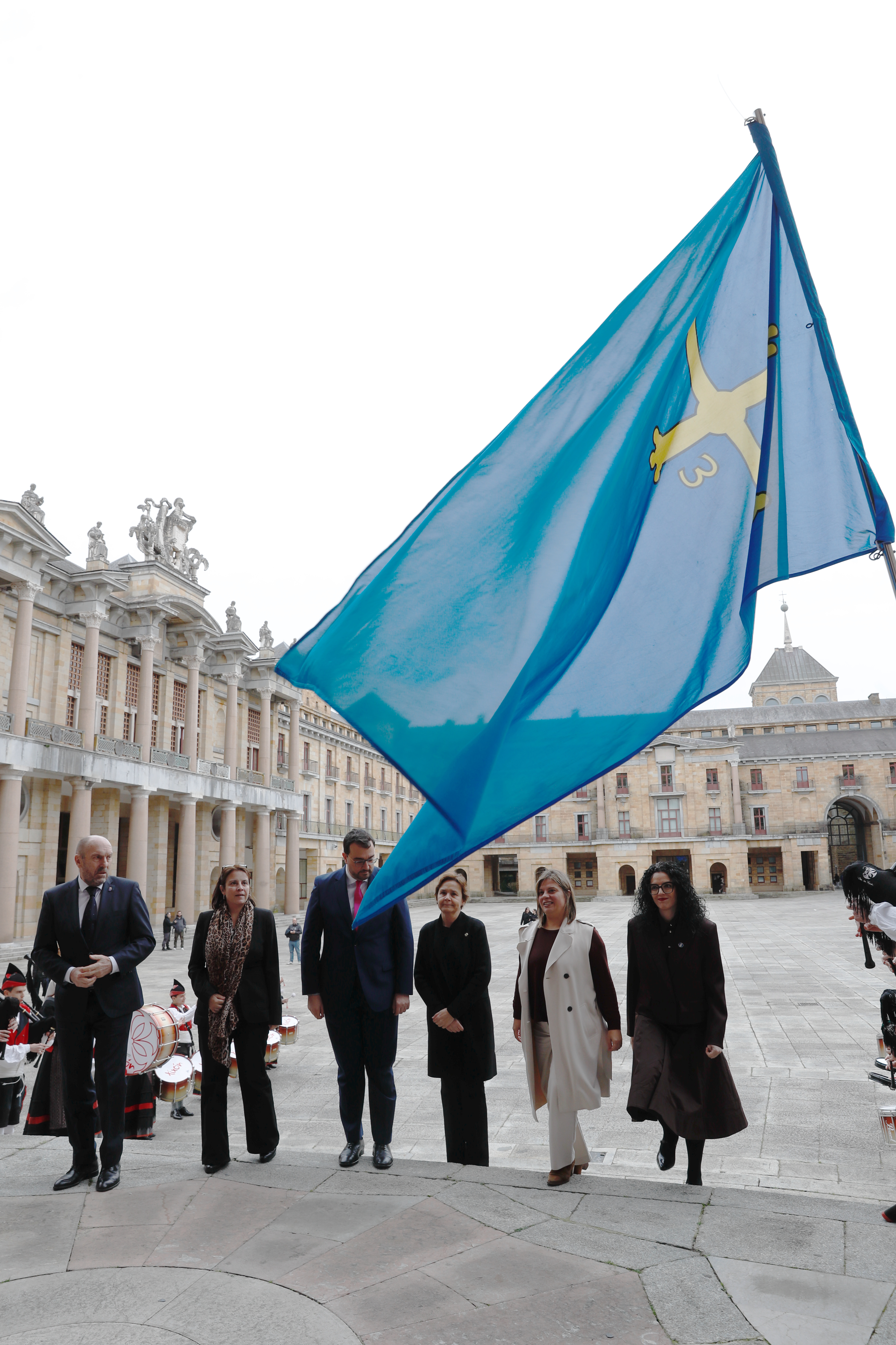 En la imagen (de izqda, a dcha.): el presidente de la Junta General, Juan Cofiño; la delegada del Gobierno, Adriana Lastra; el presidente del Principado, Adrián Barbón; la alcaldesa de Gijón, Carmen Moriyón; la vicepresidenta del Principado, Gimena Llamedo, y la consejera de Cultura, Política Llingüística y Deporte, Vanessa Gutiérrez.