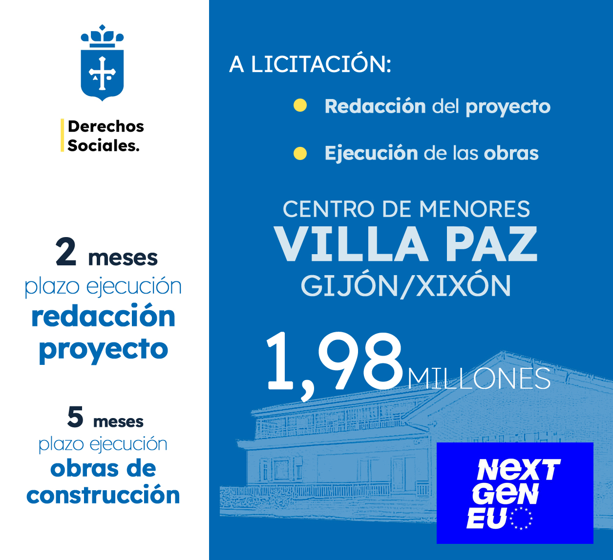 La Consejería de Derechos Sociales y Bienestar ha sacado hoy a licitación, por 1.948.559 euros, la redacción del proyecto y la ejecución de las obras del nuevo centro de menores Villa Paz, en Gijón/Xixón. Se prevé que los trabajos concluyan a finales de este año.