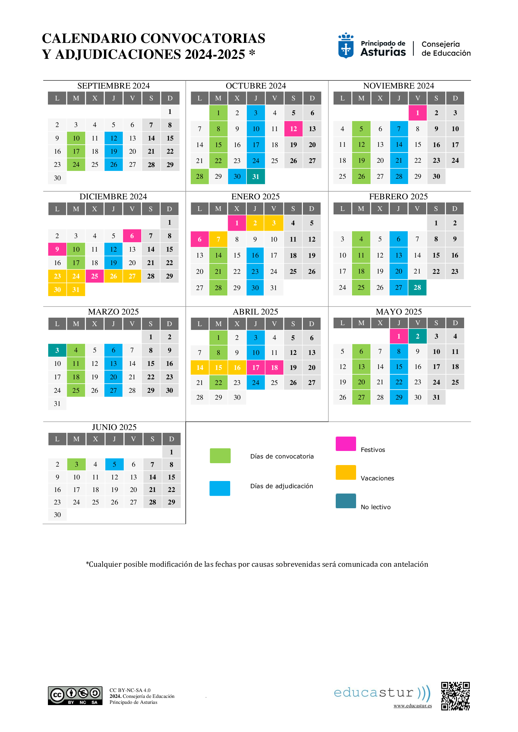 La Consejería de Educación ha publicado, por cuarto año consecutivo, un calendario de adjudicaciones de personal interino para todo el curso. En total, consta de 34 convocatorias, incluidas las cinco ya celebradas, lo que supone una más que el curso pasado. Las ordinarias se mantendrán los martes no festivos y las extraordinarias, cuando surjan necesidades imprevistas. El documento está disponible en el portal www.educastur.es