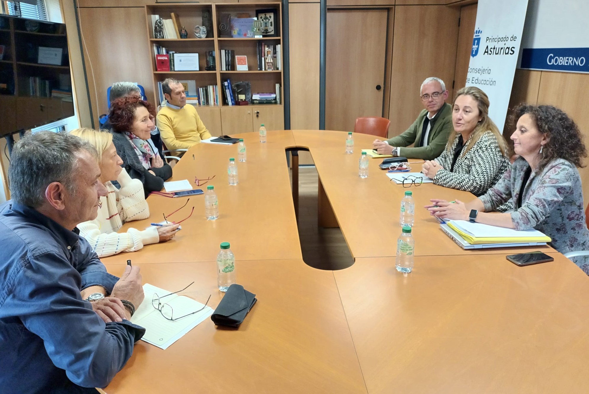 Pie de foto: de izquierda a derecha, la representación de la ejecutiva de la Federación Asturiana de Concejos formada por los alcaldes de Gozón, Jorge Suárez; de Noreña, Amparo Antuña; de El Franco, Cecilia Pérez; de Illas, Alberto Tirador, y de Cangas de Onís, José Manuel González. Y enfrente, la consejera de Educación, Lydia Espina, flanqueada por los directores generales de Infraestructuras y Tecnologías Educativas, Julio Vallaure, y de Centros, Red 0-3 y Enseñanzas Profesionales, Eva Ledo.