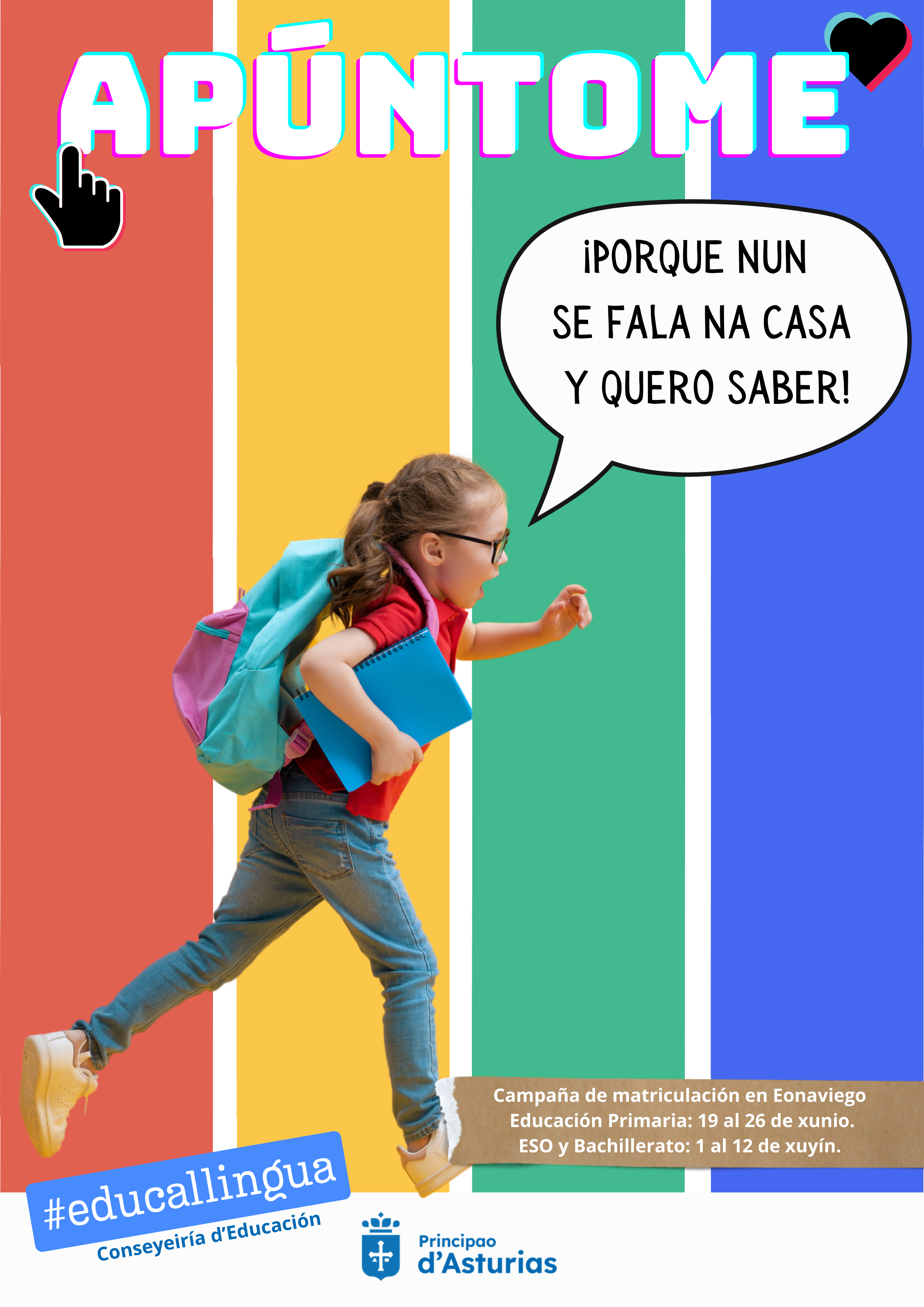 Esta campaña responde el compromiso da Conseyeiría d’Educación en promover el uso, a difusión y el enseño del asturiano y el eonaviego, en cumprimento da Llei 1/1998, del 23 de marzo, ademáis de potenciar a pluralidá llingüística y cultural del Principao.